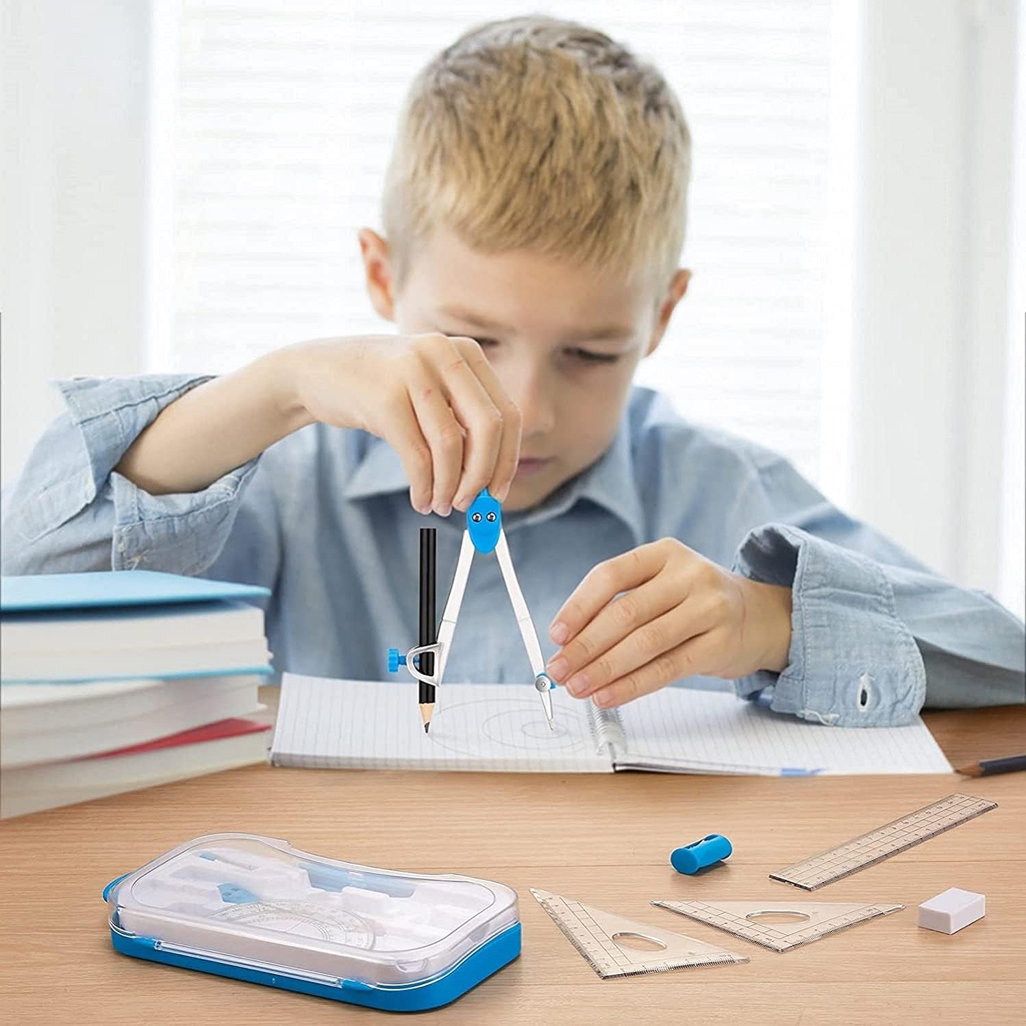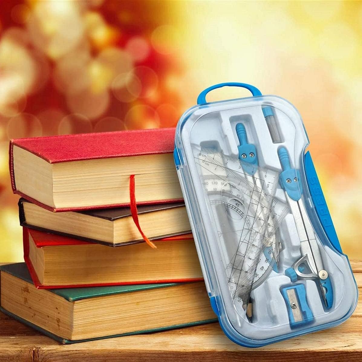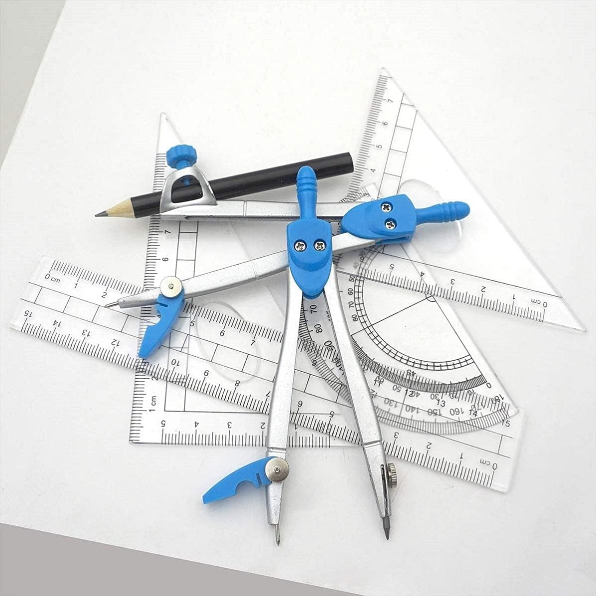 ✅ 【Strumenti completi】 10 pezzi inclusi: 2 * bussola, 1 * goniometro, 1 * squadra (30°/60°), 1 * squadra (45°), 1 * righello, 1 * nucleo della penna della bussola, 1 * gomma, 1 * matita, 1 * temperamatite. Questo set è adatto a persone diverse. Facile da trasportare: tutti gli strumenti di cancelleria sono divisi in una scatola e classificati. La scatola con fibbia di sicurezza è di piccole dimensioni, leggera e molto facile da trasportare. ✅ 【Copertura trasparente della bussola】 Il guscio in plastica protegge e conserva tutti gli strumenti in un unico posto nello zaino o sulla scrivania per un facile trasporto e stoccaggio. Una scelta pratica per insegnanti e studenti. Il colore trasparente consente di vedere parole, lettere e numeri sulla pagina attraverso il goniometro. ✅ 【Ampia gamma di applicazioni】: aiuta gli studenti a comprendere la geometria con questi set matematici essenziali per disegnare e misurare linee, angoli e cerchi. Ideale per l'uso a scuola, nella lavorazione del legno, in officina o a casa, il miglior strumento per disegnare cerchi per studenti, artisti, matematica, falegnameria per la lavorazione del legno, carpenteria, lavorazione dei metalli, ecc. Questo kit di geometria viene fornito con goniometro, compasso, piccoli righelli, matita, gomma, set quadrato, 1 piccola scatola di ricambio da 2 mm per la bussola non a matita. Lo stile del blocco di gomma è perfetto per entrare negli angoli più piccoli o cancellare rapidamente aree di grandi dimensioni. Questo astuccio trasparente è un must per gli studenti.