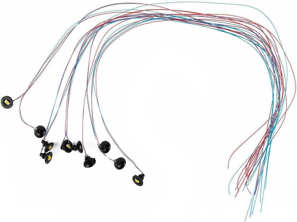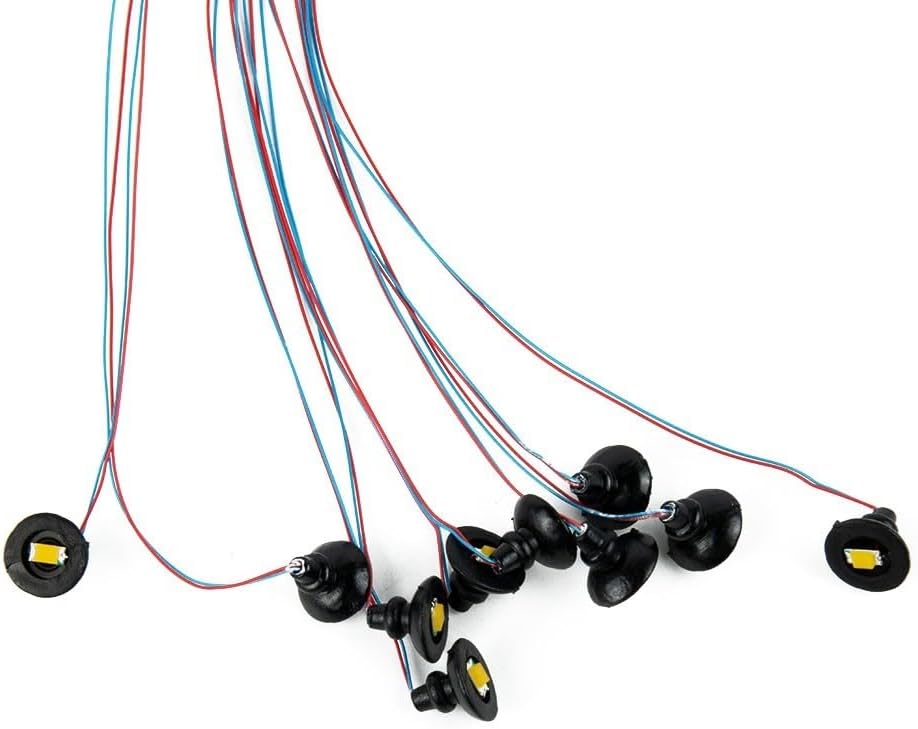 Completo di cavi e LED: questi lampioni sono dotati di fili e LED, che consentono di accenderli facilmente. Luce bianca calda: il colore della luce predefinito di queste lampade è bianco caldo, creando un'atmosfera accogliente e invitante. Tensione di funzionamento adatta: queste lampade funzionano a una tensione di 3 V DC, prestazioni sicure ed efficienti. Bassa corrente di funzionamento: ogni luce consuma solo 20 mA di corrente, con conseguente funzionamento a risparmio energetico. Dimensioni compatte: con un diametro del disco di 6 mm, questi lampioni sono adatti per layout in scala HO e possono adattarsi perfettamente alla configurazione del modello.