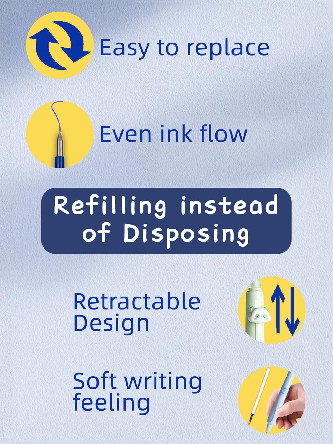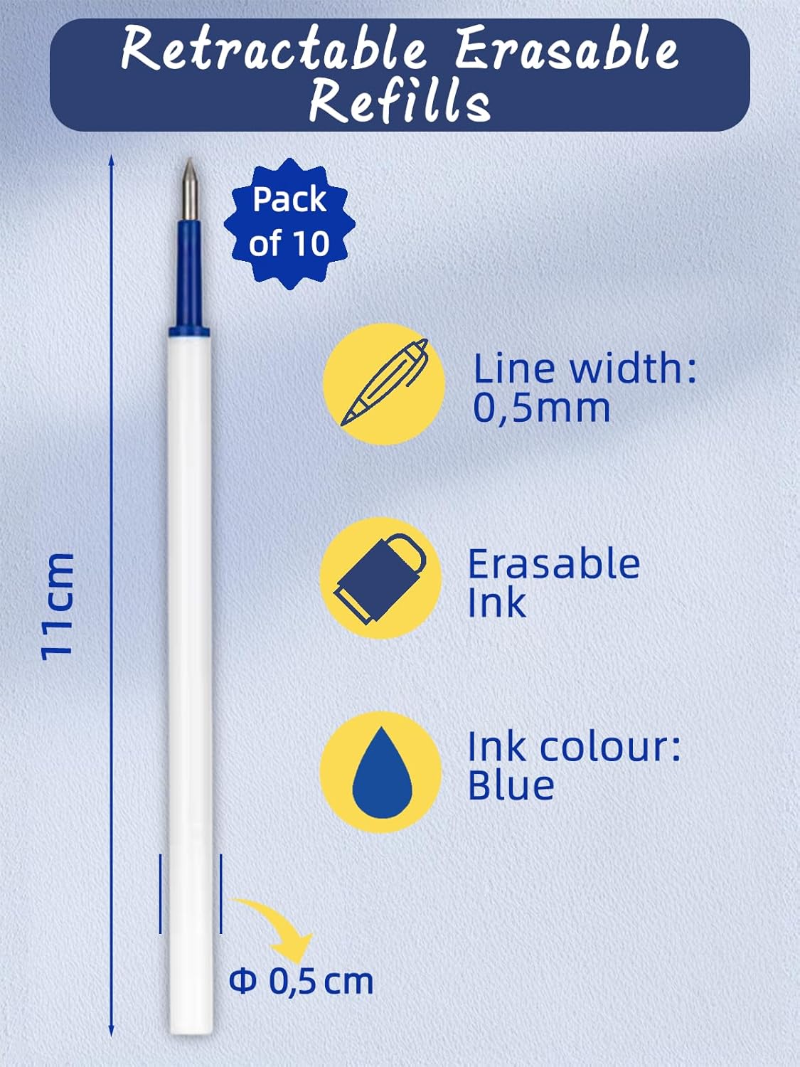 [10 pezzi Ricariche Cancellabili a Scomparsa] Ricariche cancellabili a scatto da 0,5 mm, 11 cm, colore Blu. Compatibili con penne gel a scatto cancellabili di KCatsy. [ Asciugatura Rapida ] Punta conica in acciaio inox resistente alla pressione, 0,5 mm, scrittura fluida, erogazione ottimizzata dell'inchiostro e asciugatura rapida per evitare fastidiose sbavature. [ Contenuto Massimo di Inchiostro ] Volume massimo, 80% del contenuto di inchiostro, lunghezza di scrittura 400 m [ Cancellabili ] Penna roller a scatto cancellabile. Le mine di ricambio per penne cancellabili a scatto sono ideali per imparare a scrivere e sono pratiche per l'uso quotidiano e in ufficio. [Regalo Perfetto] Che si tratti di bambini, studenti, insegnanti, amici, colleghi o familiari, questi sono un'ottima scelta per compleanni, festa dei bambini, Natale o occasioni di ritorno a scuola