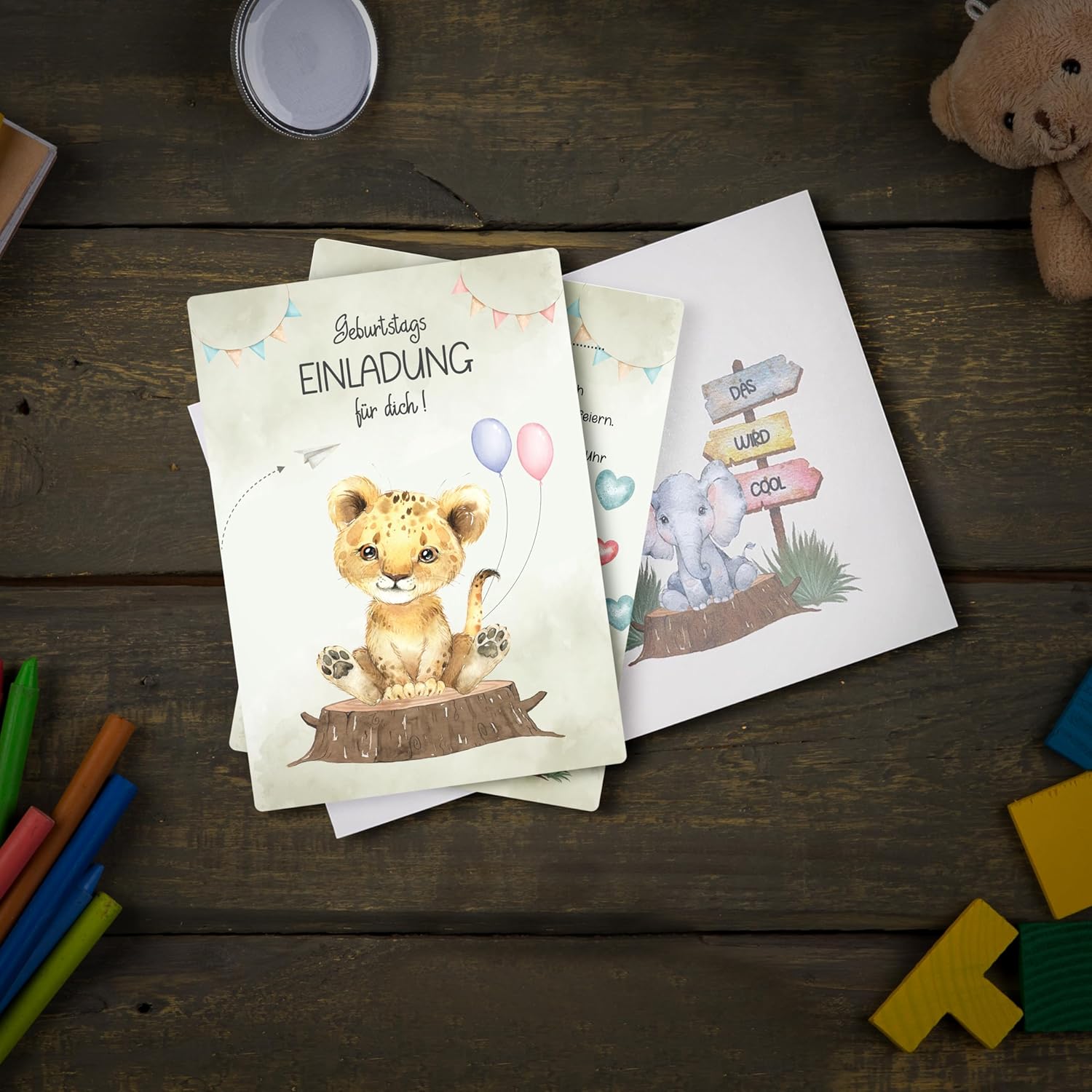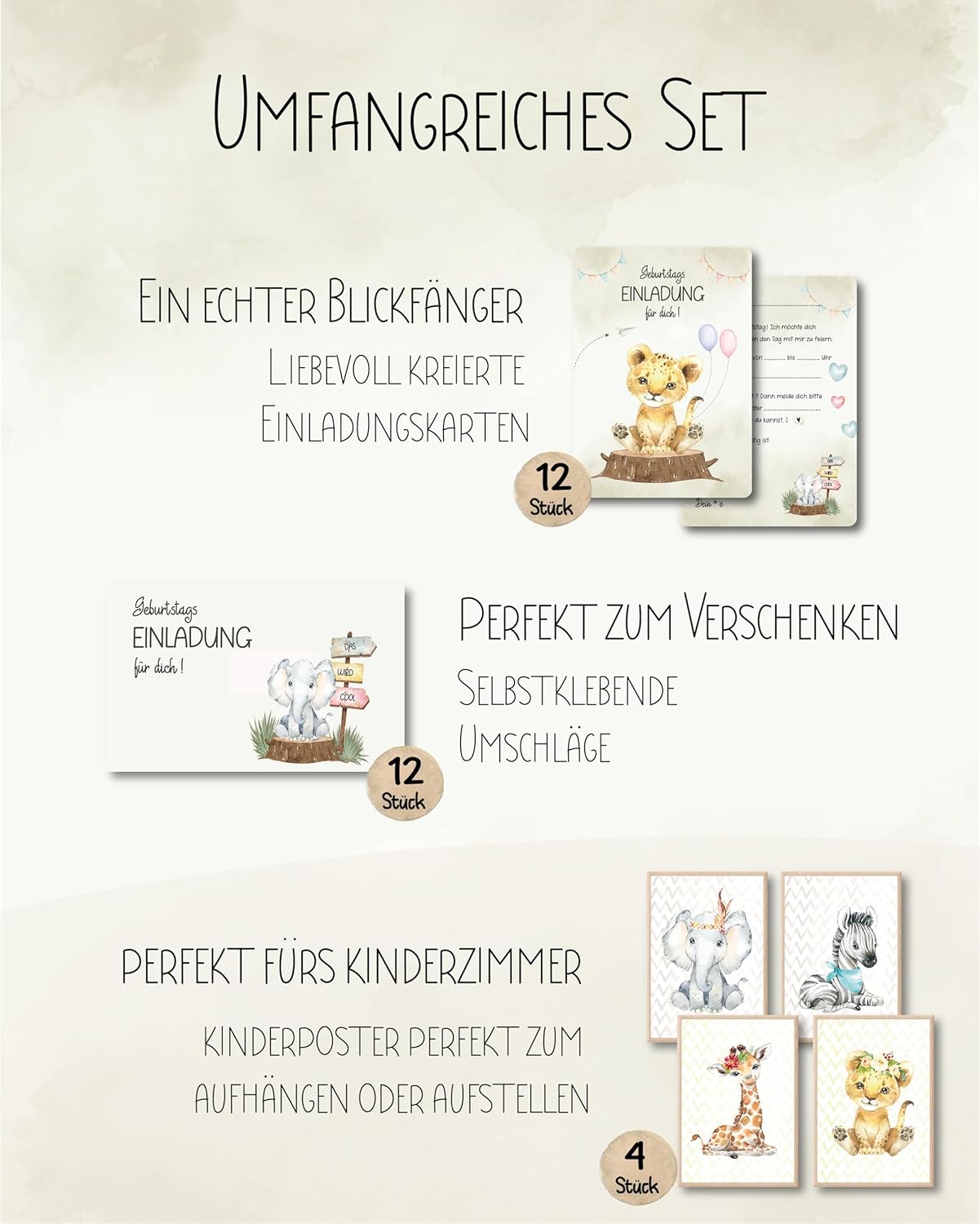 Amorevoli inviti di compleanno: nel set sono inclusi 12 biglietti di invito in formato DIN A6 e 12 buste autoadesive abbinate. Inoltre è incluso un set di poster per la cameretta dei bambini da appoggiare o appendere. Unico: animali giocosi e belle piante decorano ogni singolo biglietto e insieme formano un set creativo e coordinato per ragazzi e ragazze. L'invito perfetto per ogni festa di compleanno per bambini. Lavorazione di alta qualità: i biglietti d'invito sono realizzati in cartone rigido e ben scrivibile (350 g) con angoli arrotondati e oggetti rifiniti con vernice trasparente. I poster sono realizzati in robusta carta fotografica (300 g). L'accessorio perfetto per feste Made in Germany. RISPARMIA TEMPO: i campi con le informazioni più importanti sono predefiniti e devono solo essere compilati. La compilazione degli inviti diventa un gioco da ragazzi e richiede solo pochi minuti con qualsiasi penna. Pensato a tutto: con i 12 bellissimi inviti per feste in formato cartolina, tutti i bambini, amici e amici saranno alla tua festa di compleanno! I biglietti possono essere facilmente distribuiti come regalini nella cerchia di amici, a scuola, in kita o in associazione