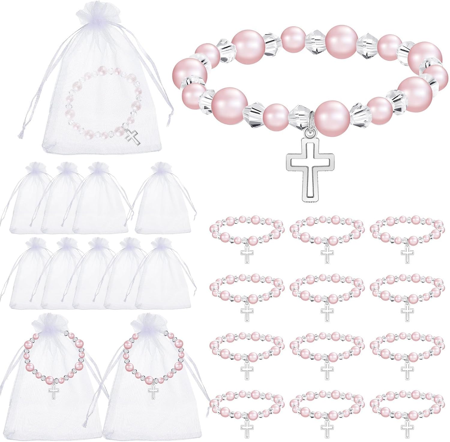 Progettato per elevare cerimonie battesimali, addio al nubilato, riunioni di Pasqua e feste di compleanno, ogni braccialetto funziona come decorazione indossabile che è passata senza soluzione di continuità dal rituale religioso alla celebrazione delle celebrazioni Squisitamente realizzato con ciondoli a forma di crocifisso cavi e perle finte lucide, questo set arriva in eleganti sacchetti di organza, perfetto come regalo significativo per feste o ricordi religiosi per battesimi, matrimoni e celebrazioni Simboleggia la fede e la femminilità, il set funge anche da gioielli spirituali e accenti decorativi per eventi, con braccialetti impilabili che creano look personalizzabili per cerchi di preghiera o ensemble di feste degne di foto Ideale per gruppi, feste nuziali e ospiti in cerca di regali, questi versatili braccialetti servono sia persone attente alla moda che organizzatori di eventi spirituali che necessitano di un regalo premuroso per gli ospiti Le perline mantengono una finitura liscia, simile a perle mentre gli intricati ritagli a crocifisso creano motivi delicati, combinando durata con un design sofisticato per una lunga durata