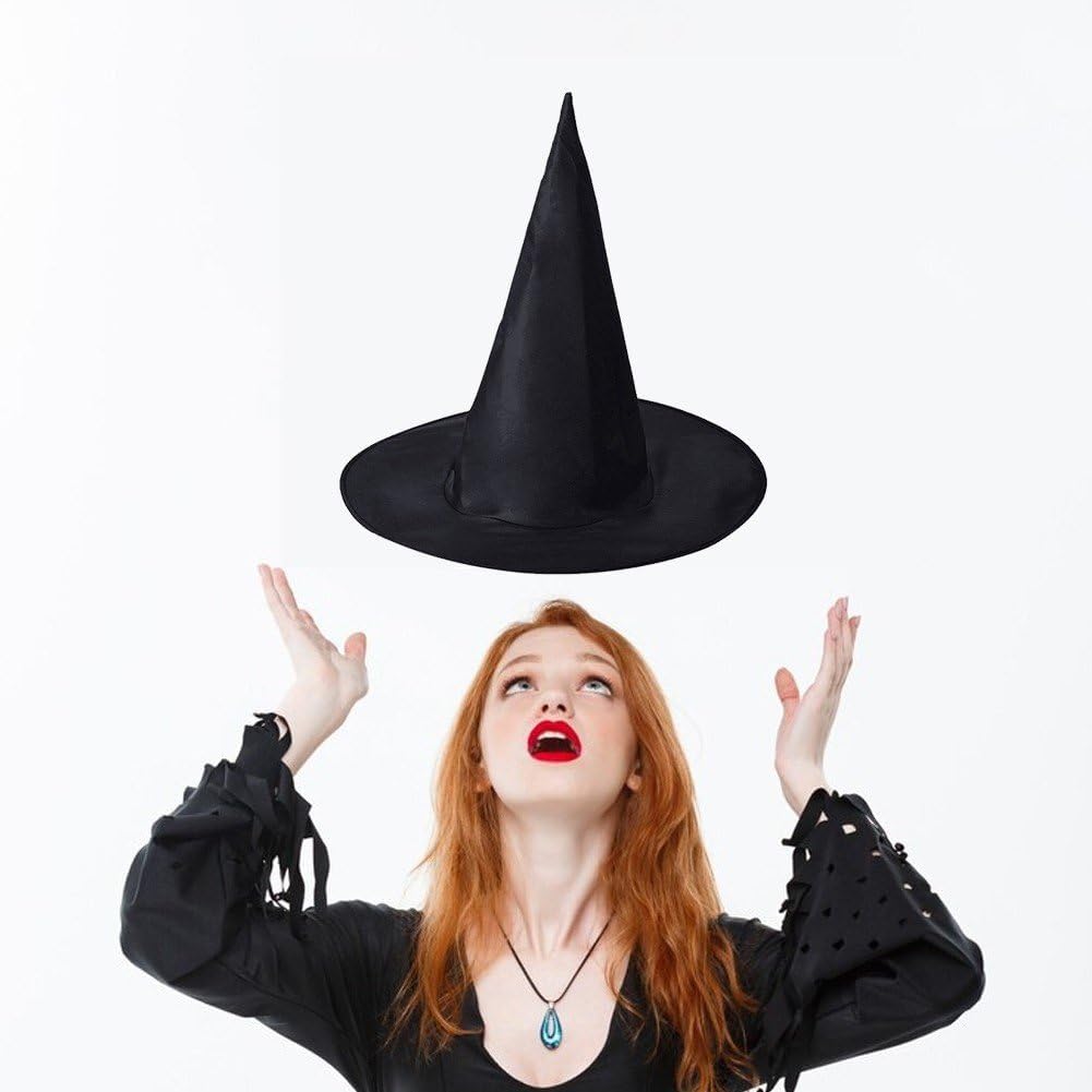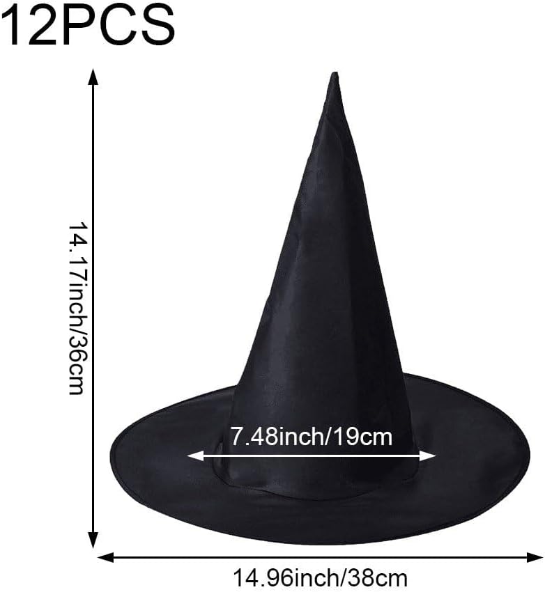 Dimensioni: ogni cappello da strega è alto 34 cm/13,4 pollici con un diametro esterno di 38 cm/13,8 pollici, taglia unica adatta alla maggior parte delle persone. Materiale di qualità: il cappello da strega di Halloween è realizzato in tessuto Oxford di qualità, leggero, non facile da rompere da indossare, adatto per l'uso quotidiano, abbastanza resistente da servire ai tuoi usi ripetuti. Quantità sufficiente: ogni confezione contiene 12 cappelli da strega di Halloween di colore nero, sufficienti per la tua festa di Halloween o da condividere con i tuoi cari, familiari, ospiti e altro ancora. Design pieghevole: la tesa del cappello è morbida e retrattile, la tesa del cappello può essere piegata e ruotata, il che consente di piegarla per riporla, risparmiando spazio comodo da trasportare. Forniture per feste di Halloween: questi cappelli da strega finemente realizzati possono essere utilizzati per feste di Halloween, carnevale, carnevale, balli in maschera e altri per migliorare la tua festa, rendendola piena di divertimento e lasciando i tuoi ospiti completamente impressionati.