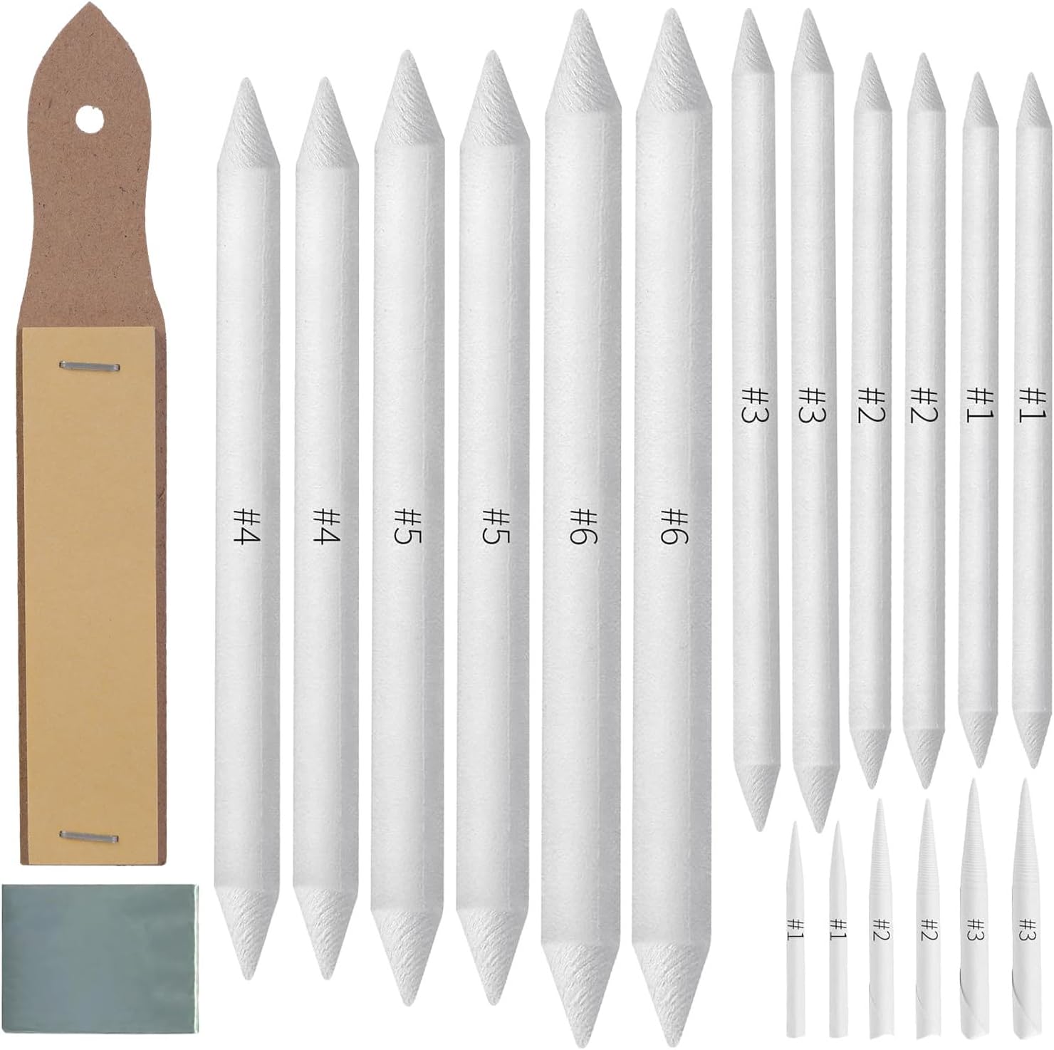 La confezione 1 include: 6 pezzi di ceppi per miscelare a doppia estremità. 6 tortillioni. La confezione 2 include: 12 pezzi di ceppi di miscelazione, 6 tortillioni con gomma impastata carta vetrata Set di strumenti per schizzi artistici, per realizzare disegni artistici. bambino, studenti, artisti, pittori, hobbisti, Questi ceppi di miscelazione e tortillions sono appositamente progettati per mescolare colore, sbavature, linee ammorbidenti, ottenere un effetto nebbioso, creare ombre e aree scure, aggiungere un effetto debole e luminoso e levigare, carbone, gesso e disegno a matita Realizzato con carta morbida compressa, densa e stretta, non facile da rompere e deformare. Crea facilmente un effetto gomma senza danneggiare il disegno Tortillions di diverse dimensioni: #2; #3. 6 misure di miscelazione: #01; #02; #03; #04; #05; #06. Soddisfa facilmente varie esigenze di schizzi creativi e disegni artistici