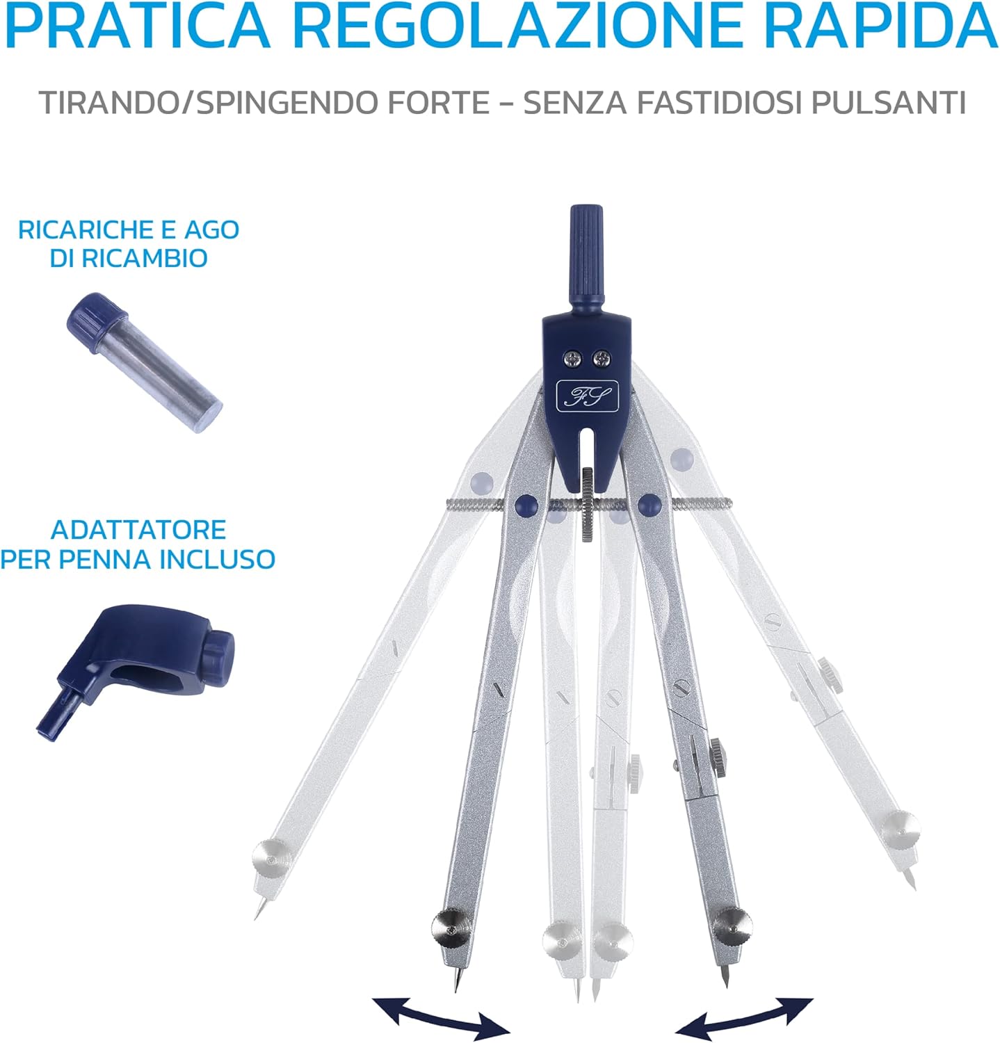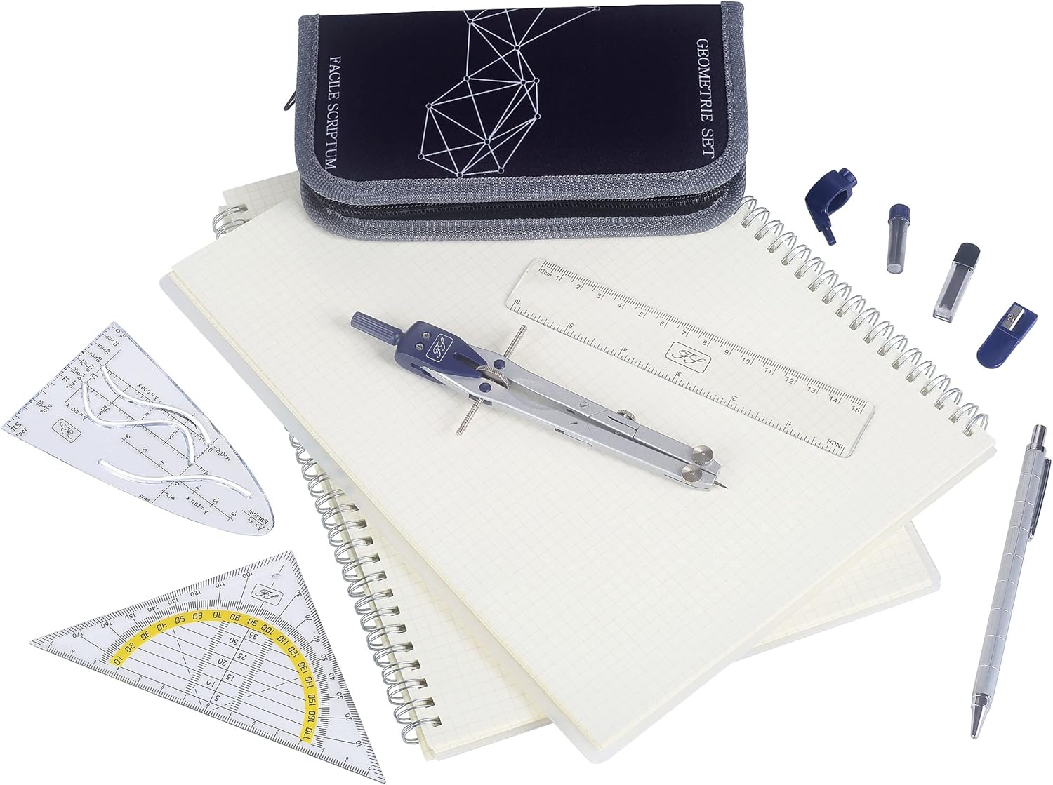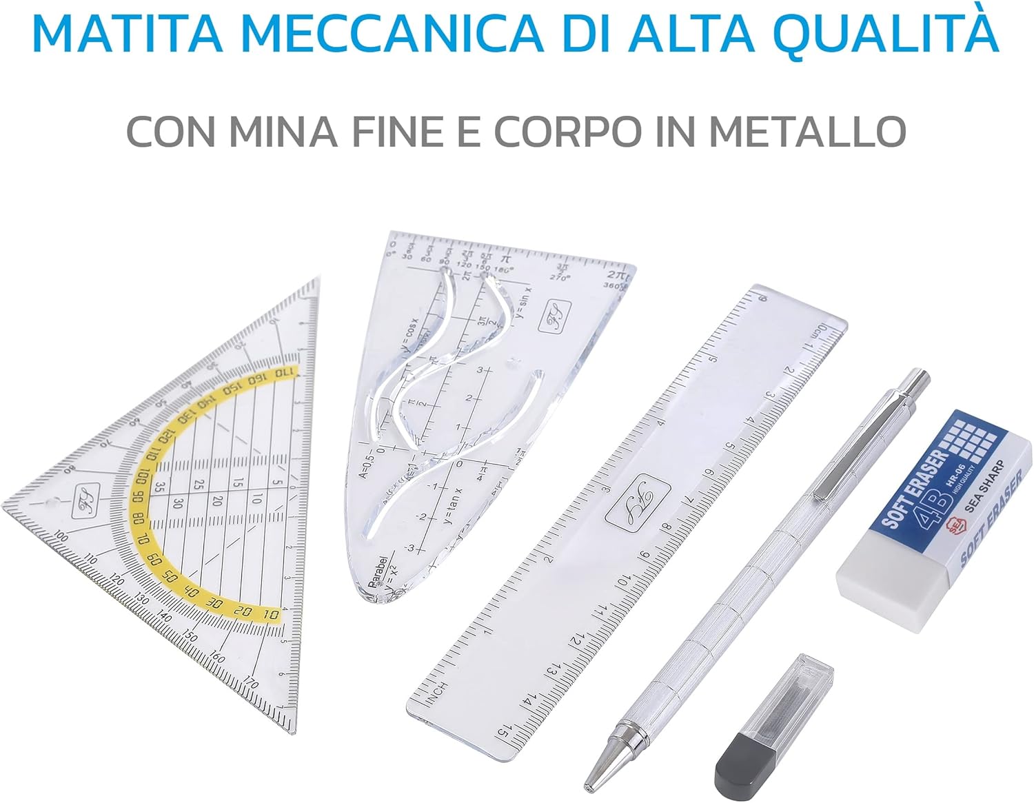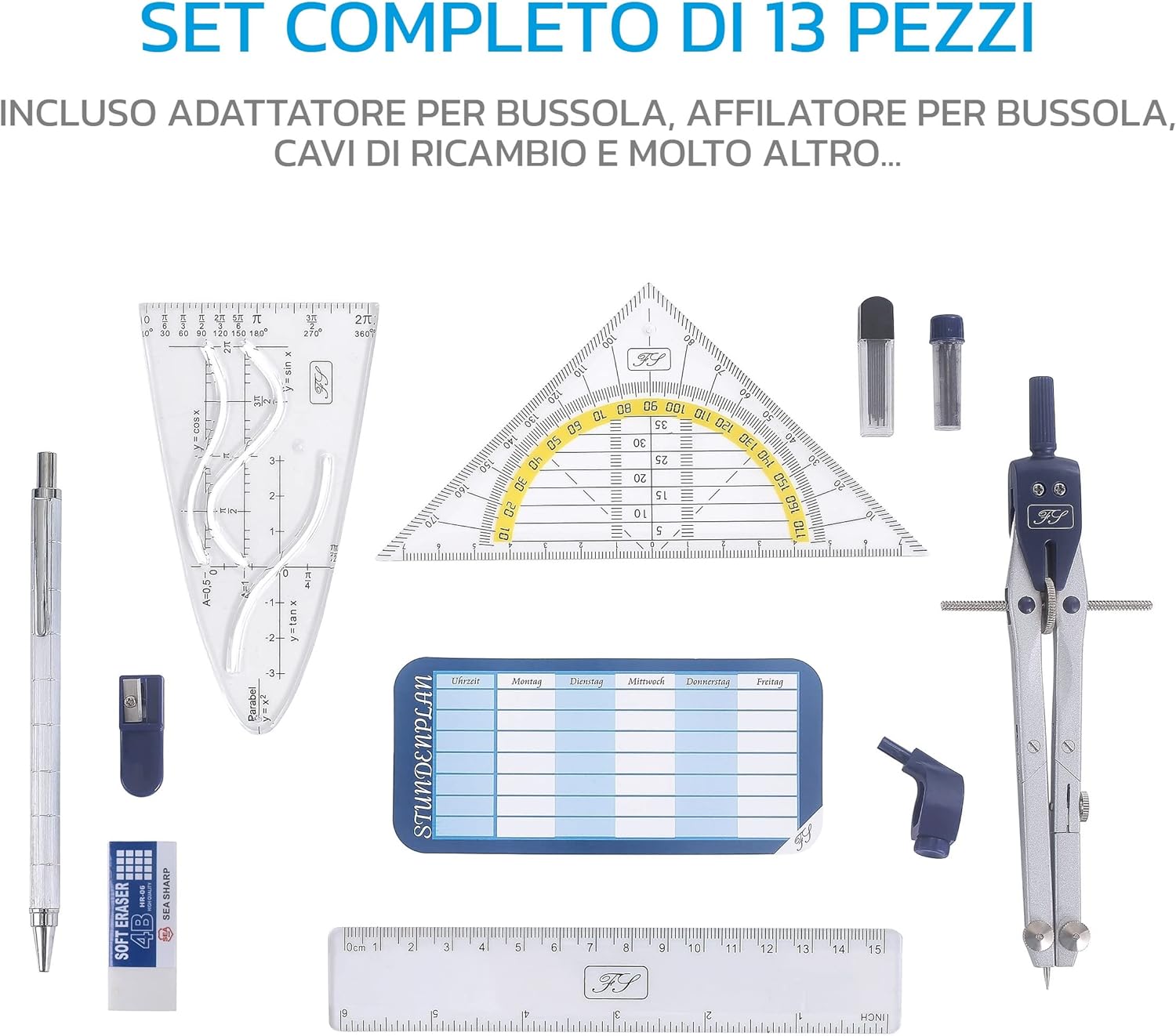 Set completo: set da 13 pezzi composto da astuccio, compasso, squadra, righello, matita meccanica, stencil funzionale, gomma, mine di ricambio per matite, temperamatite per mine, ago di ricambio per compasso, adattatore per altre penne (ad esempio fineliner) e un orario scolastico. Pratica regolazione rapida: il nostro compasso offre una pratica regolazione rapida senza fastidiose leve e una gamba regolabile. Include anche un ago di ricambio e mine di ricambio Matita fine di alta qualità: matita in plastica? Non con noi! Il nostro portamine è realizzato in metallo robusto ed è quindi molto più resistente rispetto alle penne in plastica. Pratica custodia: tutti gli articoli del set possono essere riordinati dopo l'uso e ben protetti nel nostro astuccio pieghevole con elastici e chiusura per riso. nan Ti promettiamo il rimborso completo del tuo prezzo di acquisto se non possiamo risolvere il tuo problema. Scrivici un messaggio!