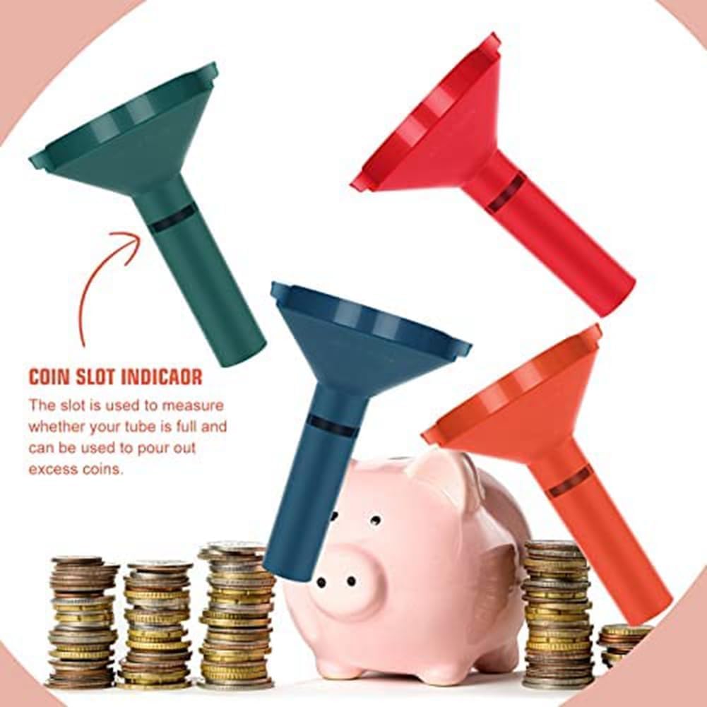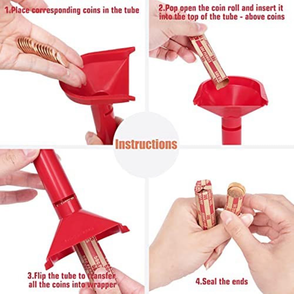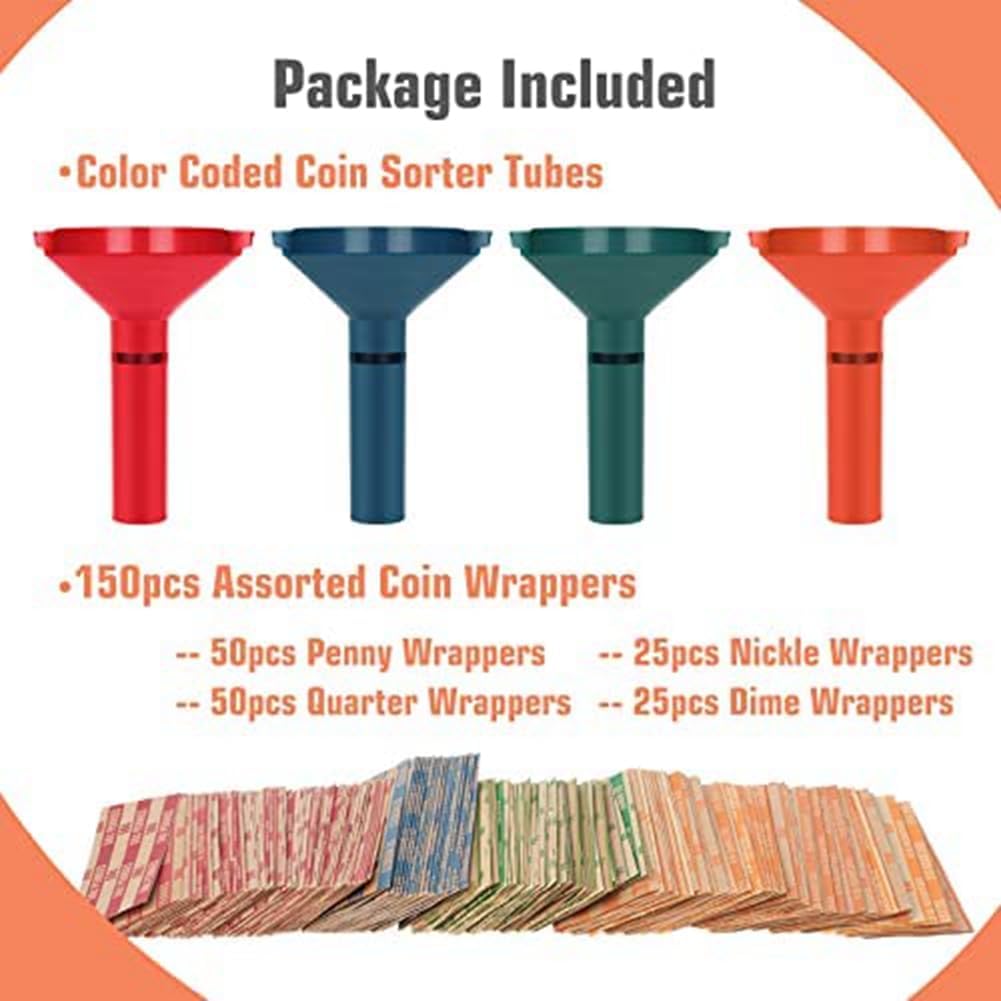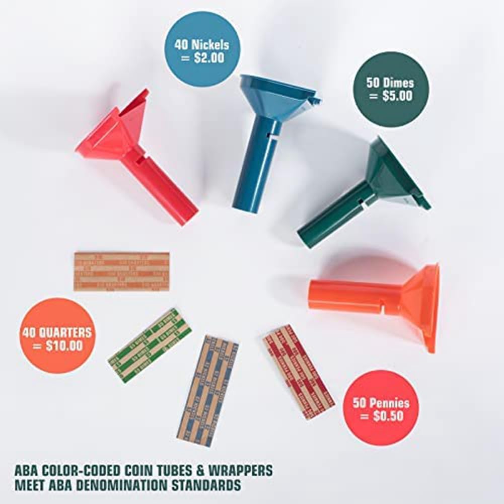 Il tubo per monete e il monopattino sono progettati in 4 colori per abbinare i colori della : imbuto arancione e involucro sono per quarti di dollari, verde per dimes, blu per nichel, rosso per penny Riceverai 4 tubi per monete in plastica contrassegnati con colori e 150 diversi cartellini, distribuiti in confezioni da 50 rotoli da quarti, 50 rotoli penny, 25 rotoli Dime e 25 buste in nichel Basta far cadere le monete nell'imbuto e inserire la per monete nella parte superiore della confezione con contatori di monete e raccoglitori di monete. Capovolgere il raccoglitore per monete in modo che le monete entrino nelle buste delle monete e arrotolare le estremità. Molto facile da ordinare e ordinare avvolgere le monete C'è una fessura di visualizzazione sui tubi organizer per monete che viene utilizzato per misurare se le monete sono nella giusta quantità e che può essere utilizzato per monete in eccesso, rendendo il rotolamento delle monete più veloce, più facile e preciso. I nostri tubi per contatori sono realizzati in materiale plastico di alta qualità, durevole e , e i nostri per rotoli sono realizzati in carta di alta qualità, facile da usare