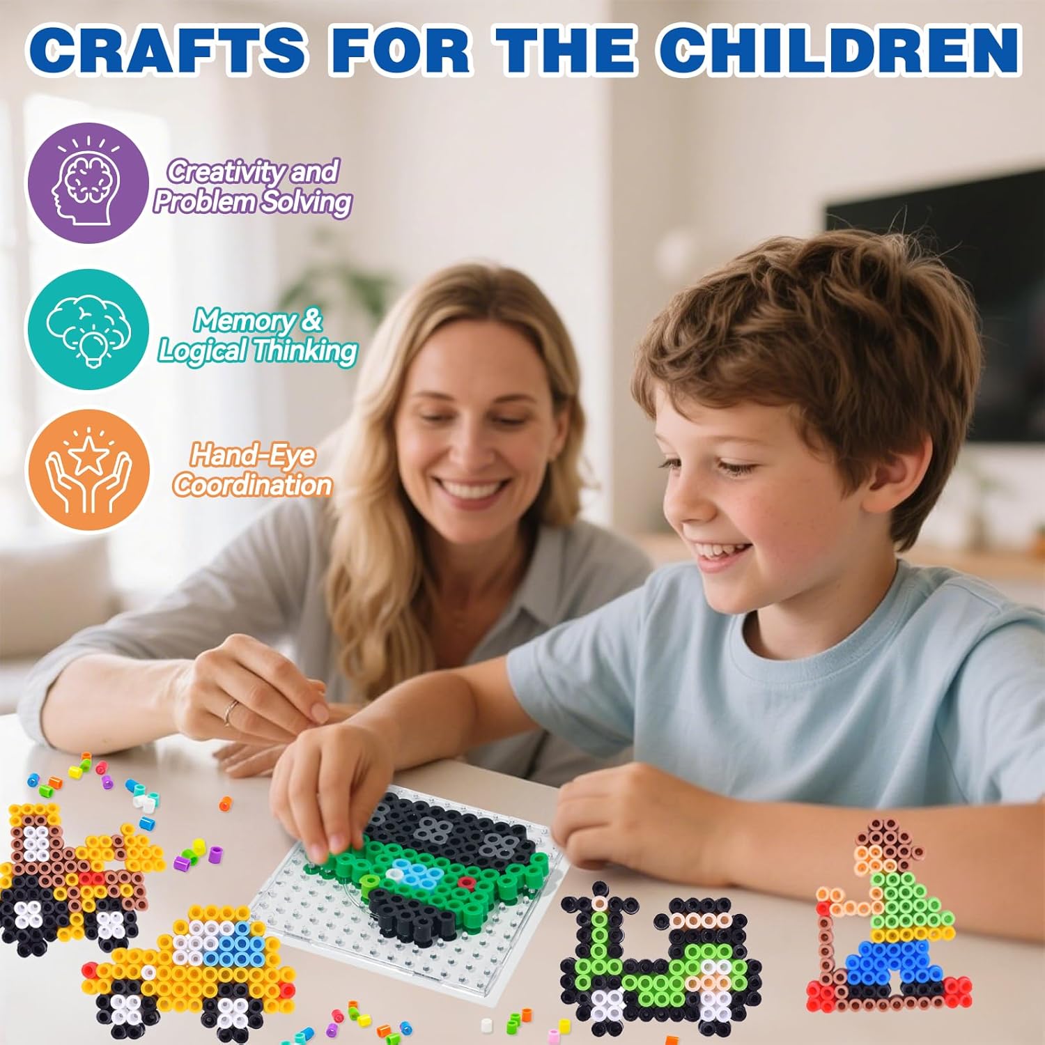 Contenuto del prodotto: grande set di perline da stirare con molti accessori: 1500 perline (10 mm) in 12 colori, 15 stencil con motivi a forma di veicolo, 1 lavagna quadrata trasparente, 10 magneti per frigorifero, 5 portachiavi colorati, 5 anelli da stiro, 5 cordini, 10 fogli di carta da stiro e 10 chiusure per lanterne. Perline XL oversize, Adatto per 3 anni. Bambini per il fai da te creativo. 15 modalità di trasporto: il set di perline da 10 mm contiene 15 motivi unici nel traffico, tra cui veicoli dei pompieri, auto della polizia, aerei, missili, ambulanze, macchine edili e molto altro ancora. I bambini possono creare i propri modelli di traffico, che promuovono creatività, concentrazione e immaginazione. Ottimo per promuovere l'espressione artistica e il lavoro di squadra nelle attività di gruppo. Adatto per bambini dai 3 anni in su: questo set per bricolage è realizzato con perline in polietilene ecologico di alta qualità, perfette per bambini dai 3 anni in su. Queste perle non contengono sostanze chimiche nocive e le loro proprietà sicure e atossiche offrono un ambiente di gioco a basso rischio per i bambini. Grazie al grande design XL, queste perline sono facili da impugnare anche per le mani piccole e aiutano a migliorare le capacità motorie e la coordinazione occhio-mano. Regalo perfetto: questo set di perline da 10 mm è perfetto per regali, feste di compleanno per bambini, vacanze o per il tempo libero – anche Natale e Pasqua sono un grande divertimento fai da te – sia per una ragazza che per un ragazzo, il vostro bambino lo adorerà Multifunzionale: sia per il gioco creativo, per feste di compleanno, a scuola o a casa, questo set di perle è particolarmente adatto per le attività di gruppo. È perfetto per un ambiente sociale ed educativo in cui i bambini possono lavorare in squadre, condividere la loro creatività e imparare a creare qualcosa insieme. Istruzioni per la stiratura: coprire le perline con carta da stiro e riscaldare il ferro da stiro a livello medio. Stirare con movimenti circolari per 30-60 secondi fino a quando le perle si sciolgono. Una volta che le perline si sono leggermente raffreddate, rimuovere il motivo dall'inserto e premere per 2 minuti con un oggetto pesante per evitare deformazioni. Importante: per evitare scottature, si prega di stirare sotto la supervisione di un adulto