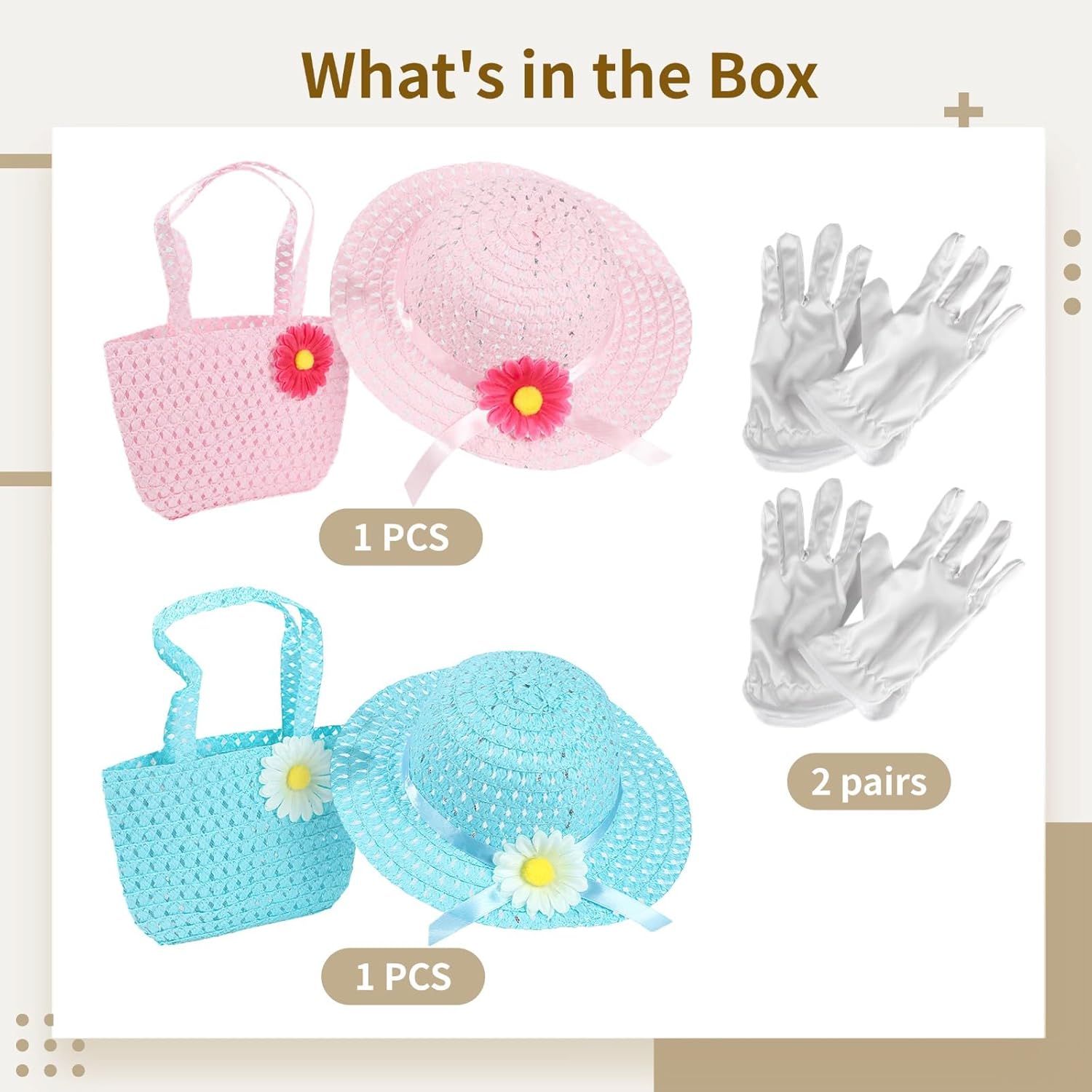Colore: rosa+blu Materiale: paglia Dimensioni dell'imballaggio: 9,8 × 9,8 × 4,17,8 cm. La confezione include: 2 cappello, 2 borsette, 2 paia di guanti. Nota: - Si prega di fare riferimento alla misura. Si prega di considerare un piccolo margine di errore nelle misure. - Potrebbe esserci una piccola differenza di colore a causa del monitor, della fotocamera o di altri fattori, si prega di fare riferimento all'articolo fisico.