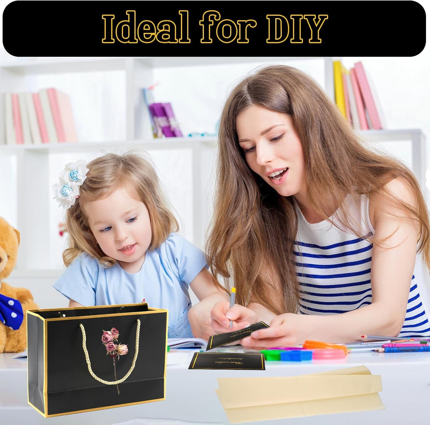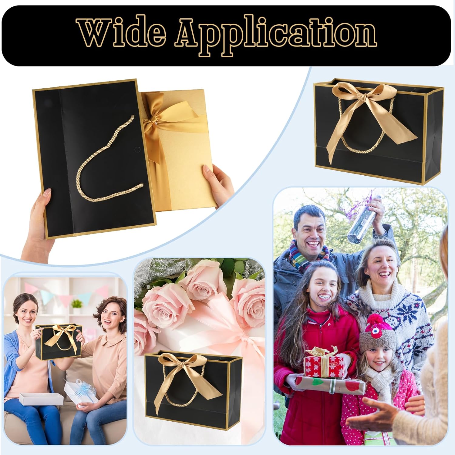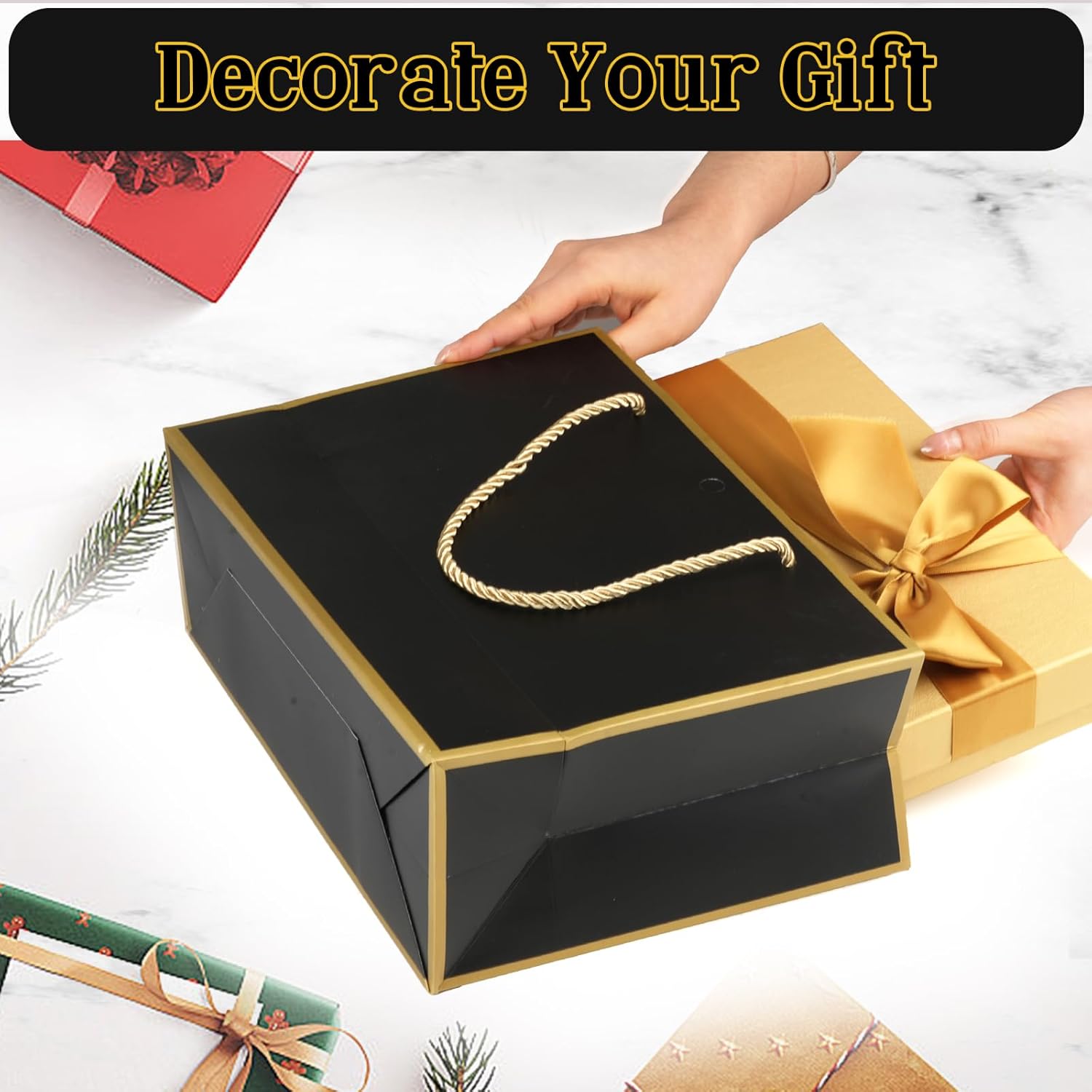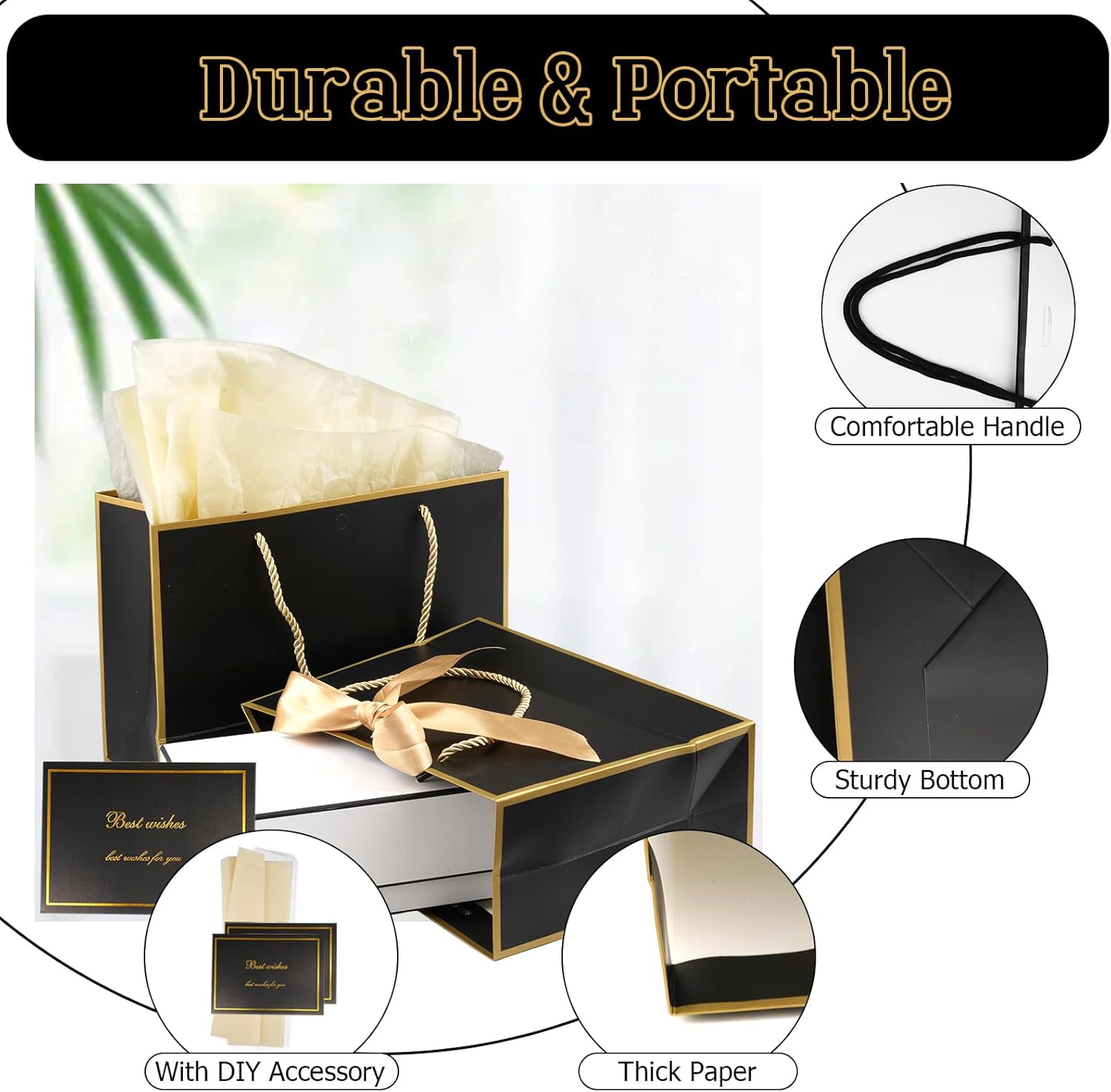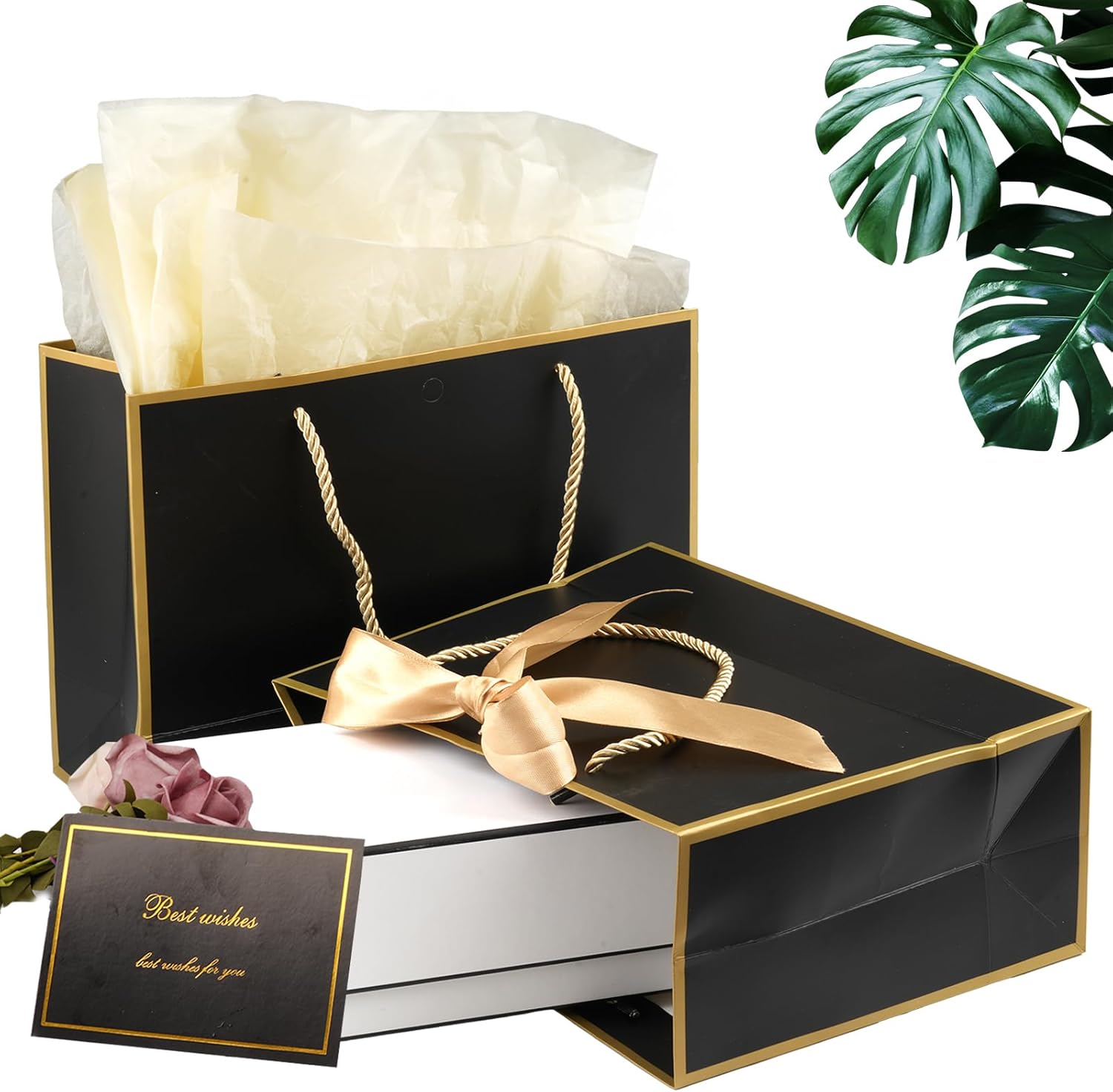 【SET BORSE REGALO】 Riceverai 2 sacchetti regalo (dimensioni: 28x20x10 cm), 2 biglietti di auguri (dimensioni: 9x13 cm) e 5 carta velina (dimensioni: 50x35 cm). I sacchetti regalo possono essere utilizzati per riporre piccole scatole regalo, adatte per compleanni, feste, matrimoni, ecc. e pratici per fare regali.,ROBUSTI E DUREVOLI: i sacchetti regalo sono realizzati in carta patinata ispessita e sono durevoli, non facili da deformare e riutilizzabili. Con la base rettangolare, i sacchetti regalo sono stabili e facili da configurare 【IDEALE PER IL FAI DA TE】 Il sacchetto regalo è nero, con finiture dorate, puoi realizzarlo fai-da-te secondo le tue preferenze; Quindi scrivi i tuoi auguri e le tue benedizioni sul biglietto e infine decora il sacchetto regalo con carta velina per fare un regalo speciale.,SACCHETTI DI CARTA CON MANIGLIA: Il sacchetto regalo è dotato di un manico, quando si fanno regali, è facile da trasportare. È anche comodo da portare con sé per amici o familiari quando ricevono il regalo.,Ampia applicazione: i sacchetti regalo sono adatti per confezionare la maggior parte delle scatole regalo (dimensioni inferiori a 28 x 20 x 10 cm). I set di sacchetti regalo sono perfetti per vacanze, San Valentino, festa della mamma, Natale, anniversari, compleanni, abiti da sposa e altre occasioni regalo
