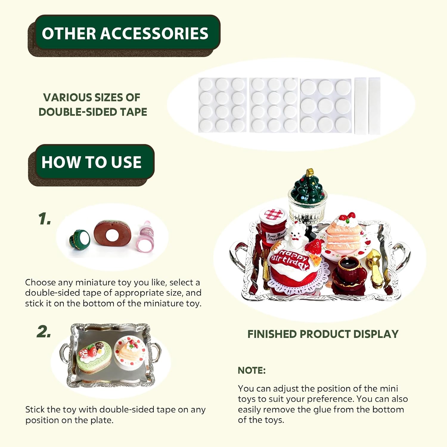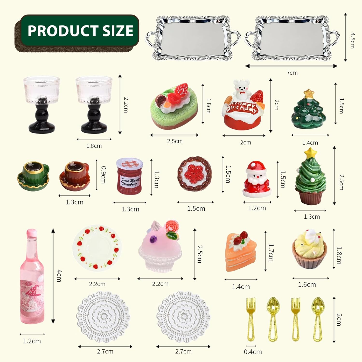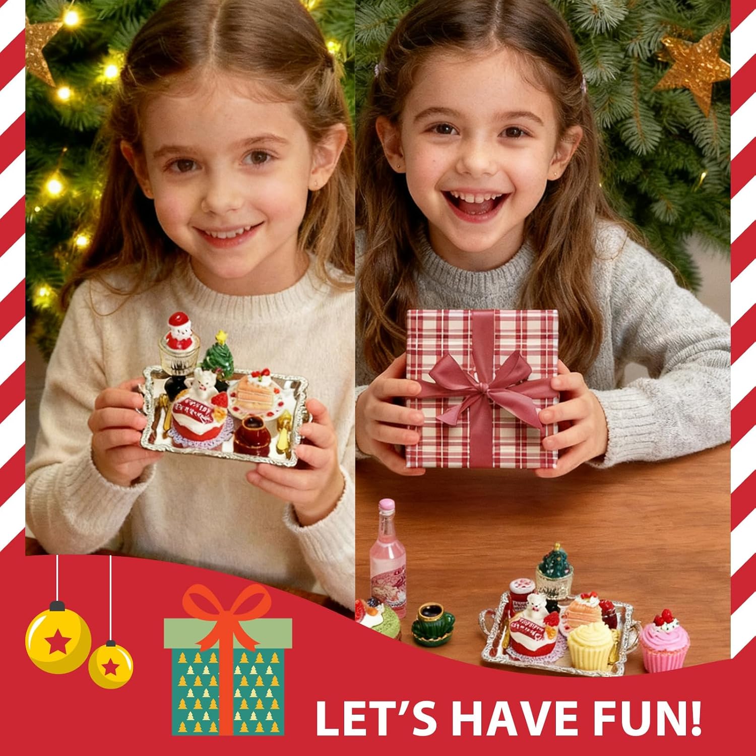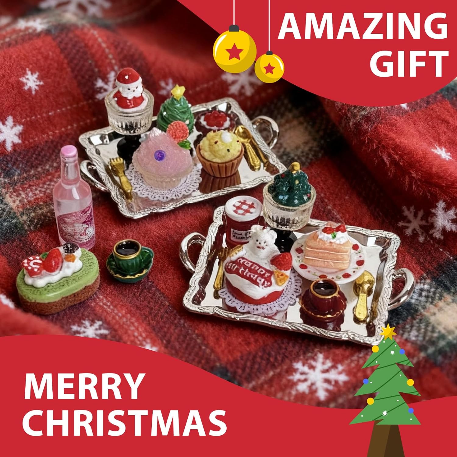 【Set Completo di Miniature】Include 24 accessori di Natale in miniatura: calici, Babbo Natale, albero di Natale, gelati, torte, frutta, caffè, marmellata, posate in metallo, piatti, tovagliette e vassoi argentati, con punti adesivi inclusi. 【Mini Decorazioni Natalizie】Perfetto per decorare la casa delle bambole o creare un paesaggio natalizio in miniatura. I bambini possono combinare liberamente i pezzi, sviluppare creatività e realizzare una scena di Natale unica e divertente. 【Materiali di Alta Qualità】Realizzato in resina e lega durevoli, con colori vivaci e dettagli realistici. Le miniature di cibo natalizio e i vassoi argentati sono resistenti e ideali per decorazioni natalizie casa o regali creativi. 【Gioco Educativo e Creativo】Ideale per il gioco educativo e l’interazione genitore-figlio. Aiuta i bambini a migliorare la manualità e la fantasia mentre decorano la loro mini cucina o casa delle bambole con addobbi natalizi. 【Idea Regalo di Natale】Un set di miniature di Natale adorabile e originale, perfetto come regalo per bambini, amici o collezionisti. Crea subito un’atmosfera natalizia in casa o nelle feste, portando gioia e sorpresa.