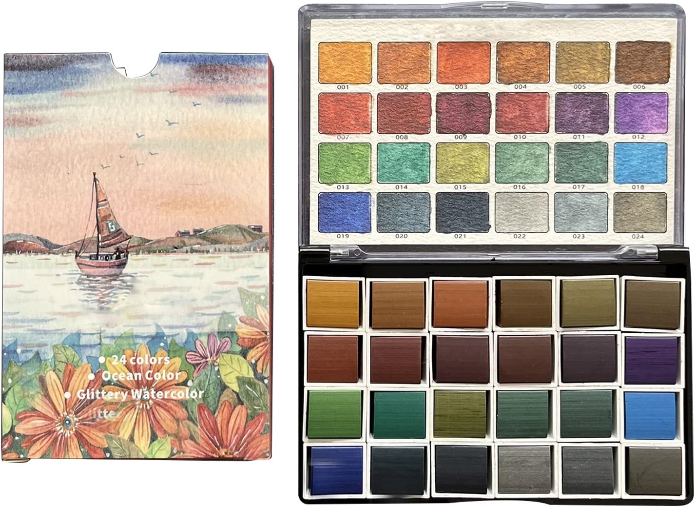 Ben progettato. Piccole scatole per dipingere singolarmente, tutte ben organizzate nella scatola di ferro. Compatto e portatile. La sua consistenza liscia si asciuga per una finitura audace, scintillante e brillante, ed è perfetta con pennello e spugne per diversi effetti sorprendenti pigmento solido acquerello, non tossico e sicuro, perfetto per vacanze, compleanno, per studenti, principianti. Molto adatto per incoraggiare la passione dei bambini per le arti e Colore perlato brillante. 24 colori perlati glitterati, la vernice ad acquerello ha un alto grado di colorazione, che sarà più brillante sotto una forte luce. Sia su carta bianca che nera, è molto piena di colore e fornisce un effetto brillante scintillante Vernice ad acquerello glitterata. Questi colori ad acquerello metallici professionali sono perfetti per tutti i pittori, principianti, artisti, studenti e bambini pittura artistica, artigianato CARATTERISTICHE. La polvere di vernice è stata macinata finemente, solubilità rapida in acqua, grande diffusione, colore uniformemente miscelato, elevata resistenza alla luce e alta saturazione. Può essere facilmente miscelato con altri colori per effetti unici. Un set di pittura essenziale per artisti, che è un grande aiuto per aggiungere e brillare le loro opere d'arte