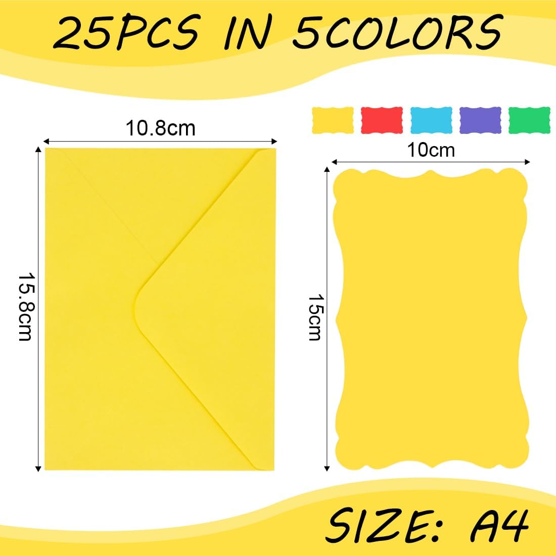 Colori intensi, ampia scelta: Contiene 5 colori brillanti, per un totale di 25 set, per soddisfare le esigenze cromatiche di diverse situazioni, che si tratti di auguri natalizi, messaggi aziendali o creazioni artigianali, puoi trovare i colori adatti per aggiungere risalto visivo al contenuto Adattamento alle dimensioni, design raffinato: Formato busta 15,8 cm × 10,8 cm, biglietto 15 cm × 10 cm, formato A4. Le specifiche sono adatte per la scrittura e la stampa di contenuti comuni. L'esclusivo design del biglietto con bordo ondulato è allo stesso tempo bello e riconoscibile, il che esalta la raffinatezza del supporto informativo Materiale affidabile, sigillato e impermeabile: Realizzato in cartone di alta qualità, spessore moderato, scrittura scorrevole e impermeabile; La busta è dotata di una chiusura impermeabile, che la rende efficacemente resistente all'umidità e alla caduta dopo la sigillatura, garantendo la sicurezza dei biglietti o dei piccoli oggetti all'interno e una consegna senza pensieri Ampia gamma di usi, creatività illimitata: può essere utilizzata per biglietti di ringraziamento scritti a mano, biglietti d'auguri per le festività, inviti aziendali, biglietti per messaggi di eventi e persino appunti per la scrivania, decorazioni creative, ecc., adattandosi a molteplici scenari, stimolando la creatività dell'utente e rendendo la comunicazione e l'espressione più coinvolgenti. Comodo e facile da usare, funzionamento semplice: la busta è facile da aprire e chiudere, l'area di scrittura è spaziosa e il contenuto può essere riempito e sigillato senza l'ausilio di strumenti complessi; la superficie del biglietto è piatta e consente di scrivere agevolmente con una varietà di strumenti di scrittura come pennarelli e penne, registrando ispirazione e pensieri in qualsiasi momento
