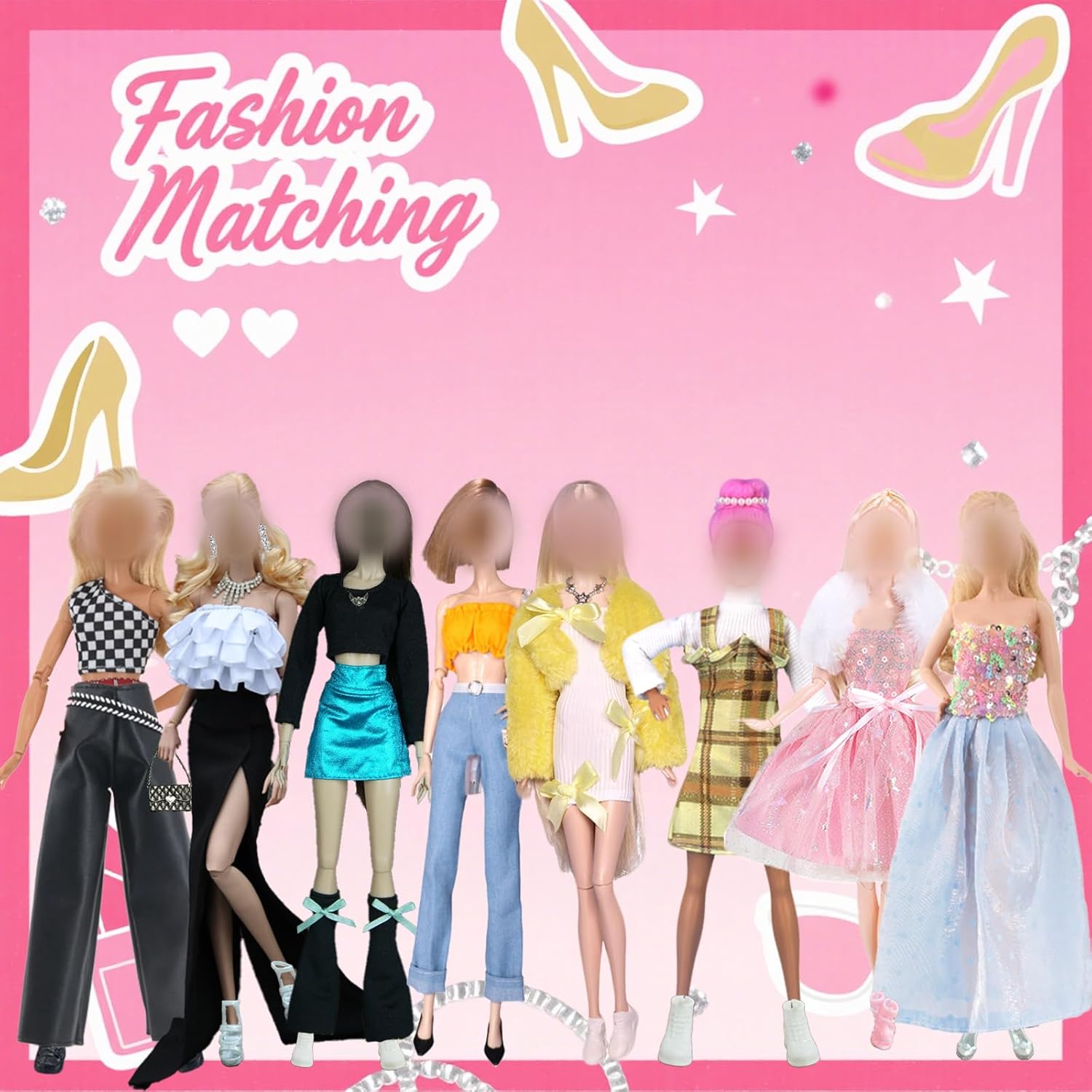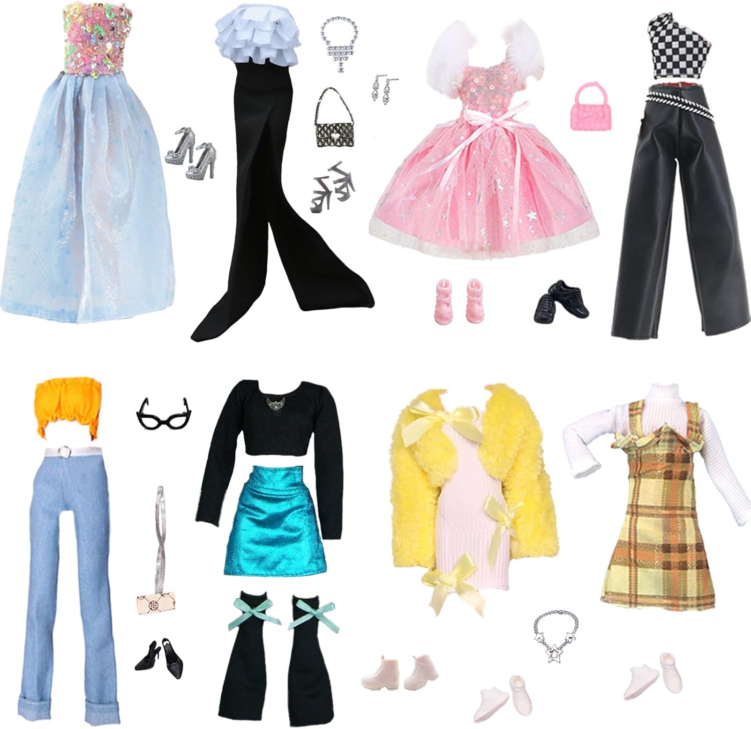 Set da 29 pezzi: collezione accuratamente curata nei toni del giallo: tuta a quadri, abiti con volant, abiti da principessa blu, abiti in tulle rosa con accessori in pelliccia e set streetwear alla moda: tutti i vestiti si armonizzano perfettamente e consentono una varietà di combinazioni. Dettagli di alta qualità: lavorazione di alta qualità con bordi increspati 3D, design con paillettes colorate e morbido cappotto di peluche. Aumenta il realismo e la qualità del gioco a un nuovo livello. Stimola la creatività: stimola giochi di ruolo alla moda e narrazione. Aiuta i bambini a imparare combinazioni di colori, abbinamento dei modelli e abilità di styling, promuovendo allo stesso tempo le abilità motorie e l'immaginazione. 【Soluzione completa per lo styling】Contiene 15 accessori essenziali: diversi modelli di scarpe, collane e borse che completano perfettamente gli abiti gialli e consentono un look completo dalla testa ai piedi. Imballaggio pronto da regalare: tutti i pezzi sono disposti in una confezione protettiva trasparente. Ideale come regalo per bambini e collezionisti, per un piacere immediato quando si apre la confezione.