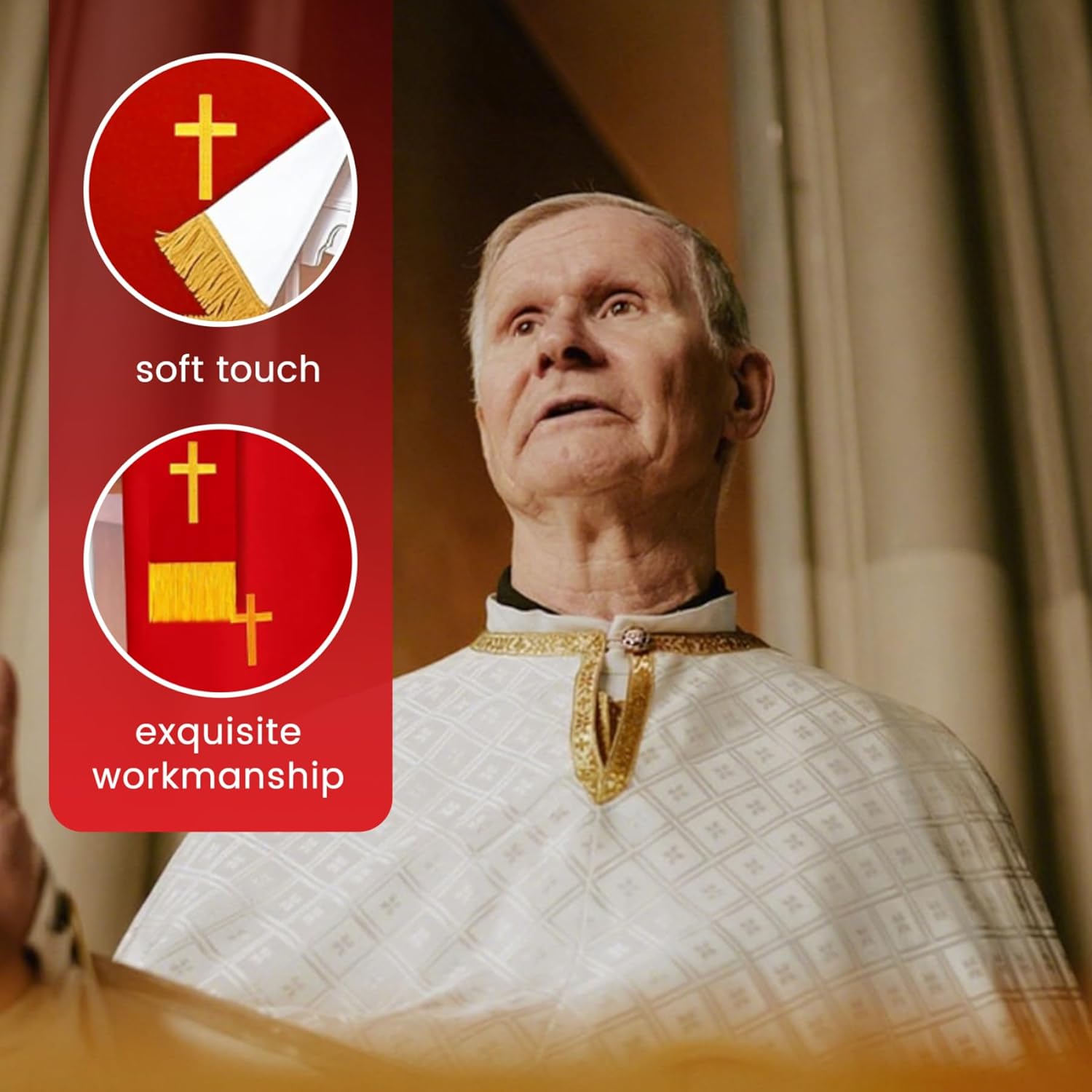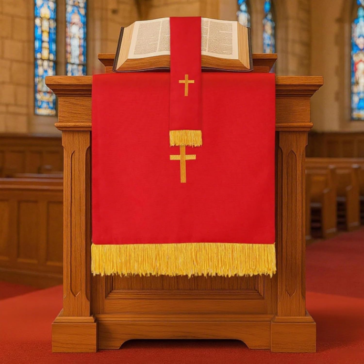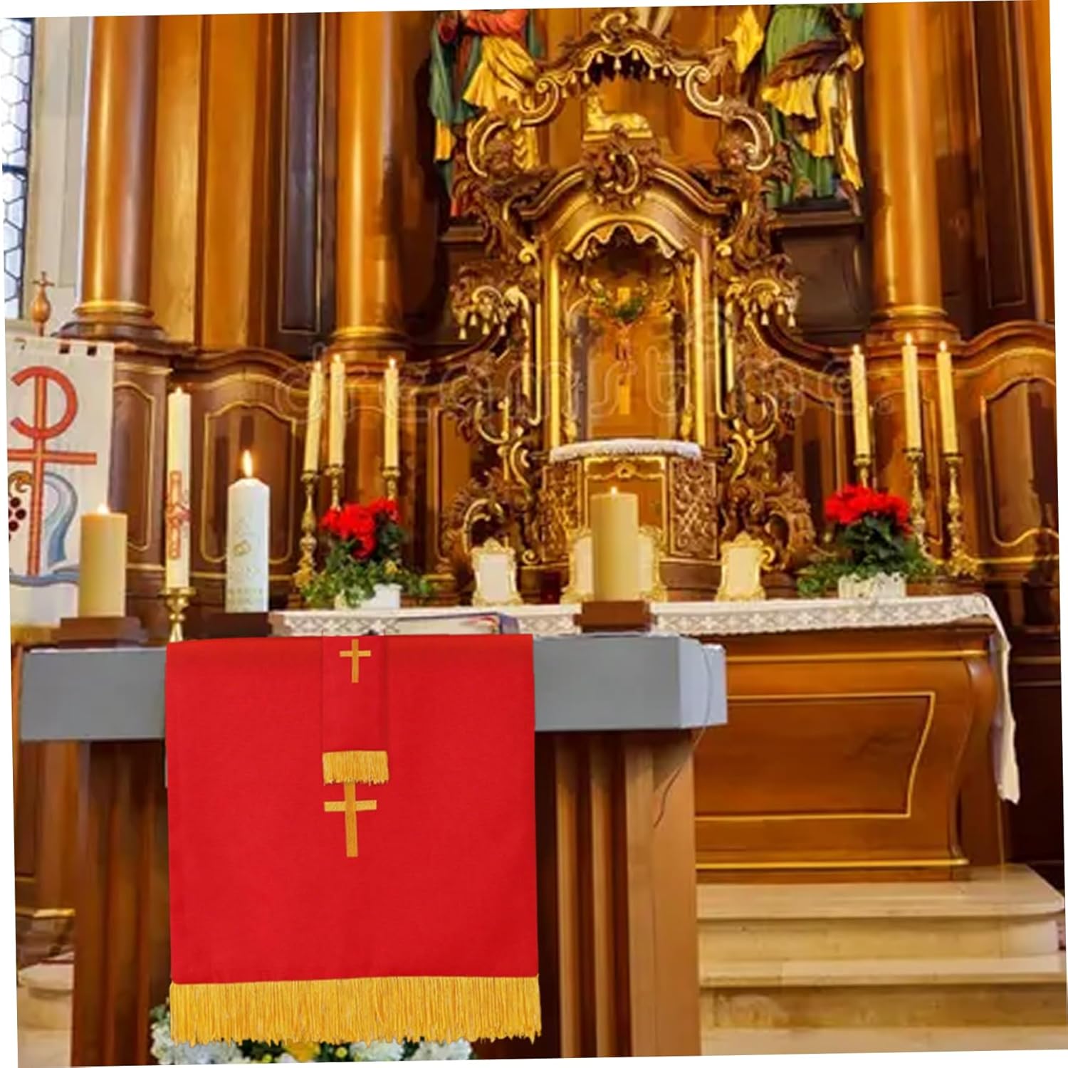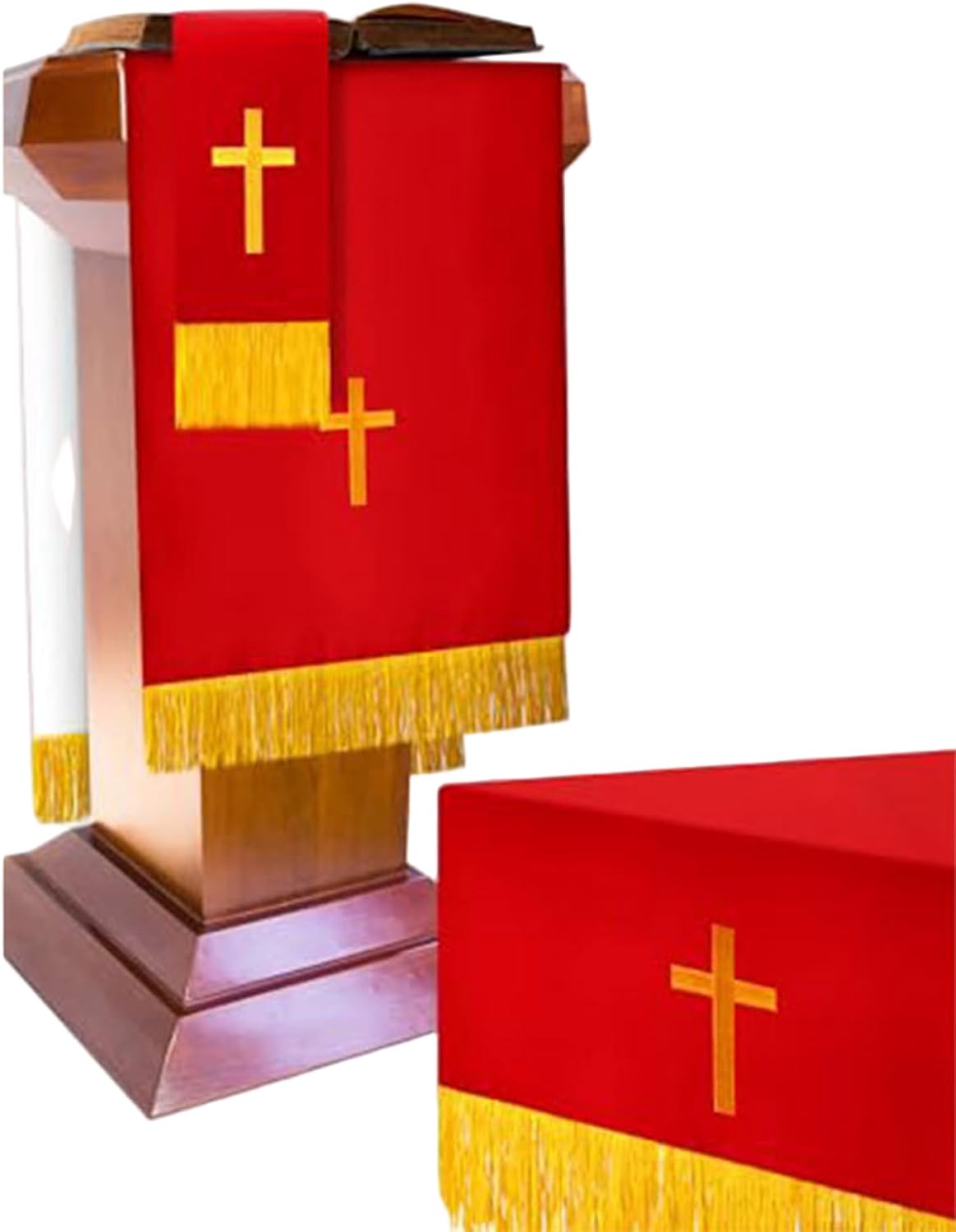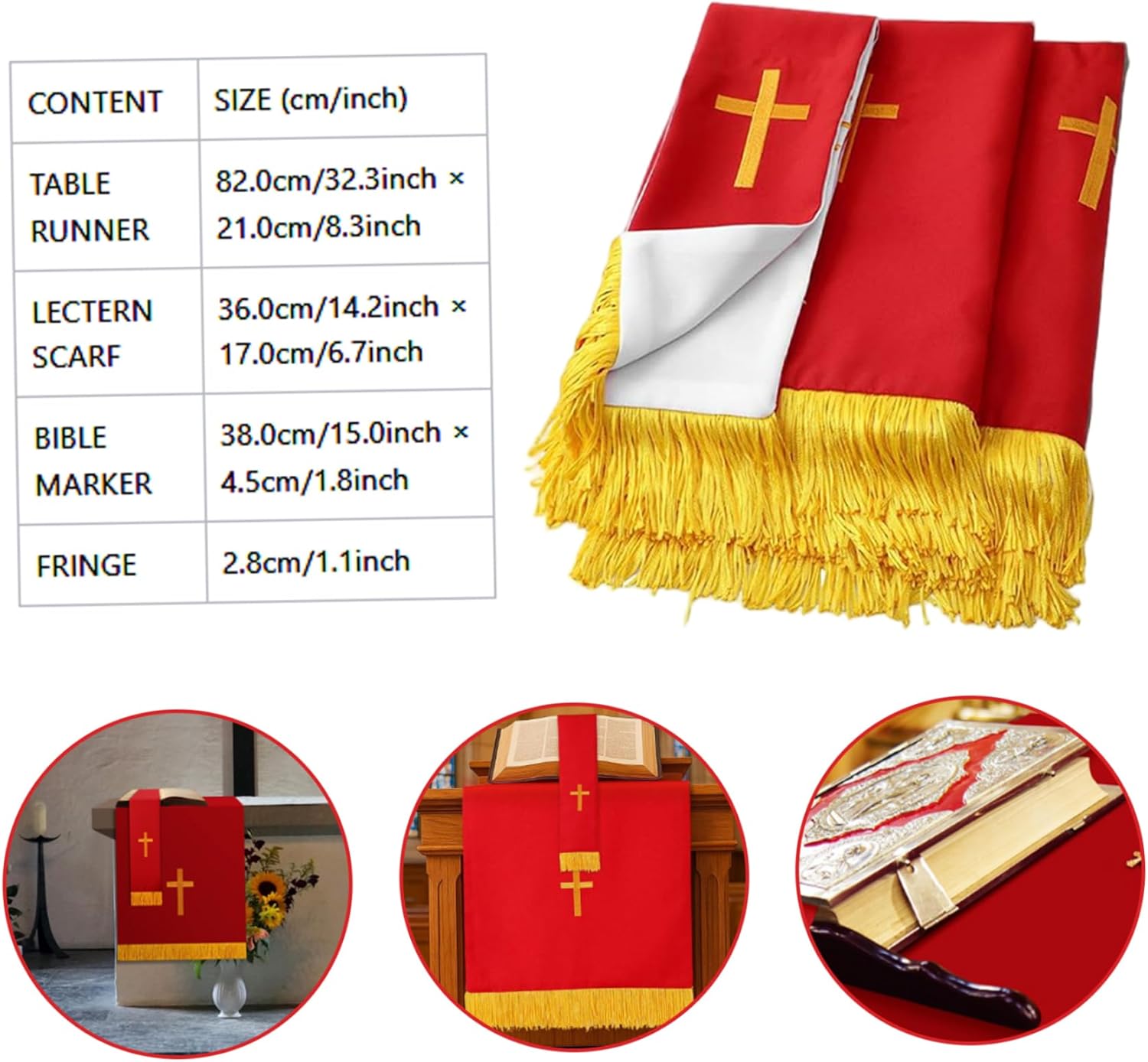 Pensato per il clero e le congregazioni: questo set di parametri completo rende significativo e apprezzato per i membri del clero, i gruppi di chiese o come un'aggiunta speciale alle forniture di chiese, promuovendo la riverenza e la devozione nelle aree di culto. Design reversibile per versatilità: ogni articolo presenta un design reversibile in tessuto, consentendo un uso esteso e una facile corrispondenza con diversi temi della chiesa o stagioni liturgiche, offrendo flessibilità e stile pratici in un unico set. Ricamo e tessuto: realizzato con materiali in fibra di poliestere con intricati ricami a croce dorata, questo set mantiene la sua bellezza attraverso un uso frequente, resistendo all'usura e allo sbiadimento, sostenendo le esigenze di servizio in chiesa a lungo termine. Eleganti elementi essenziali della chiesa: questo set di 3 pezzi di paramento reversibile include un rossastro rosso, un segnalibro e una sciarpa da pulpito ricamato con una croce d'oro, progettata specificamente per migliorare l'atmosfera sacra nelle chiese e nei luoghi di culto..Ogni pezzo aggiunge un tocco raffinato e solenne alle tabelle e ai pulpiti di comunione. Dimensioni perfette per l'uso della chiesa: dimensioni ideali si adattano perfettamente a tavoli di comunione, altari e pulpiti, fornendo una presentazione appropriata e dignitosa che completa le forniture di chiesa e i corridori rossi per le tabelle, rendendo la configurazione facile e lucidata.