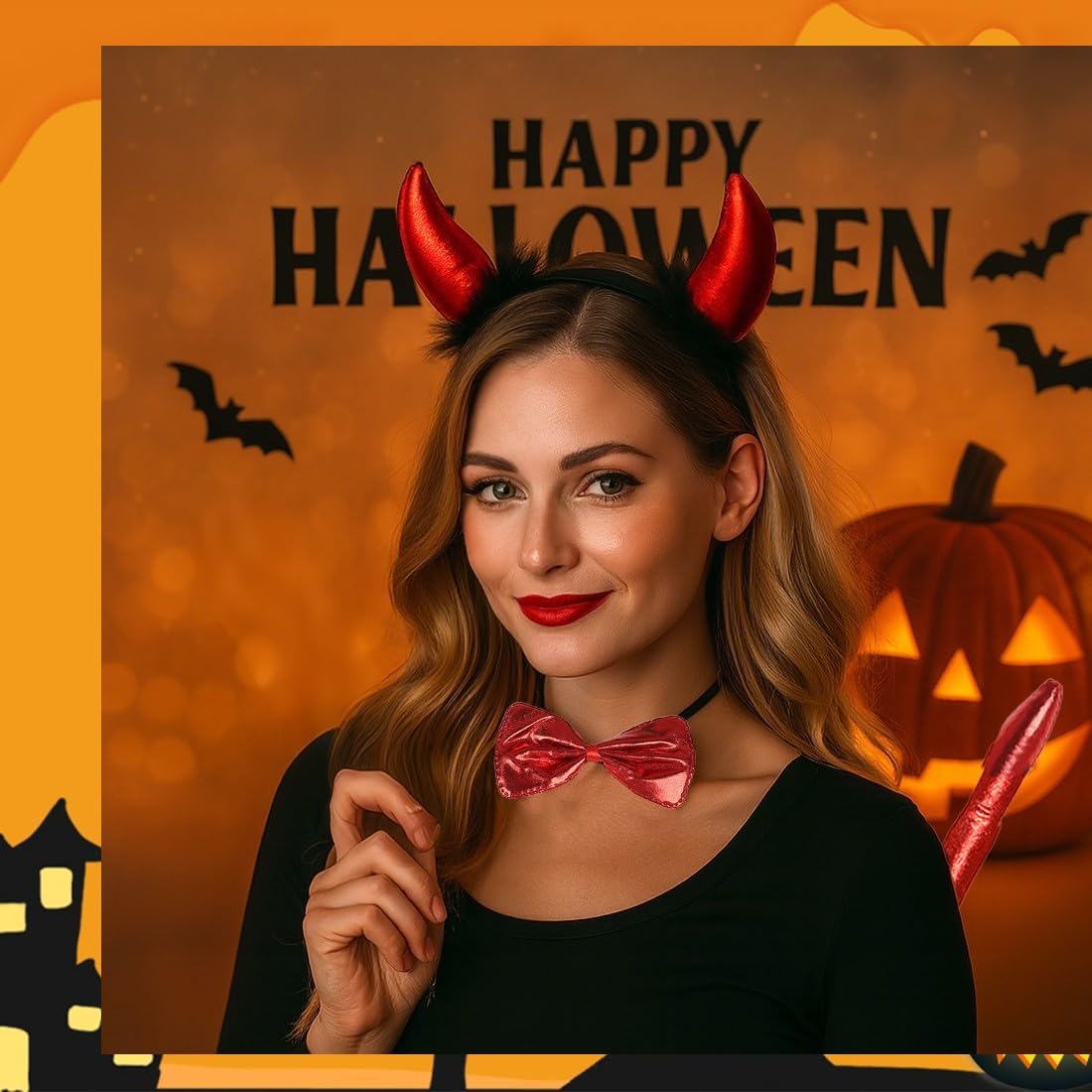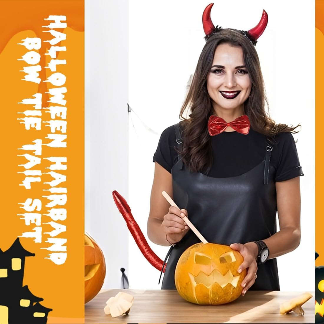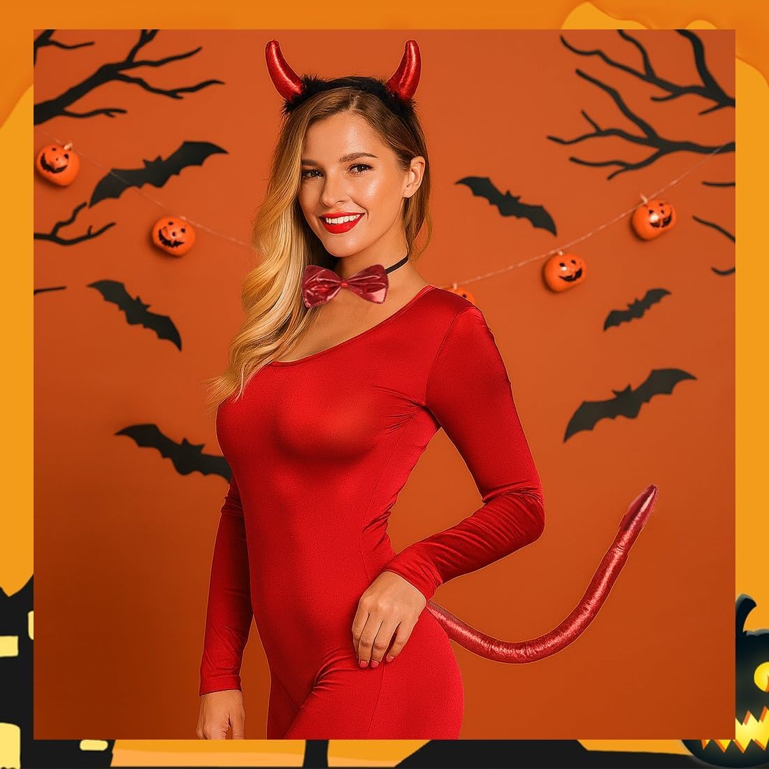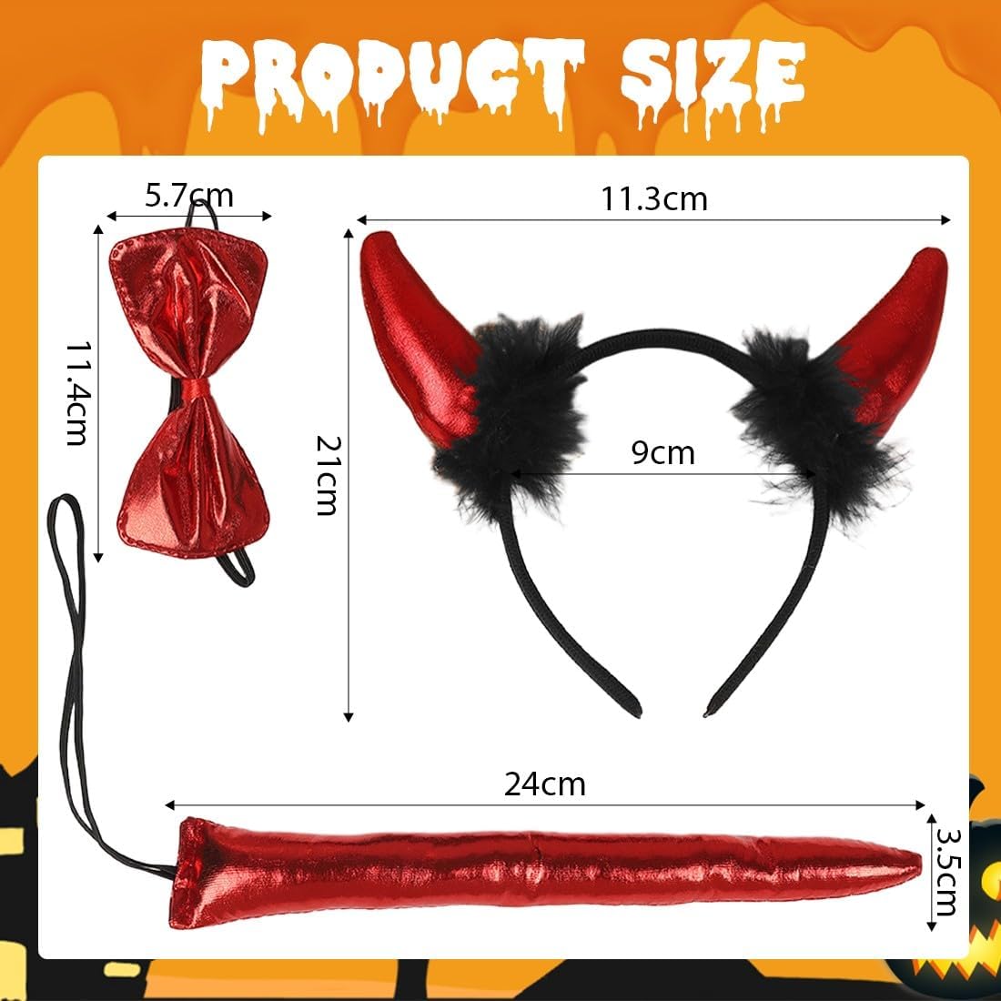 Set di 3 costumi da diavolo per Halloween: 1 cerchietto con corno da diavolo, 1 papillon rosso da diavolo, 1 coda da diavolo rosso. Ottimi accessori per decorazioni in maschera per feste di Halloween. Accessori per costumi da diavolo di Halloween Materiale: la coda del corno del diavolo è realizzata in tessuto, la fascia è in metallo, resistente e comoda da usare, il forcone del diavolo è in plastica, leggero e staccabile Aumenta l'atmosfera di Halloween: gli accessori cosplay del diavolo da abbinare al tuo costume da diavolo, belli e realistici, vestiti da diavolo spaventoso ma carino, il costume affascinante aggiunge più favore e divertimento alla festa a tema Design accattivante: la combinazione di piume rosse e nere rende queste corna un vero e proprio colpo d'occhio per qualsiasi festa. Non perdetevi le reazioni del pubblico quando vi esibirete con queste corna uniche. Sarete al centro dell'attenzione in ogni evento! Ampiamente usato: il set di costumi da diavolo rosso è adatto per feste di Halloween, feste a tema diavolo, feste di spaventose notti, feste di cosplay, spettacoli teatrali, foto, cerimonie di laurea e il regalo perfetto per famiglie o amici per compleanni o Halloween