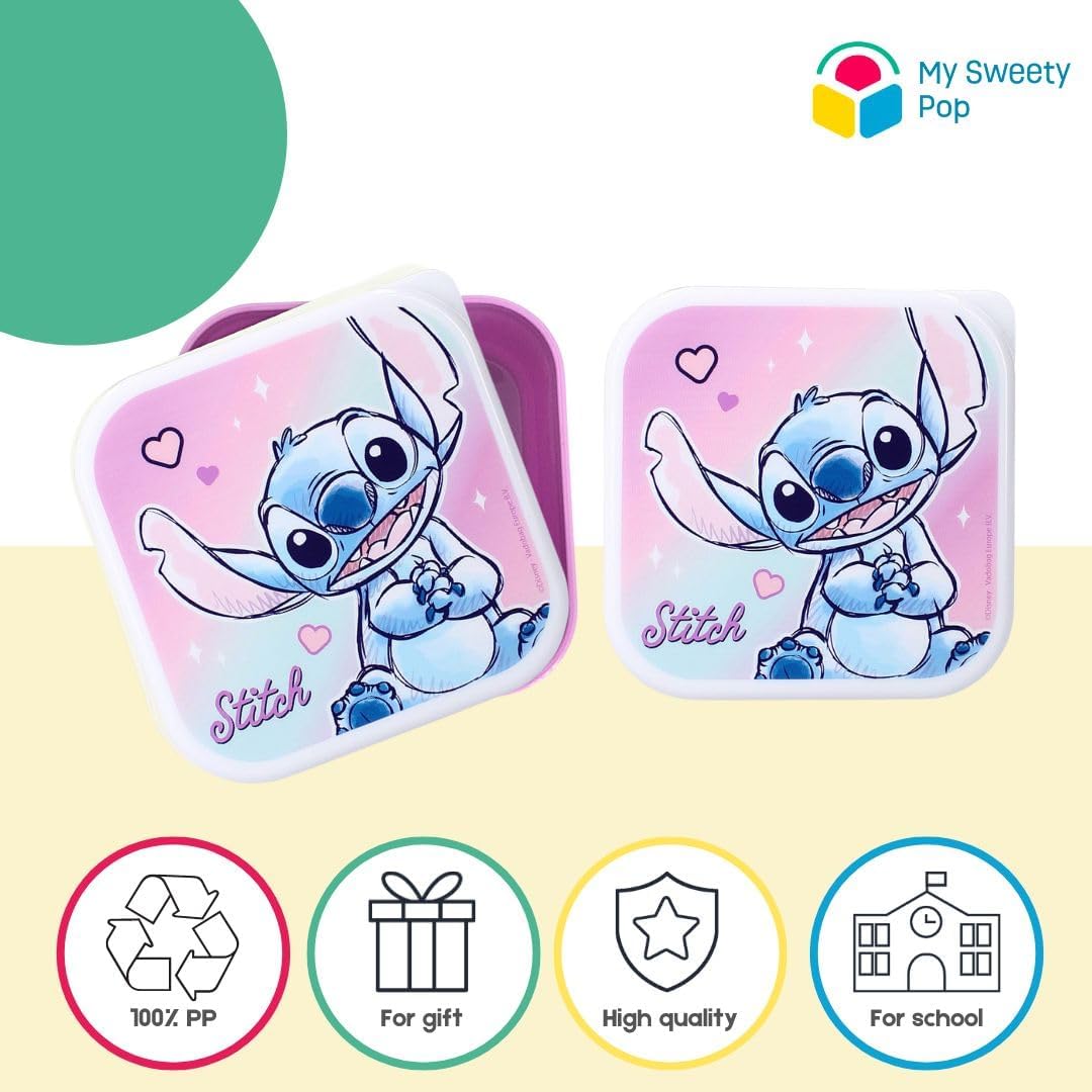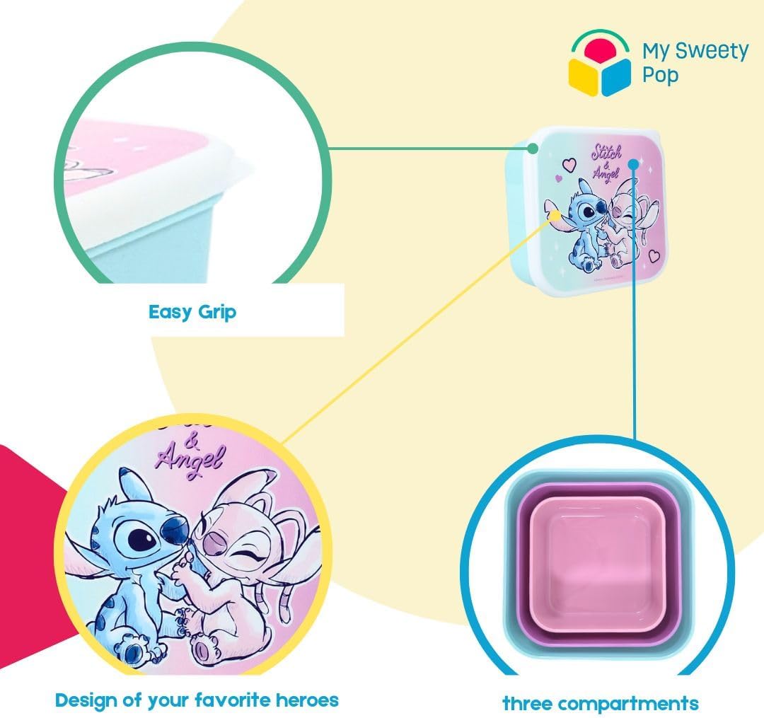 COMPOSIZIONE: Set di 3 scatole da pranzo con l'immagine di Stitch. Queste sono le scatole adatte per i bambini dell'asilo. Sono facili da aprire con il coperchio. Dimensioni: scatola grande: 11,5 x 11,5 x 5,5 cm. Scatola media: 10,5 cm x 10,5 cm x 5 cm Scatola piccola: 9 cm x 9 cm x 4 cm. LEGGERO: le scatole per bambini sono facili da pulire, sono realizzate in plastica resistente. Sono perfetti per i bambini della scuola materna o per le vacanze. Non mettere i contenitori in lavastoviglie, microonde e forno. Età consigliata: questo set è parafit per bambini dai 3 anni in su. Questo adorabile set di scatole Stitch è un regalo perfetto per i bambini.