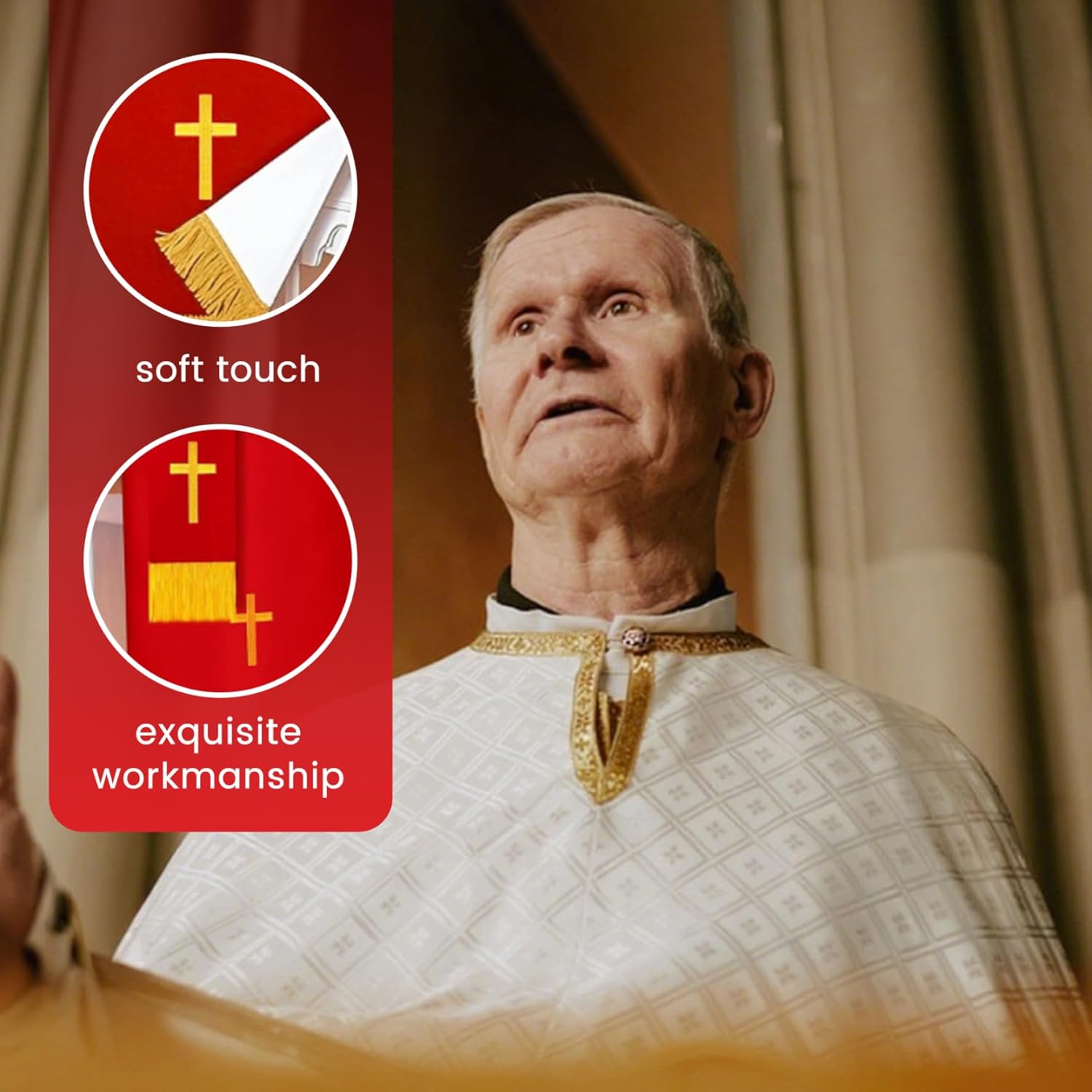Ricamo e tessuto: realizzato con materiali in fibra di poliestere con intricati ricami a croce dorata, questo set mantiene la sua bellezza attraverso l'uso frequente, resistendo all'usura e allo sbiadimento e supportando al contempo le esigenze di servizio in chiesa a lungo termine. Design reversibile per versatilità: ogni articolo presenta un design in tessuto reversibile, che consente un uso prolungato e un facile abbinamento con diversi temi della chiesa o stagioni liturgiche, offrendo flessibilità pratica e stile in un unico set. Eleganti elementi essenziali per la chiesa: questo set di 3 paramenti reversibili include un runner da tavolo rosso, un segnalibro e una sciarpa da pulpito ricamata con una croce dorata, progettata specificamente per migliorare l'atmosfera sacra nelle chiese e nei luoghi di culto..Ogni pezzo aggiunge un tocco raffinato e solenne ai tavoli e ai pulpiti della comunione. Premuroso per il clero e le congregazioni: questo set completo di paramenti rappresenta una scelta significativa e apprezzata per i membri del clero, i gruppi ecclesiali o come aggiunta speciale alle forniture della chiesa, favorendo la riverenza e la devozione nelle aree di culto. Dimensioni perfette per l'uso in chiesa: le dimensioni ideali adattano perfettamente a tavoli da comunione, altari e pulpiti, fornendo una presentazione appropriata e dignitosa che completa le forniture della chiesa e le guide rosse per i tavoli, rendendo l'installazione facile e raffinata.