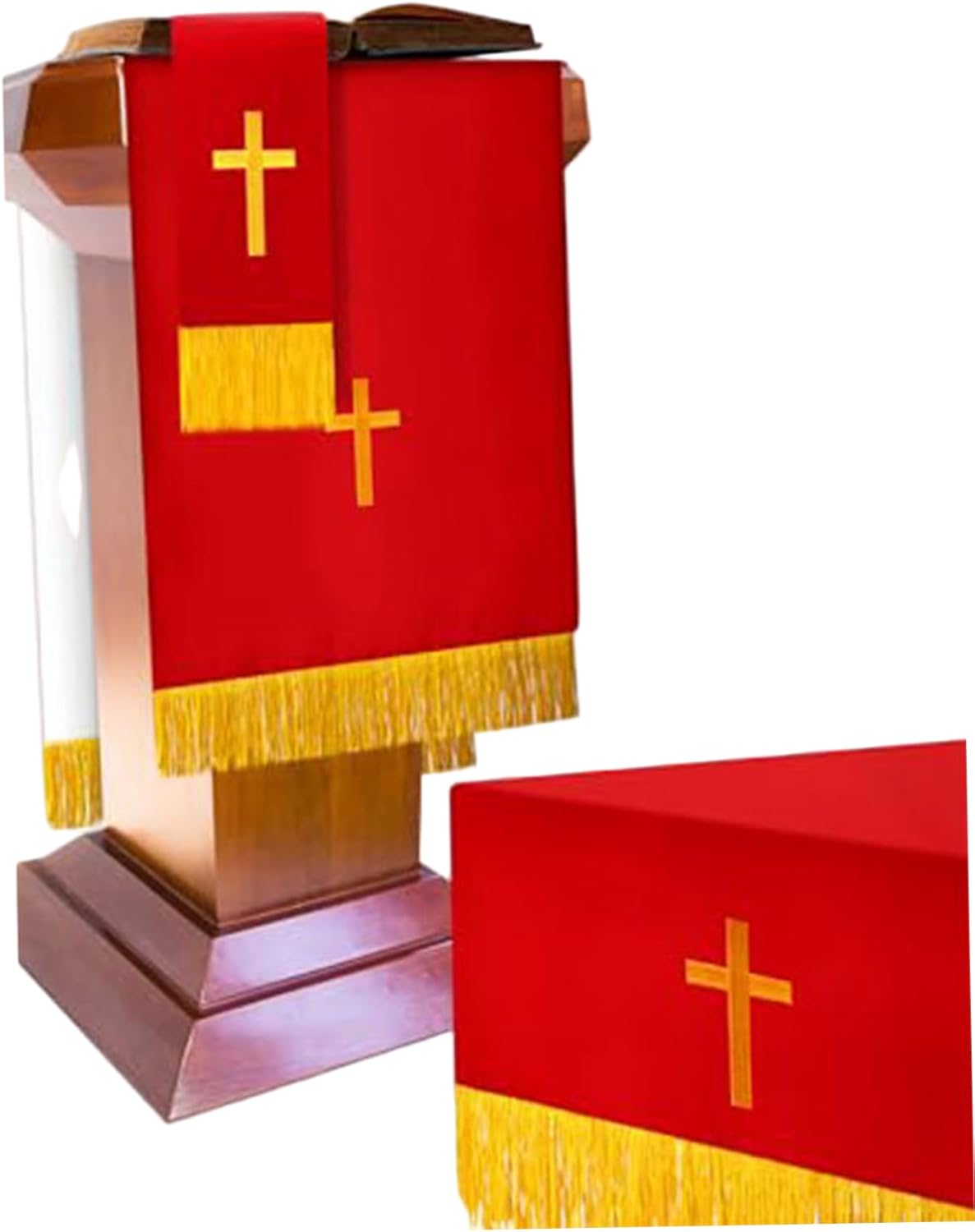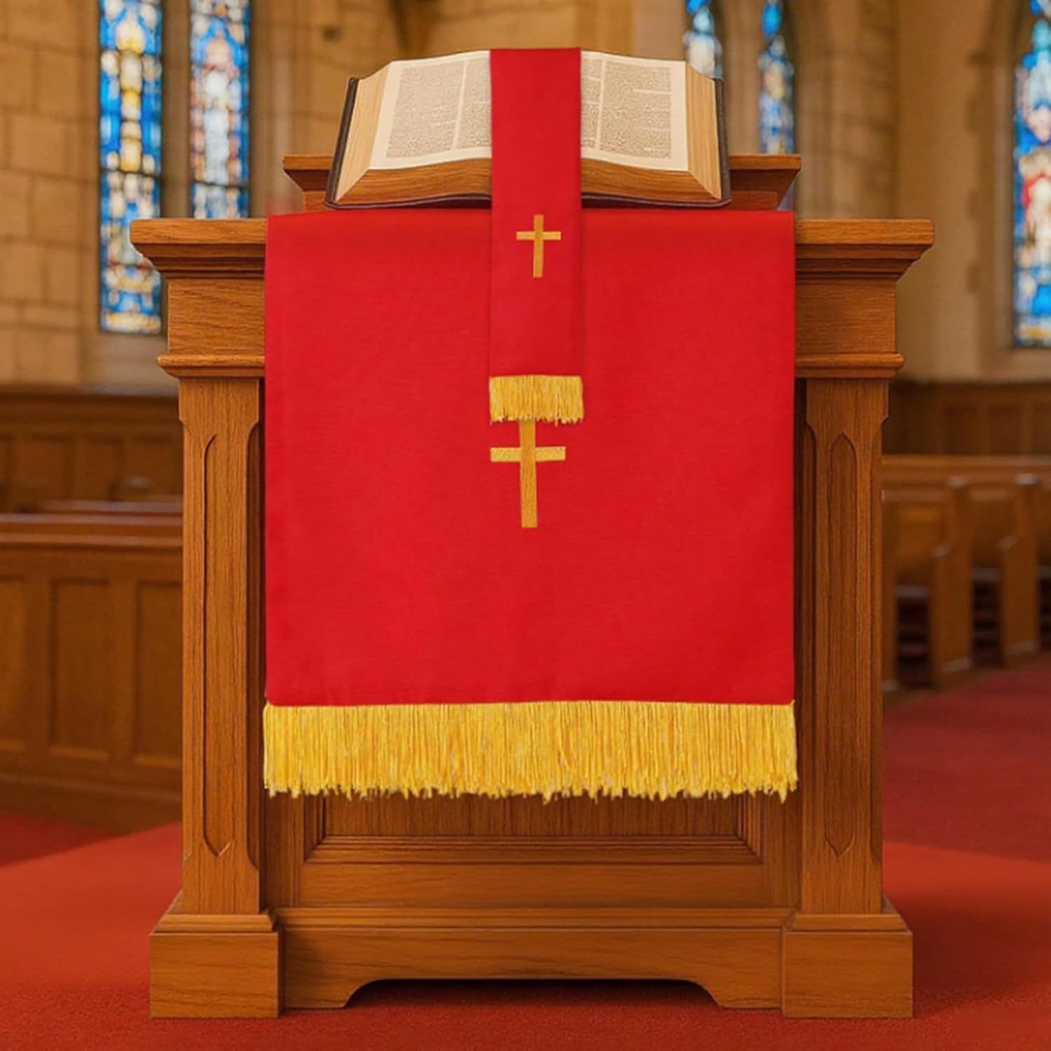 Dimensioni perfette per l'uso della chiesa: dimensioni ideali adattano perfettamente a tavoli di comunione, altari e pulpiti, fornendo una presentazione appropriata e dignitosa che completa le forniture di chiesa e i corridori rossi per le tabelle, rendendo la configurazione facile e lucidata. Design reversibile per versatilità: ogni articolo presenta un design reversibile in tessuto, consentendo un uso esteso e una facile corrispondenza con diversi temi della chiesa o stagioni liturgiche, offrendo flessibilità e stile pratici in un unico set. Pensato per il clero e le congregazioni: questo set di parametri completo rende significativo e apprezzato per i membri del clero, i gruppi di chiese o come un'aggiunta speciale alle forniture di chiese, promuovendo la riverenza e la devozione nelle aree di culto. Eleganti elementi essenziali della chiesa: questo set di 3 pezzi di paramento reversibile include un rossastro rosso, un segnalibro e una sciarpa da pulpito ricamato con una croce d'oro, progettata specificamente per migliorare l'atmosfera sacra nelle chiese e nei luoghi di culto..Ogni pezzo aggiunge un tocco raffinato e solenne alle tabelle e ai pulpiti di comunione. Ricamo e tessuto: realizzato con materiali in fibra di poliestere con intricati ricami a croce dorata, questo set mantiene la sua bellezza attraverso un uso frequente, resistendo all'usura e allo sbiadimento, sostenendo le esigenze di servizio in chiesa a lungo termine.