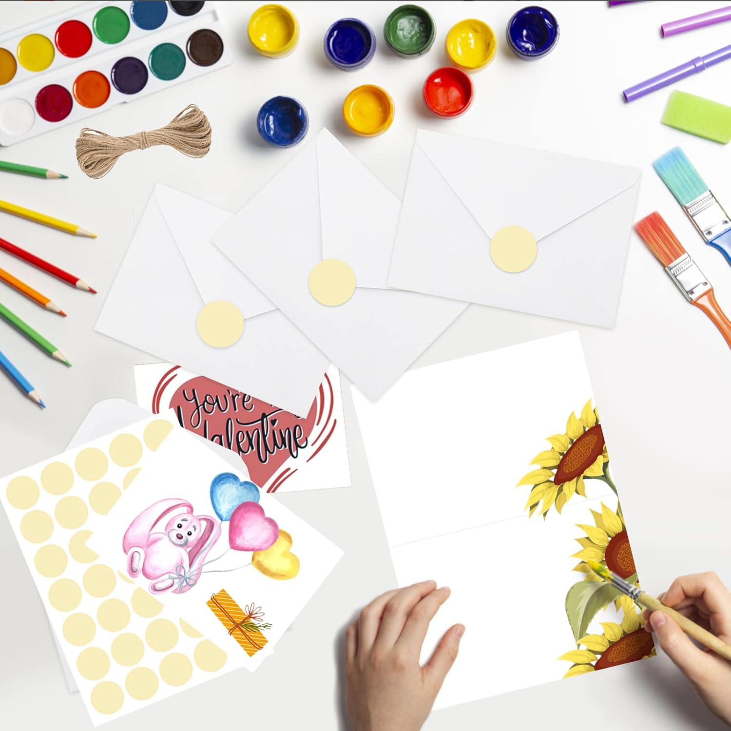 Biglietti in carta kraft da 10 x 15 cm: questi biglietti piatti vengono forniti in una confezione da 30 pezzi con buste corrispondenti, in modo da averne più che sufficienti in ogni occasione. Alta qualità: questi biglietti sono dotati di buste di alta qualità che assicurano che i tuoi appunti siano consegnati con stile. La struttura robusta delle buste offre una confezione sicura e attraente per i tuoi messaggi. 35 pezzi. adesivi rotondi: per completare la qualità delle carte e delle buste, includiamo 35 adesivi rotondi. Questi adesivi abbinati assicurano una chiusura sicura e aggiungono un tocco di raffinatezza alla tua corrispondenza. Perfetto per tutte le occasioni: che tu voglia inviare un ringraziamento, un breve saluto o un bel messaggio, un set di questi eleganti biglietti bianchi è essenziale. Ideale per compleanni, matrimoni, anniversari e molto altro ancora. Dimensioni: le buste misurano 11 x 16 cm, gli inserti piatti misurano 10 x 15 cm. Sia che tu voglia scrivere un messaggio cordiale, scrivere un invito personale o scrivere un messaggio speciale, questi biglietti vuoti sono perfetti per ogni occasione.