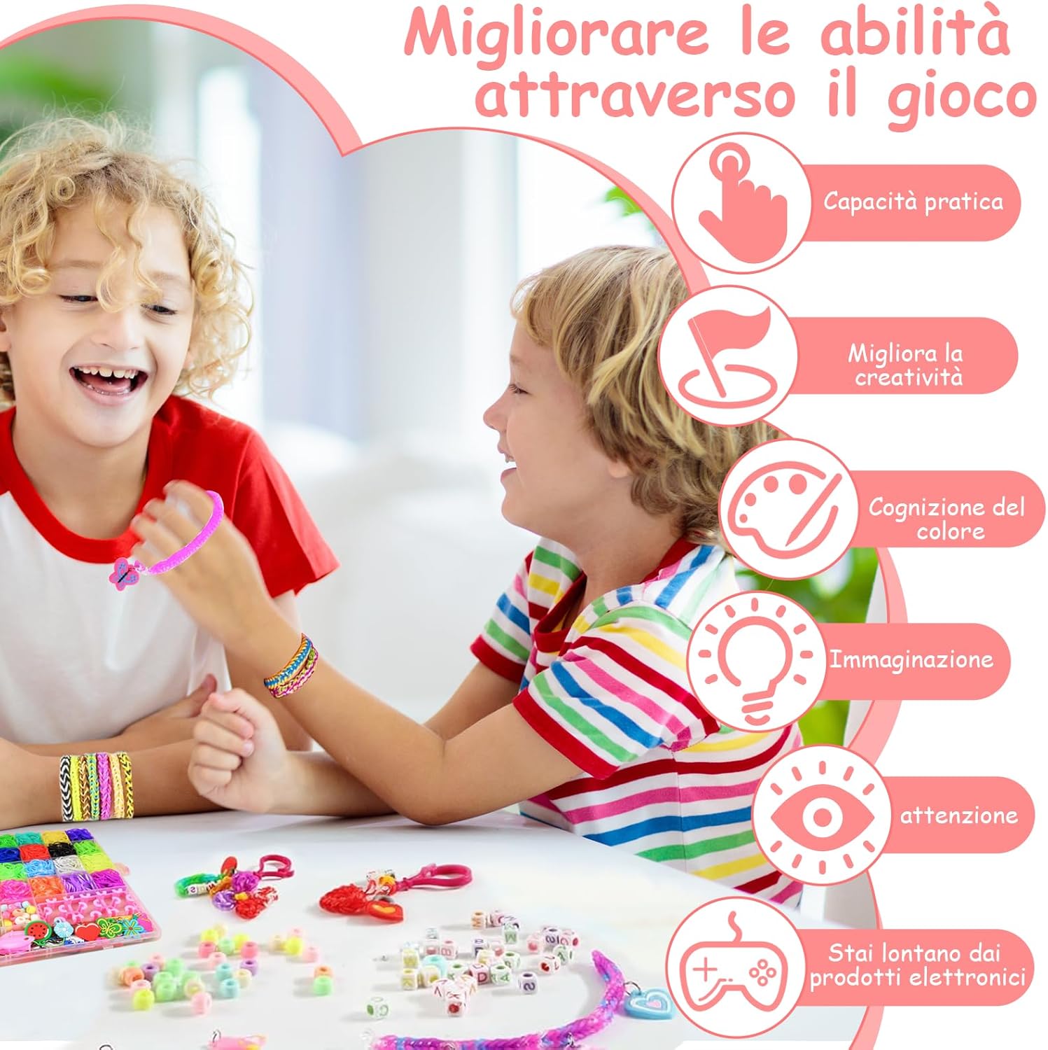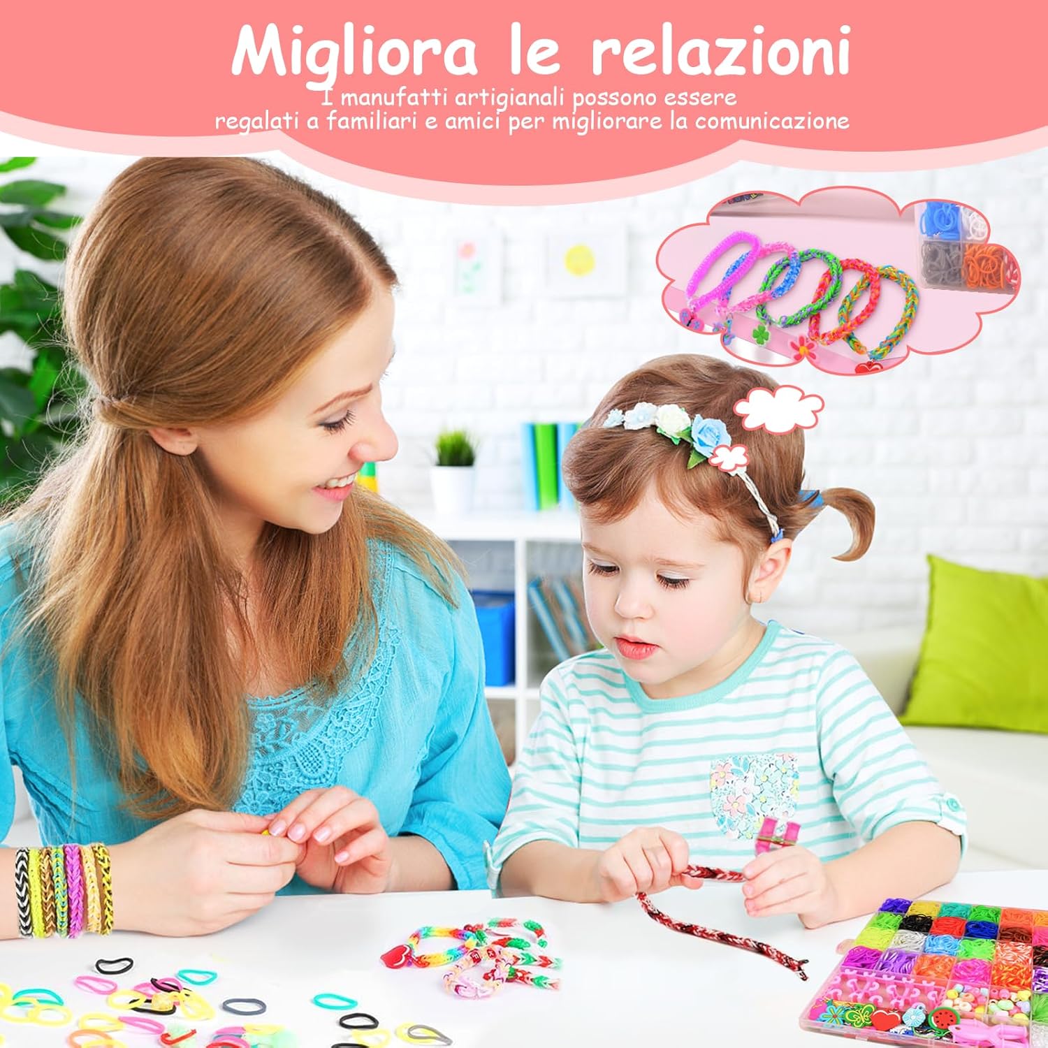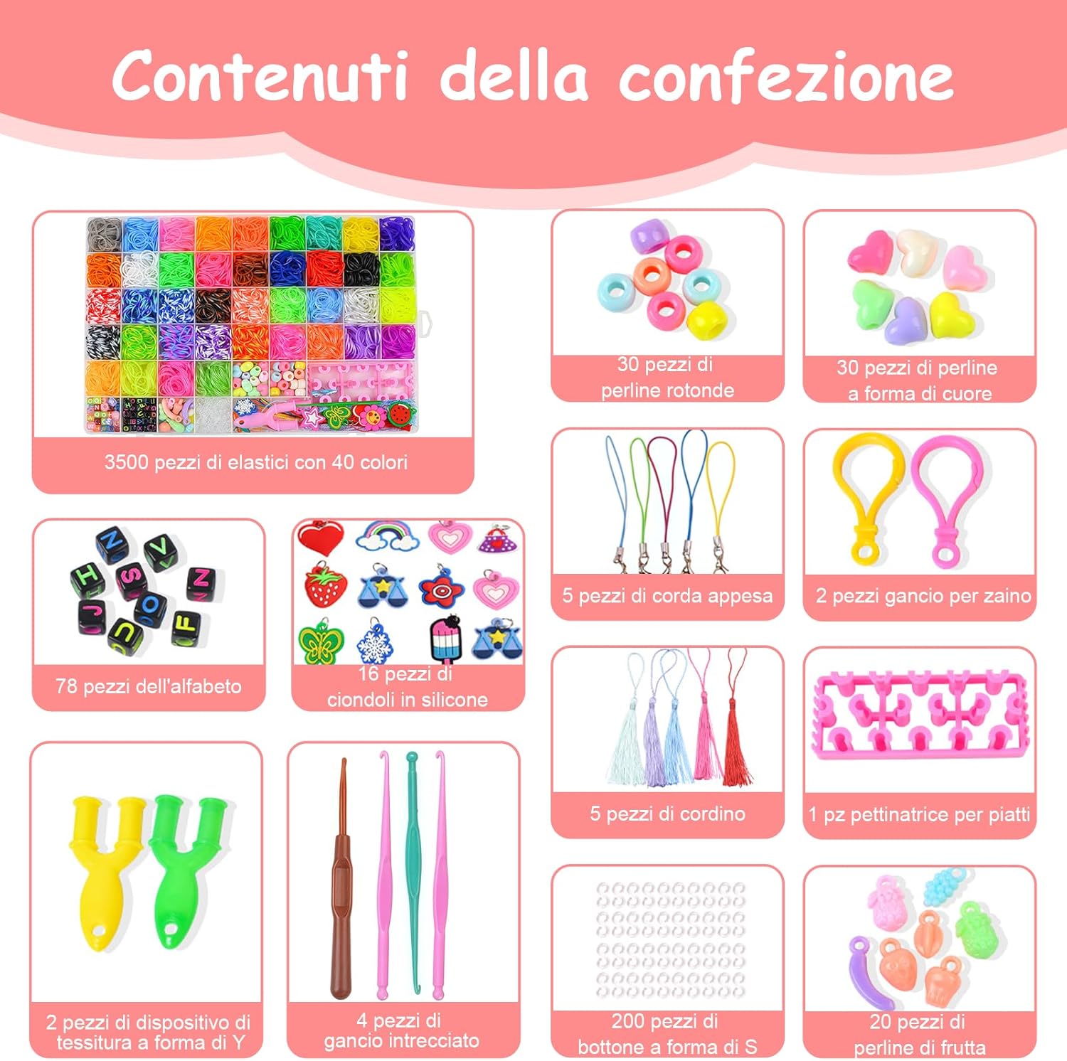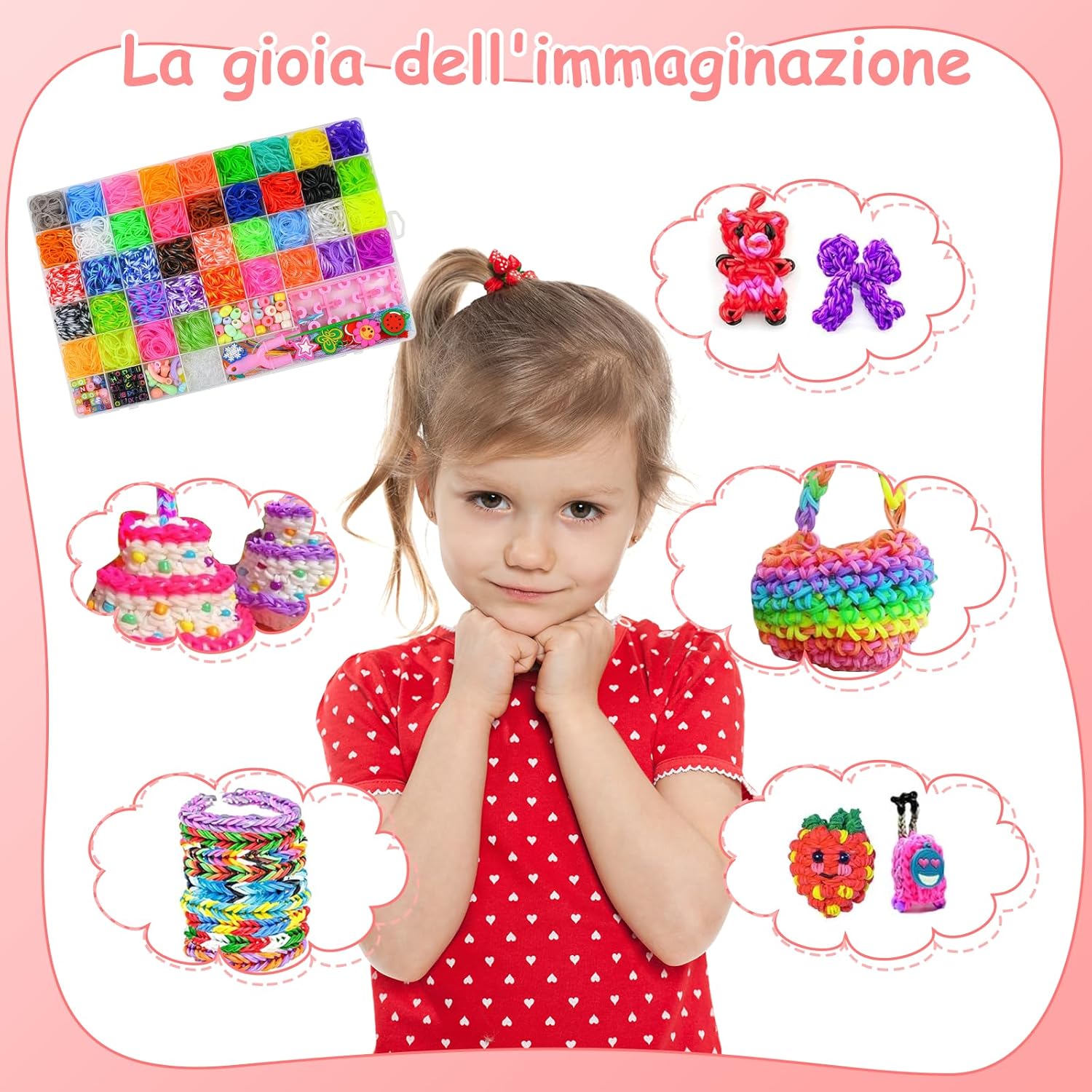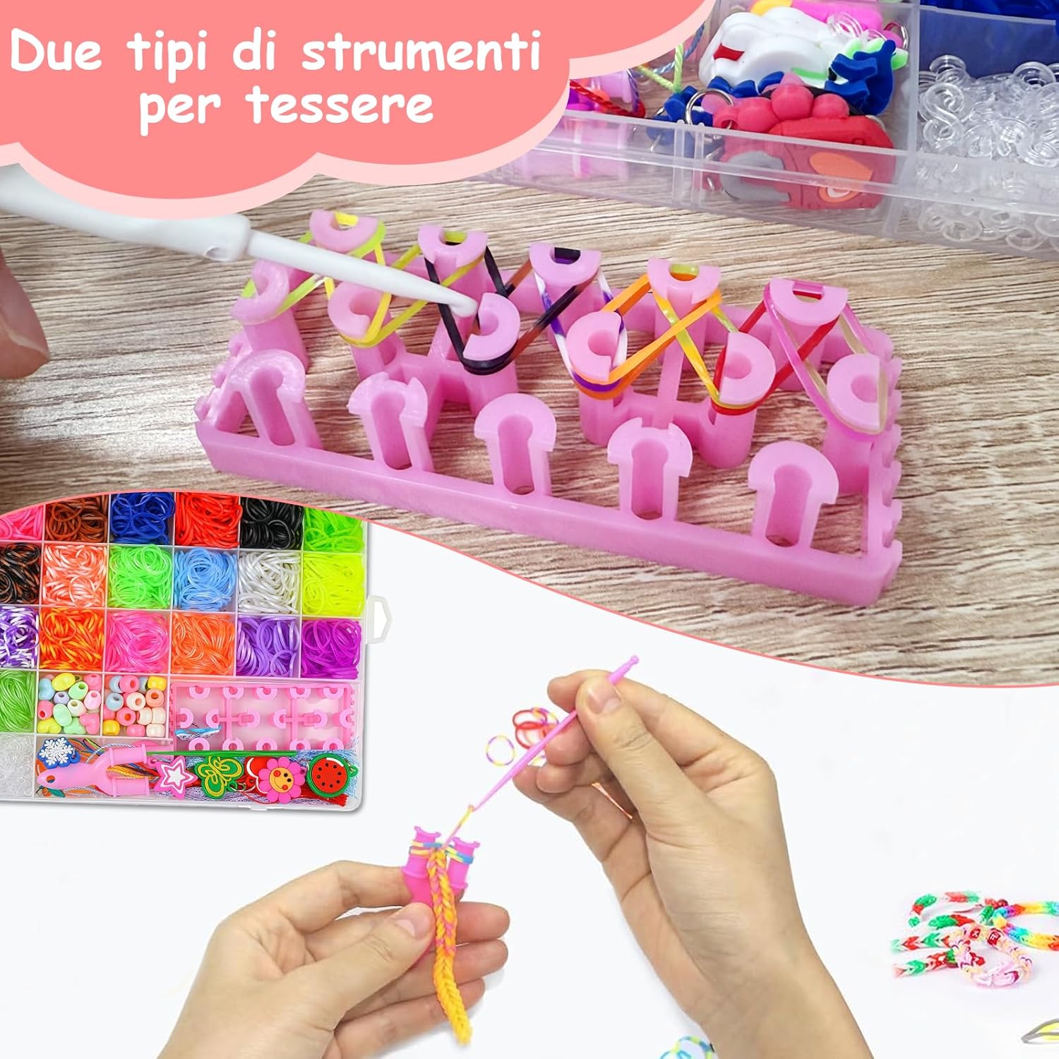 【Materiali sicuri】 Questo set elastici per braccialetti realizzato in gomma di alta qualità, non è tossico e inodore e ha la certificazione CE in modo che i bambini possano usarlo senza esitazione 【Attrezzatura reicale】 Questo kit braccialetti fai da te bambina contiene vari materiali ausiliari, come perle (lettere, monocromo e in stile di frutta), decorazioni festive, strumenti (ganci, aghi in maglieria, cornici Web a forma di Y, decorazioni di supporto, decorazioni di supporto e cratle e decorazioni di supporto e artigianato e decorazioni di supporto e artigianato e artigianato e decorazioni di supporto e artigianato e artigianato e artigianato e artigianato e decorazioni di supporto e artigianato e artigianato di supporto e artigianato e decorazioni di supporto e artigianato e artigianato di supporto e artivamente articoli 【Durevole e facile da usare】 Il kit braccialetti elastici contiene gomma di alta qualità, morbida e robusta che non si rompe facilmente e riutilizzabile; I bordi degli strumenti sono fluidi per evitare di violare le mani dei bambini e adatti a un artigianato più lungo 【Promozione di abilità e relazioni】 I ricchi colori e accessori nel kit elastici per braccialetti offrono ai bambini uno spazio per lo sviluppo creativo, incoraggiano la progettazione di opere personalizzate e stimolano la creatività e la necessità di espressione. Le opere d'arte prodotte possono anche essere consegnate ad amici o familiari per approfondire la comunicazione e le relazioni 【Pratica di archiviazione】 Questo elastici braccialetti kit fornito con una scatola di stoccaggio con scomparti, in cui vengono mantenuti ordinati colori e accessori diversi, il che facilita una rapida ricerca e organizzazione e aiuta i bambini a sviluppare una abitudini 【Il regalo ideale】 Questo braccialetti elastici kit è adatto come regalo di compleanno, Natale e Halloween. Si combina divertimento con l'educazione e soddisfa le esigenze dei bambini di età compresa tra 8 e 11 anni