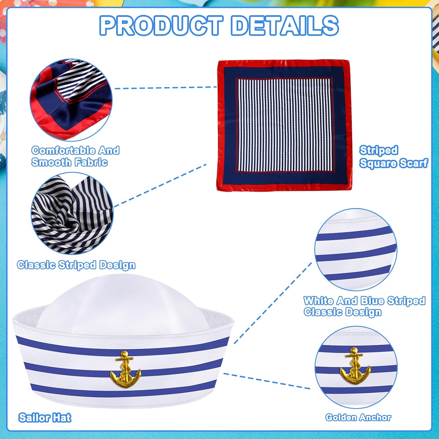 Great accessories that will make in our vacation unforgettable memories. We ordered them especially for our boys, but they are also suitable for adults. The sailor hat fits exactly the head of a child, having a circumference of 56cm, but the captain hat is also adjustable, and its diameter of 58cm allows it to be worn by an adult, but a little tight at the back, by a child as well. The glasses are easy to wear, do not have a heavy frame, not leaving marks on the nose. The scarf is so fine, elegant, made of satin and its design fits perfectly with the rest of the accessories. Both hats have golden applications that accessorize them perfectly and make them look as close as possible to the original ones. I warmly recommend, very satisfied with the price, quality and the bundle offered.