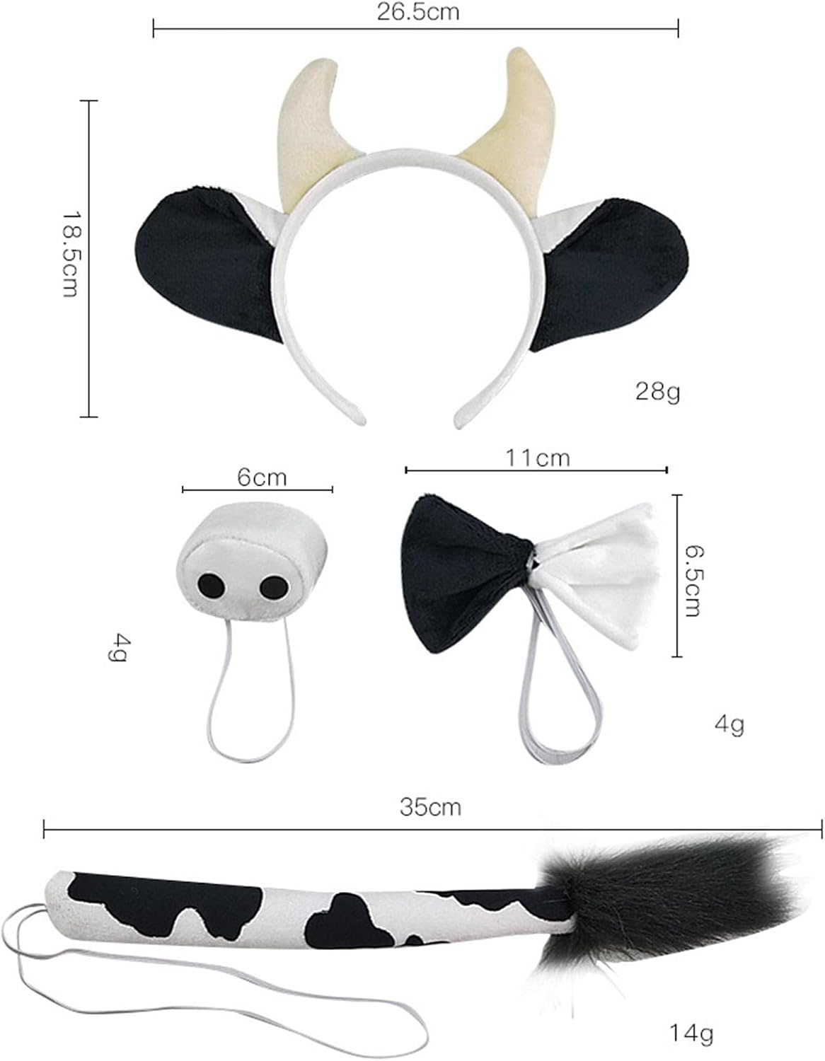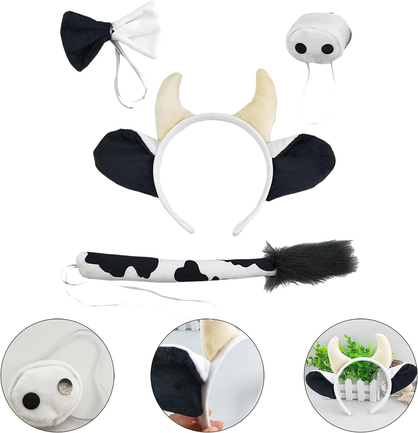 Descrizione : Costume da mucca animale: include 1 fascia per orecchie, 1 naso, 1 papillon e 1 coda Materiale: peluche di alta qualità, dettagli delicati, tocco confortevole, durevole da usare. Facile da indossare: taglia unica adatta alla maggior parte degli adulti e dei bambini. Gli elastici bianchi sono attaccati alla coda, papillon per una facile vestibilità, morbidi e confortevoli. carino: set di costume da mucca pelosa alla moda e unico, completa il tuo vestito da mucca di Halloween, divertente e confortevole. Applicazione: perfetto per feste a tema, feste in maschera, cosplay, feste in costume, Halloween, Natale e molto altro ancora. Specifiche tecniche: materiale : peluche Dimensioni del prodotto: Fascia per capelli: 25 cm x 16 cm. naso: 6 cm. Papillon: 12 cm x 7 cm. coda: 32 cm. La confezione include: Set costume da mucca animale 4