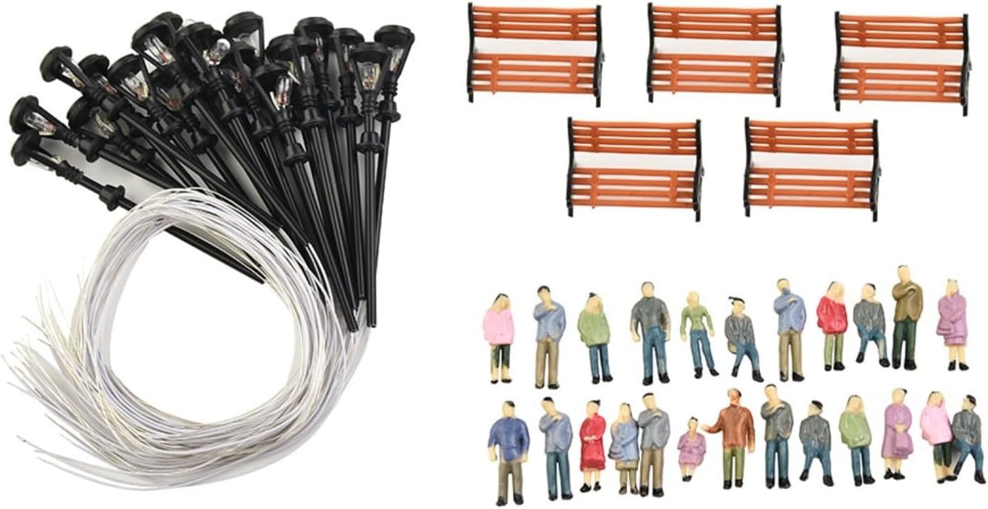 Set di modelli completi: set da 49 pezzi in scala HO OO che include 24 figure dipinte, 5 panche e 20 lampioni per migliorare le scene del tuo modello di treno. Questa collezione completa fornisce tutto il necessario per dare vita alla tua miniatura con dettagli realistici e paesaggi vivaci. 24 personaggi: ognuna delle 24 figure è meticolosamente dipinta a mano con colori e dettagli realistici. Queste persone in miniatura aggiungono un elemento umano al tuo modello, rendendo le scene di strada e le piattaforme delle stazioni più coinvolgenti e autentiche. 5 panche classiche e 20 lampioni: il set include 5 panche classiche e 20 lampioni, perfetti per creare diversi ambienti urbani o rurali. Usa questi elementi per progettare parchi, strade o aree di attesa nel layout del tuo treno modello, aggiungendo profondità e interesse alle tue scene. Modelli in scala HO OO (1:87-1:100): progettati per adattarsi perfettamente ai modelli in scala HO OO (1:87-1:100), questi accessori sono per appassionati e hobbisti che lavorano con modellini di trenini. Integra facilmente questi pezzi nei tuoi layout esistenti o usali come base per nuovi progetti. Varie applicazioni: sebbene sia perfetto per gli appassionati di modellini, questo set è ideale anche per altri paesaggi in miniatura, diorami e modelli architettonici. Usalo per la modellazione di tavoli di sabbia, decorazione di scene o per migliorare i paesaggi nelle tue creazioni in miniatura.
