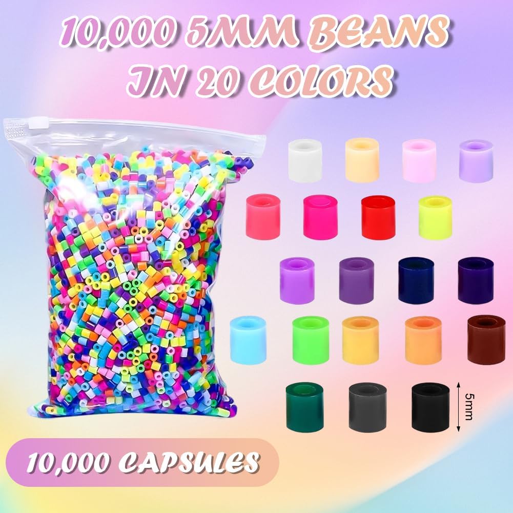 Set di perline da 5 mm: 10.000 perline di alta qualità con diametro di 5 mm. Le perle sono di colore puro, facili da stirare e si fondono in modo uniforme. Materiali di alta qualità: perline da stirare di alta qualità, atossiche e inodori, non facili da rompere e innocue per la salute. Ideale per adulti e bambini. Perline colorate: questo set di perline da stirare contiene altre quantità e colori tra cui scegliere. Il set di perline è disponibile in nero, blu, verde, rosso, rosa, ecc., che piace a ragazzi e ragazze. Regalo perfetto: questo set di perline da stirare è perfetto come regalo per Natale, Pasqua, compleanni per bambini, vacanze o per il fai da te. Multiuso: con questo set di perline per bambini, si possono realizzare anelli, portachiavi, ciondoli, design 3D, accessori e decorazioni, rendendolo un perfetto giocattolo per attività di festa.