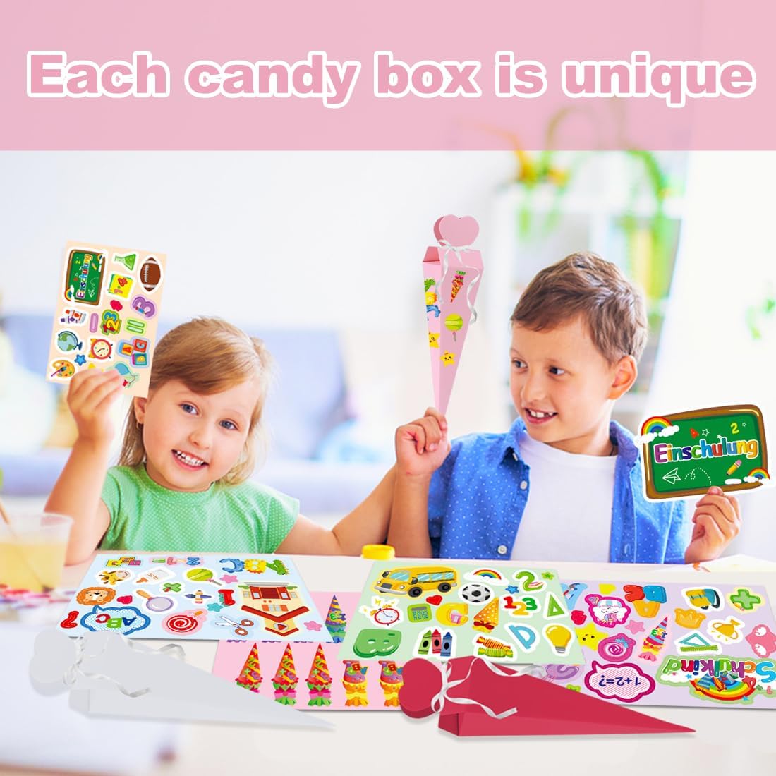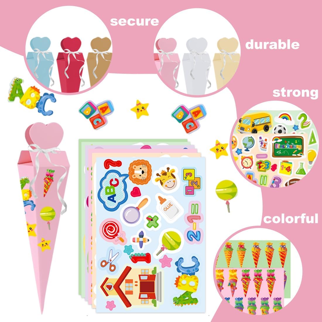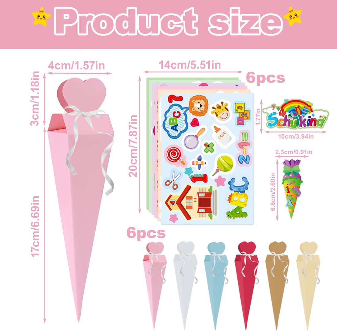 Design unico: questo set include 6 coni di caramelle e 6 adesivi. Con il loro design accattivante, questi sacchettini sono perfetti come regalo per il rientro a scuola, compleanni o altre occasioni speciali. Materiale di qualità: realizzati in carta robusta, i nostri coni di caramelle offrono una grande durata. Sono abbastanza resistenti da sopportare l'eccitazione del rientro a scuola pur rimanendo leggeri per essere facilmente trasportati dai bambini. Ideale per i kit artigianali per il rientro a scuola Compatti e pratici: con una dimensione di 4*17 cm, i nostri piccoli coni sono perfetti per i fratelli che festeggiano insieme il rientro a scuola. Il loro pratico formato permette di riempirli con piccole sorprese come caramelle o piccoli giocattoli. Facile da montare: Questi coni di caramelle sono facili da montare in pochi passaggi. Riempili con dolcetti, snack, materiale scolastico, piccoli giocattoli o altre sorprese per deliziare i bambini e rendere speciale la loro giornata. Regalo perfetto: questi coni per ragazzi e ragazze sono adorabili e sofisticati, ideali come regalo per il rientro a scuola, borsa per i fratelli, carta da regalo, souvenir di fine scuola materna, decorazione per feste o accessorio di abbigliamento. Crea ricordi indimenticabili con i tuoi bambini