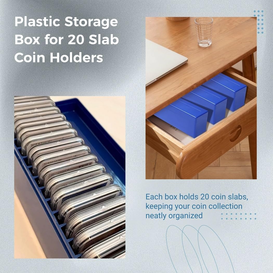 Efficiente organizzazione delle monete: il nostro set da 6 scatole è ideale per organizzare ordinatamente la tua collezione, può contenere fino a 20 lastre per scatola per un totale di 120 Si adatta alla maggior parte dei porta monete: queste scatole si adattano a lastre fino a 6,5 x 8,5 x 1 cm, accogliendo marchi popolari come ngc, pcg e porta pmg Comodo stoccaggio: ogni scatola misura 26,5 x 7 x 9 cm, offrendo facili opzioni di archiviazione su scrivanie, cassetti o scaffali espositivi Plastica resistente ed elegante: costruite in plastica di alta qualità per una maggiore durata e una finitura liscia, queste scatole garantiscono una buona protezione Design del coperchio di bloccaggio: il coperchio a scatto si blocca in modo sicuro per evitare aperture accidentali, garantendo che rimangano al sicuro e protetti dai danni