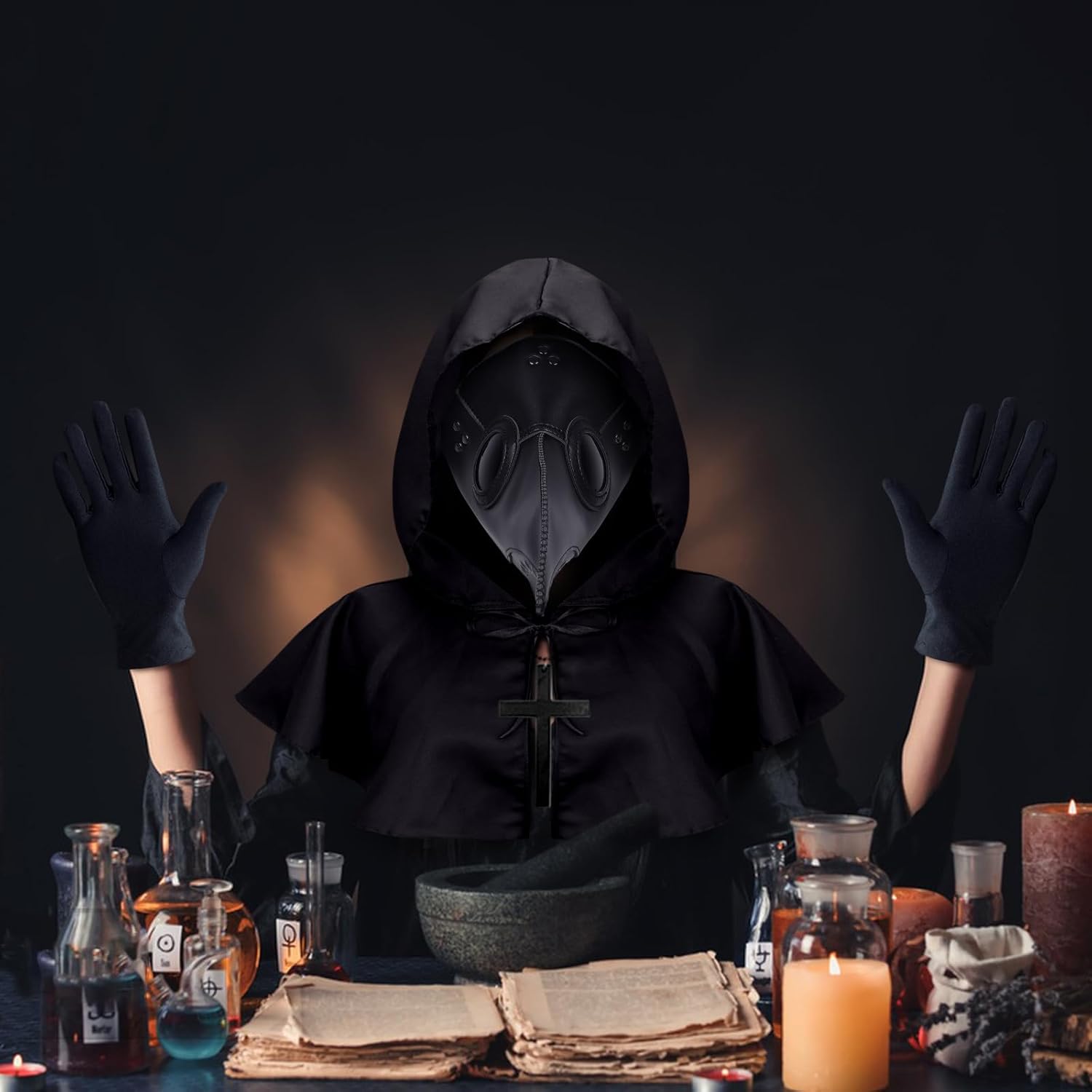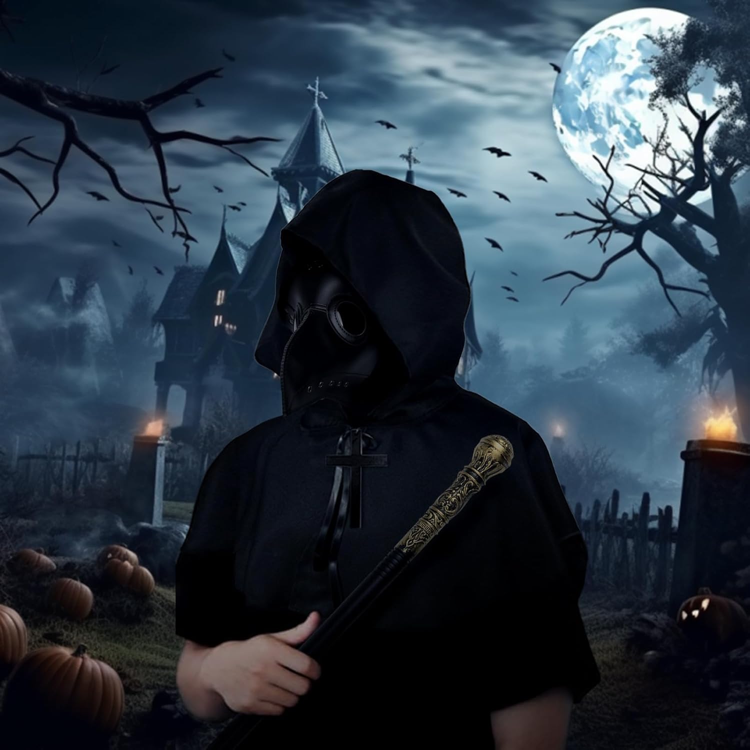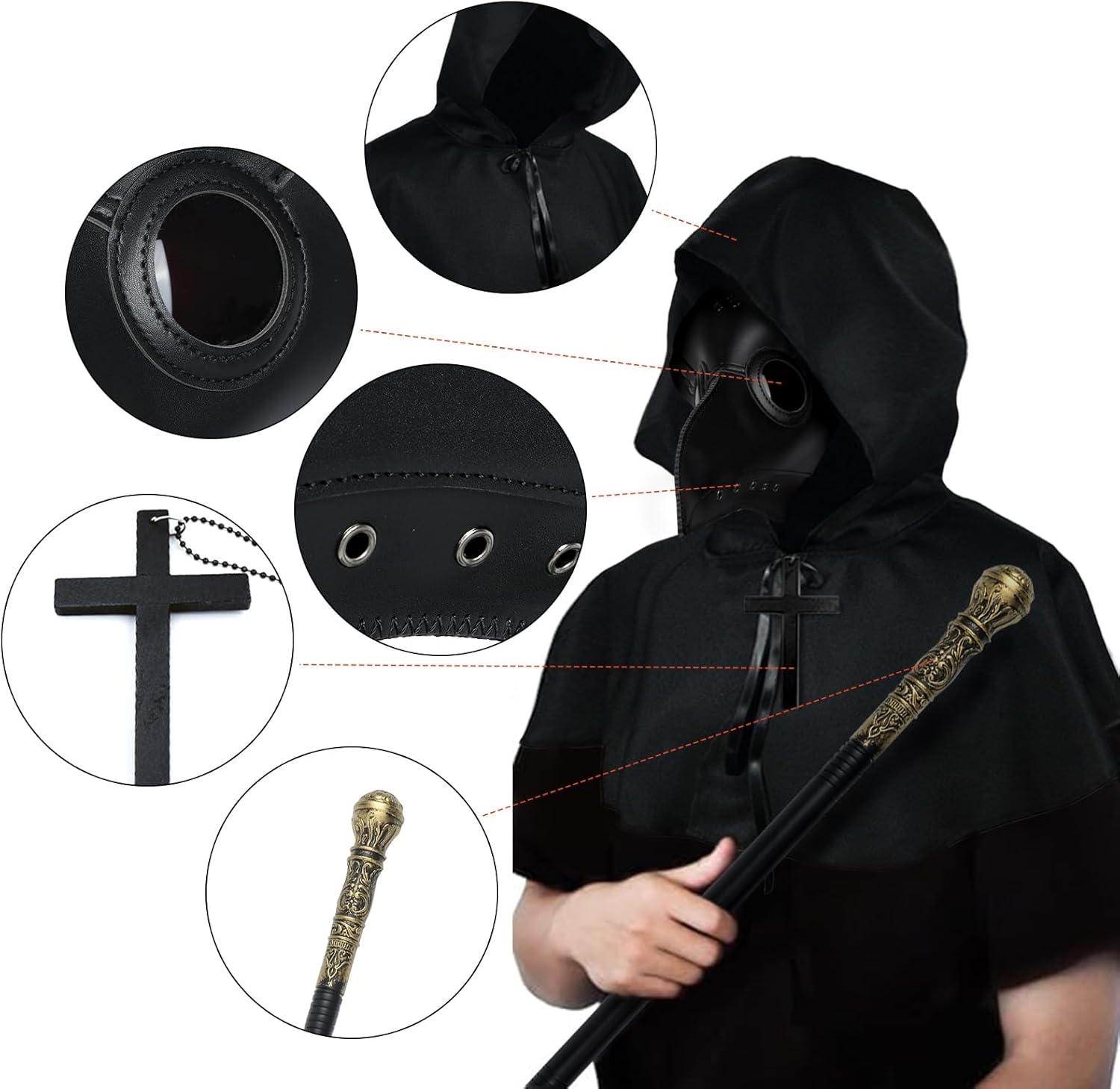 Descrizione prodotto Caratteristiche: 1. Questo set completo viene fornito con tutto il necessario per trasformarsi in un temibile medico della peste, completo di maschera di Halloween, mantello nero con cappuccio, guanti neri, collana crocifissione, scettro e maschera integrale. 2. Il naso lungo uccello becco Steampunk Mask stato progettato in un vapore punk Peste Doctor stile, con fori per gli occhi neri e cinghie regolabili per una vestibilità comoda. 3. E con i guanti neri, lo scettro e la maschera di Halloween fantasma inclusi, avrai tutti gli oggetti di scena per costume di Halloween di cui hai bisogno per colpire la paura nei cuori dei tuoi compagni di festa. 4. Sia che tu stia cercando di impressionare a una festa di Halloween, o semplicemente per aggiungere un tocco spettrale al tuo guardaroba, questo costume da medico della peste è la scelta perfetta per te. Avviso di sicurezza Per evitare il pericolo di soffocamento, tenere questo sacchetto di plastica lontano da frombabie e bambini