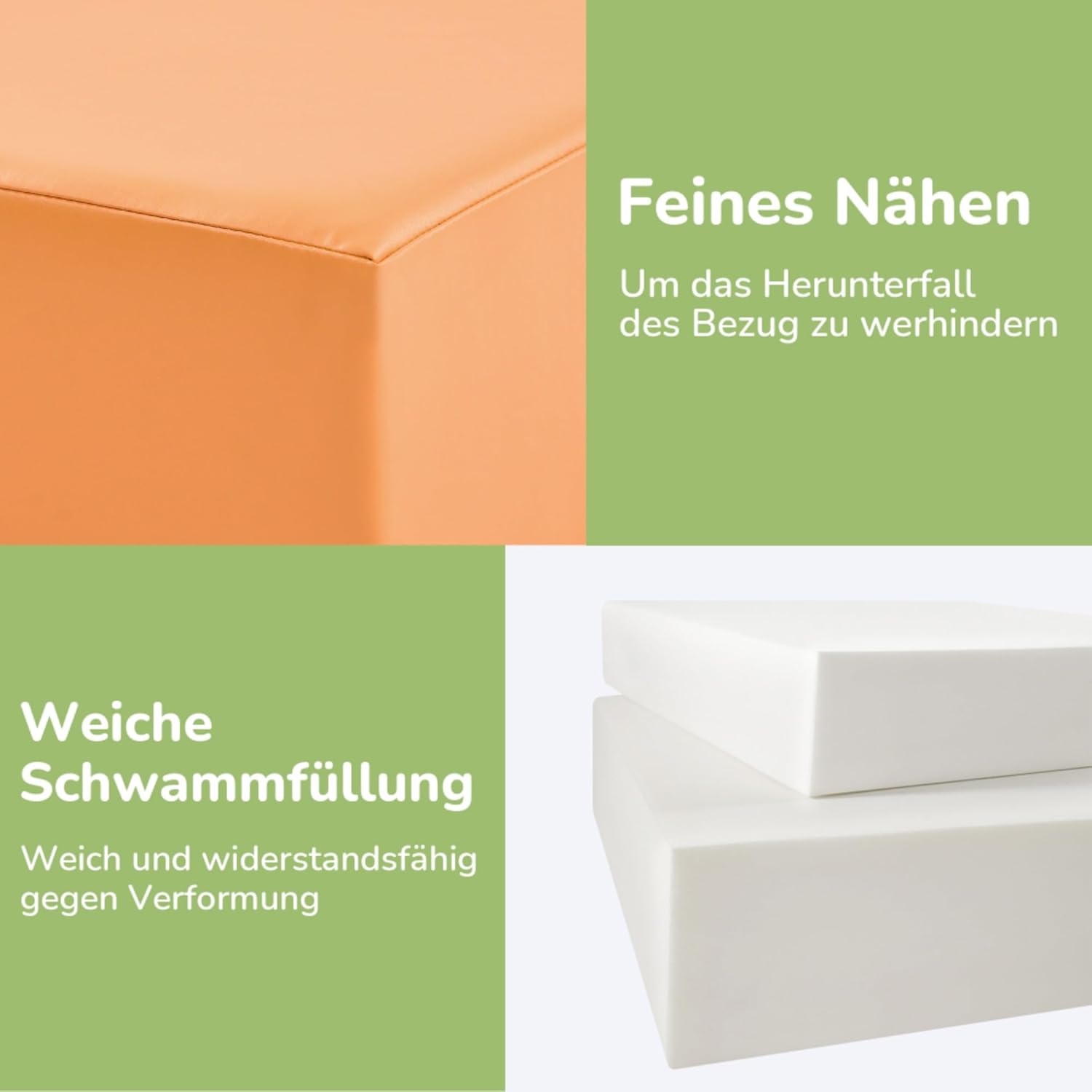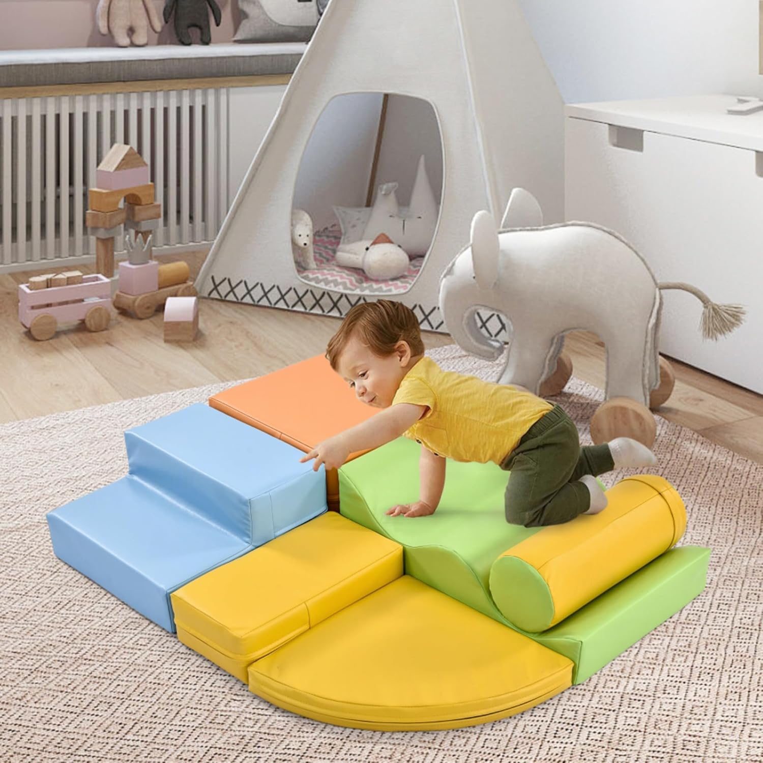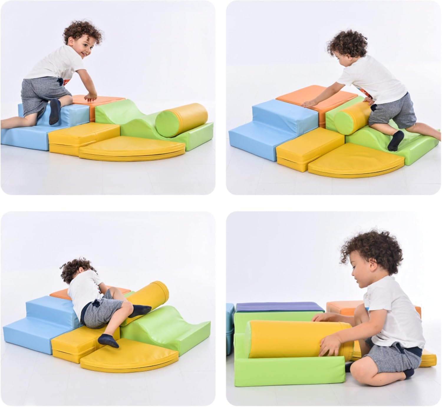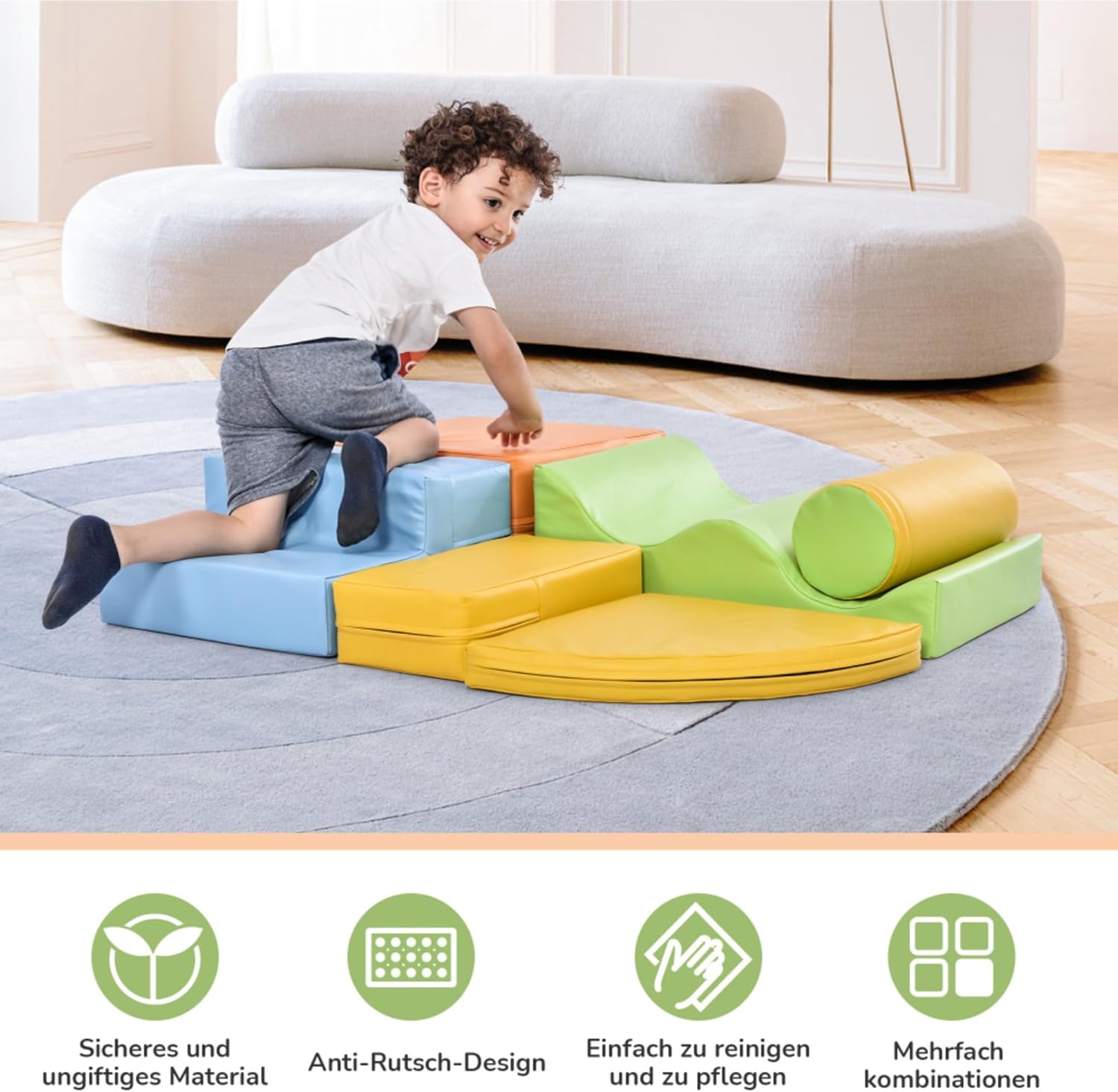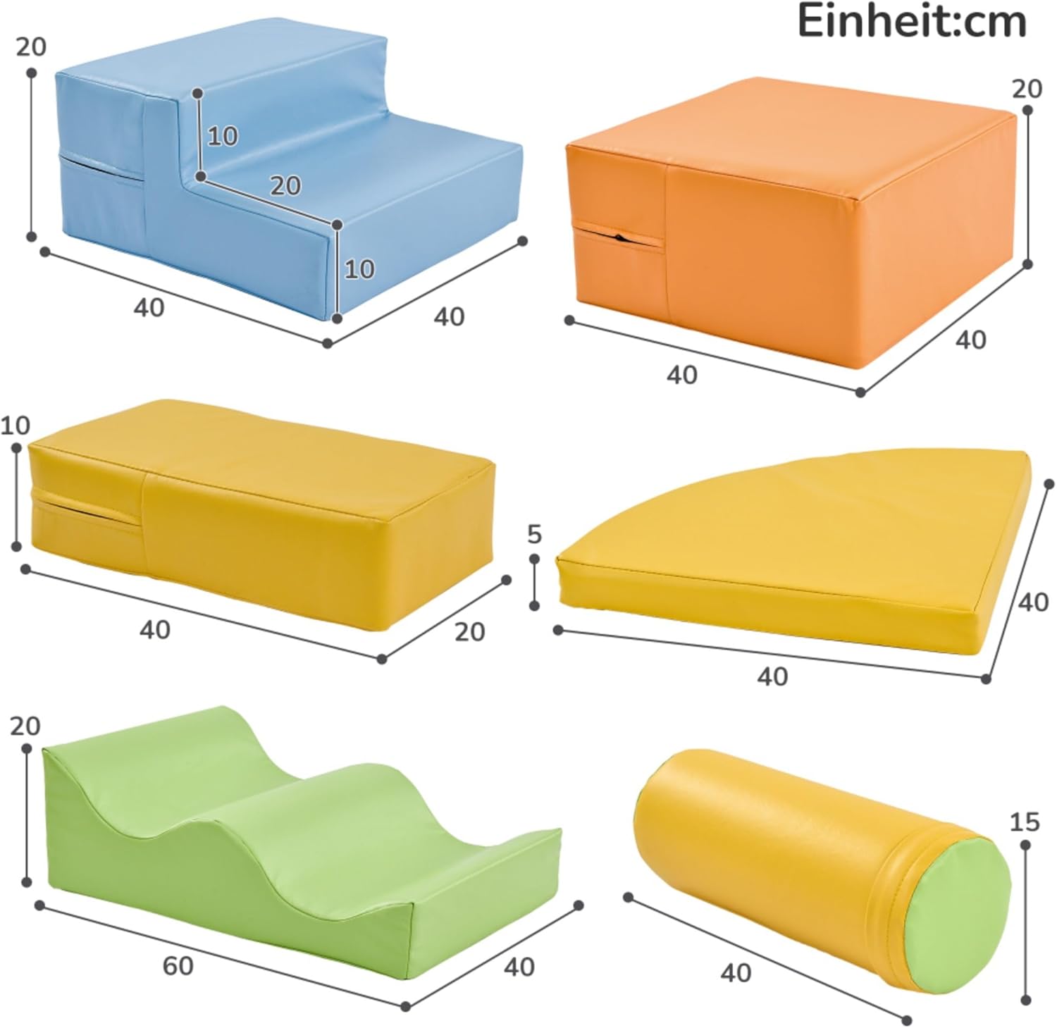 Design multifunzionale: questo set da gioco è composto da 6 diverse forme, che possono essere combinate liberamente per costruire strutture versatili per arrampicarsi e gattonare. Sia come scivolo, gradini o tunnel, i bambini sperimentano scenari creativi di movimento, promuovono la loro autonomia e sviluppano la loro immaginazione e le capacità motorie grossolane durante il gioco. Materiale testato per la sicurezza: per la massima sicurezza nel gioco, questo set è realizzato in morbida schiuma certificata EN71, delicata sulla pelle e offre protezione ai bambini durante il gioco. La superficie in poliuretano garantisce un gioco antiscivolo e previene gli infortuni: un compagno affidabile nella vita quotidiana dei bambini e ideale per lo sviluppo della prima infanzia. Facile da pulire: la superficie in poliuretano è impermeabile e facile da pulire, in modo da poter rimuovere facilmente lo sporco con un panno umido. Nessun lavaggio richiesto: ideale per i genitori che cercano ambienti di gioco igienici e preferiscono una pulizia rapida. Pratico per interni in soggiorno, camera dei bambini o area giochi. Imbottitura in morbida schiuma: dotata di nucleo in schiuma elastica e indeformabile, tutte le parti mantengono la loro forma anche in caso di uso frequente. Che si tratti di seduti, sdraiati o arrampicati, la morbida imbottitura ammortizza ogni movimento e offre comfort e sicurezza per i piccoli esploratori. Sistema in velcro antiscivolo: grazie alla chiusura in velcro integrata, i moduli possono essere collegati in modo sicuro tra loro e non si spostano durante il gioco. Il design antiscivolo offre al tuo bambino una presa aggiuntiva, sia durante l'arrampicata che lo scivola, un concetto di sicurezza ben studiato per un gioco attivo. Varietà di dimensioni incluse: il set include: blocco ondulato (60 × 20 × 40 cm), cubo (40 × 40 × 20 cm), scale (40 × 20 × 10 cm), piccolo rettangolo (40 × 20 × 40 × 40 cm) e cilindro (40 × 15 cm). Le misure coordinate consentono di creare stili creativi che si adattano alle dimensioni del bambino. Valore pedagogico: favorisce giocosamente lo sviluppo motorio, la percezione del corpo e il controllo dell'equilibrio dei bambini. Ideale per gattonare, kite o a casa – ideale per aiutare l'apprendimento attraverso l'esercizio fisico e il gioco.
