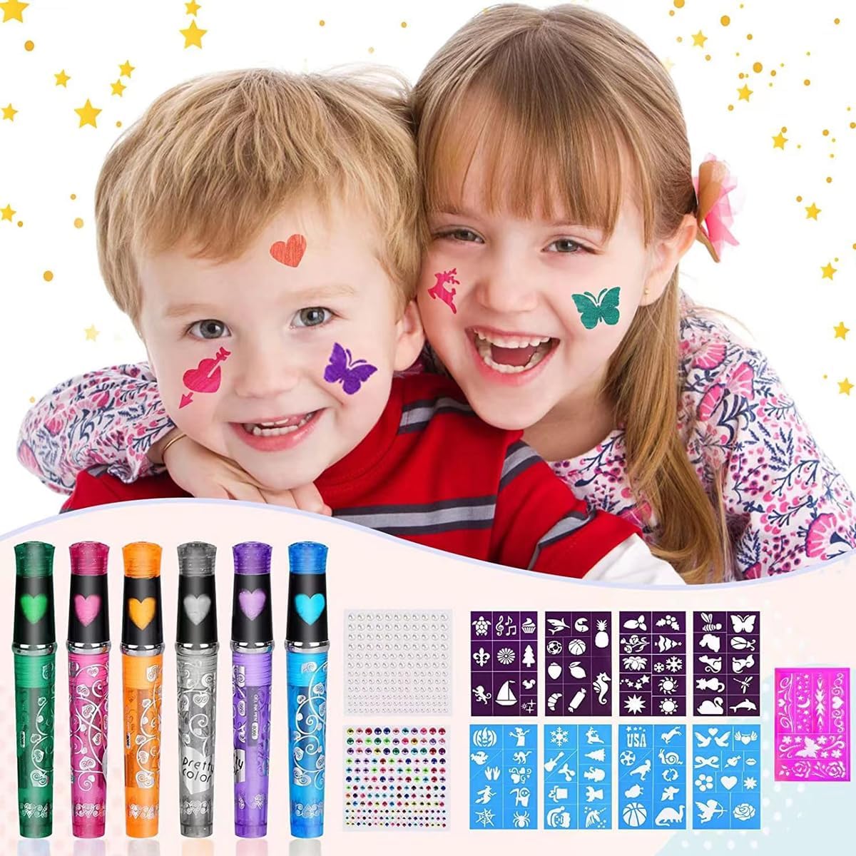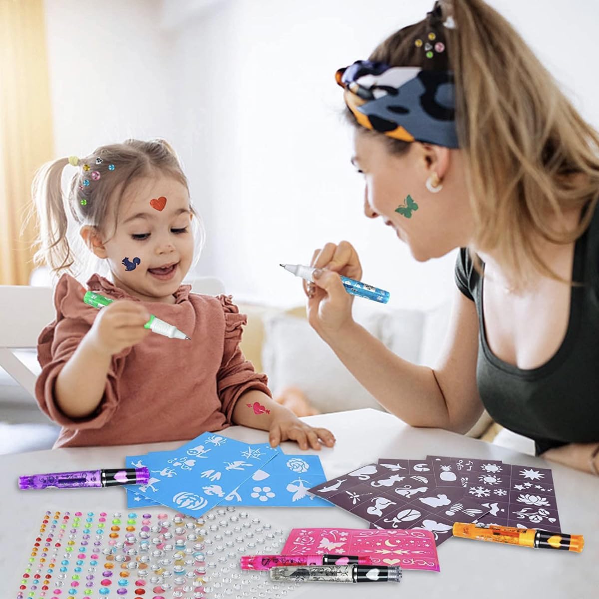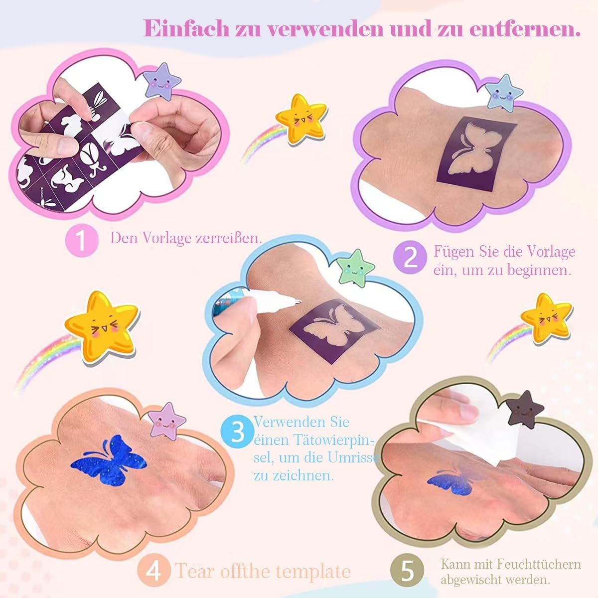 【Matite per tatuaggi per bambini】: il set di penne per tatuaggi glitterati contiene 6 matite colorate per tatuaggi per bambini, 9 stencil con motivo, 2 fogli con pietra preziosa. Scatena la creatività di tuo figlio! Lasciate che i bambini mostrino la loro personalità e immaginazione, godetevi il divertimento del tatuaggio! Set di 6 colori glitterati per tatuaggi: verde, rosa, arancione, argento, viola e blu. Le penne per tatuaggi per la pelle con glitter aggiungono brillantezza e colore a qualsiasi disegno. Questa versatile penna per tatuaggi glitterata può essere utilizzata anche per decorare carta e altri materiali. Tatuaggi colorati che ti rendono il punto forte della festa in un batter d'occhio. Sicuri e delicati sulla pelle: le divertenti matite per tatuaggi durano circa 2-3 giorni, sono realizzate con inchiostro vegetale atossico, innocuo per la pelle, impermeabile e resistente al sudore, gemme colorate con forte adesione e buona lucentezza. Conforme alle norme UE. 【Stencil creativi】: lo stencil è dotato di diversi motivi, basta inserirlo e colorarlo con una penna gel per tatuaggi. I brillantini autoadesivi hanno colori vivaci e alta lucentezza, incollalo sul corpo e ti rendono unico. Multiuso: le matite per tatuaggi possono essere applicate su viso, braccia, spalle, gambe, polsi, petto, vita, ecc. Tatuaggio temporaneo per bambini come regalo di compleanno dei bambini, per la scuola, la famiglia, per feste in maschera, Halloween, Natale, carnevale, feste, ecc.