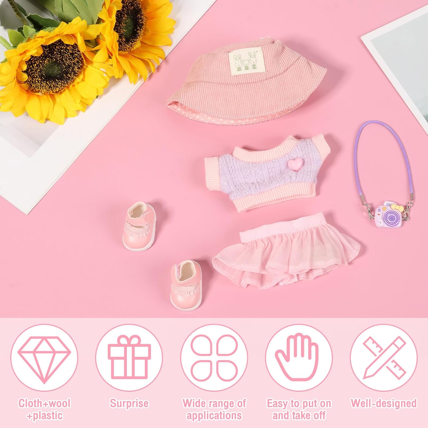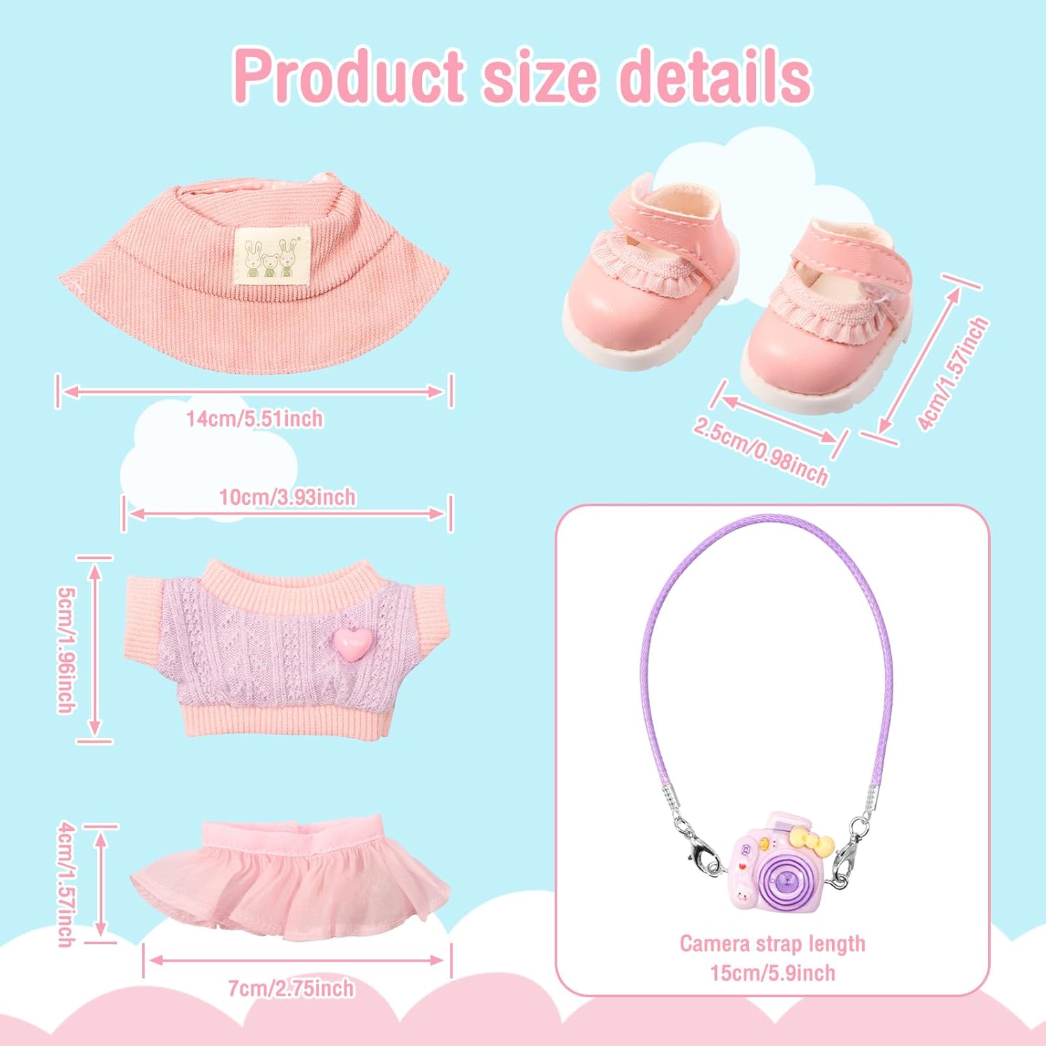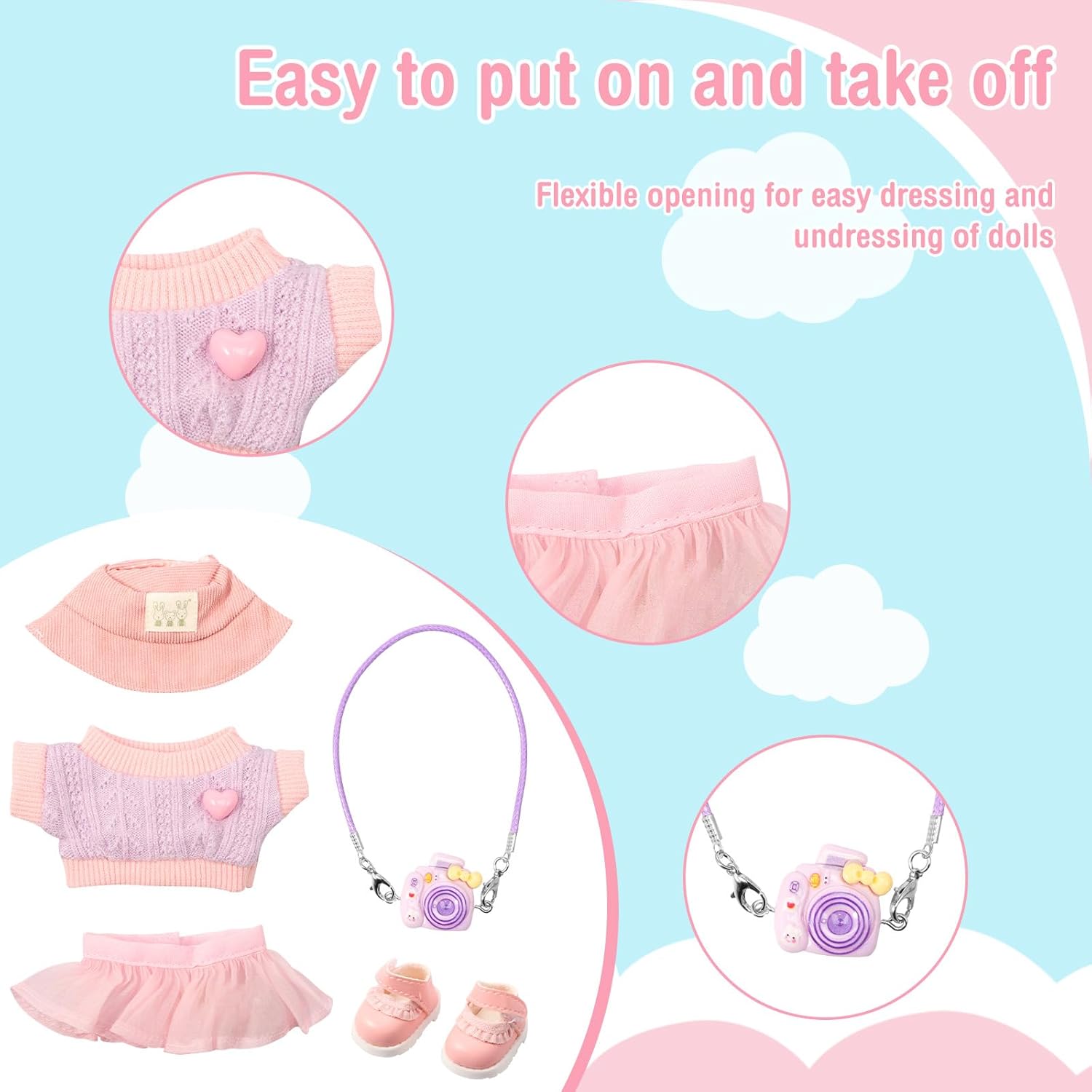 Contenuto del set: questo set di abbigliamento per bambole include 1 cappello, 1 maglione, 1 gonna, 1 modello di fotocamera (non reale), 1 paio di scarpe da abbinare alla tua bambola e aggiungere fascino. Nota: bambola non inclusa. Squisita fattura: questo set di abbigliamento per bambole è accuratamente progettato con tessuto di alta qualità, lana e plastica per garantire resistenza e comfort per una lunga durata. Scelta regalo ideale: questo set di vestiti per bambole è una scelta regalo ideale per i tuoi amici e parenti durante le vacanze o i compleanni. Facile da indossare e da togliere: questo set di abbigliamento per bambole è progettato con praticità in mente, dotato di aperture flessibili che rendono facile indossare e togliere la bambola. Applicazione versatile: questo set di accessori per bambole è adatto per bambole da 15 cm e 17 cm o altre bambole carine, non solo come decorazioni per la casa, regali per feste, ma anche come grazioso accessorio da tavolo o auto.