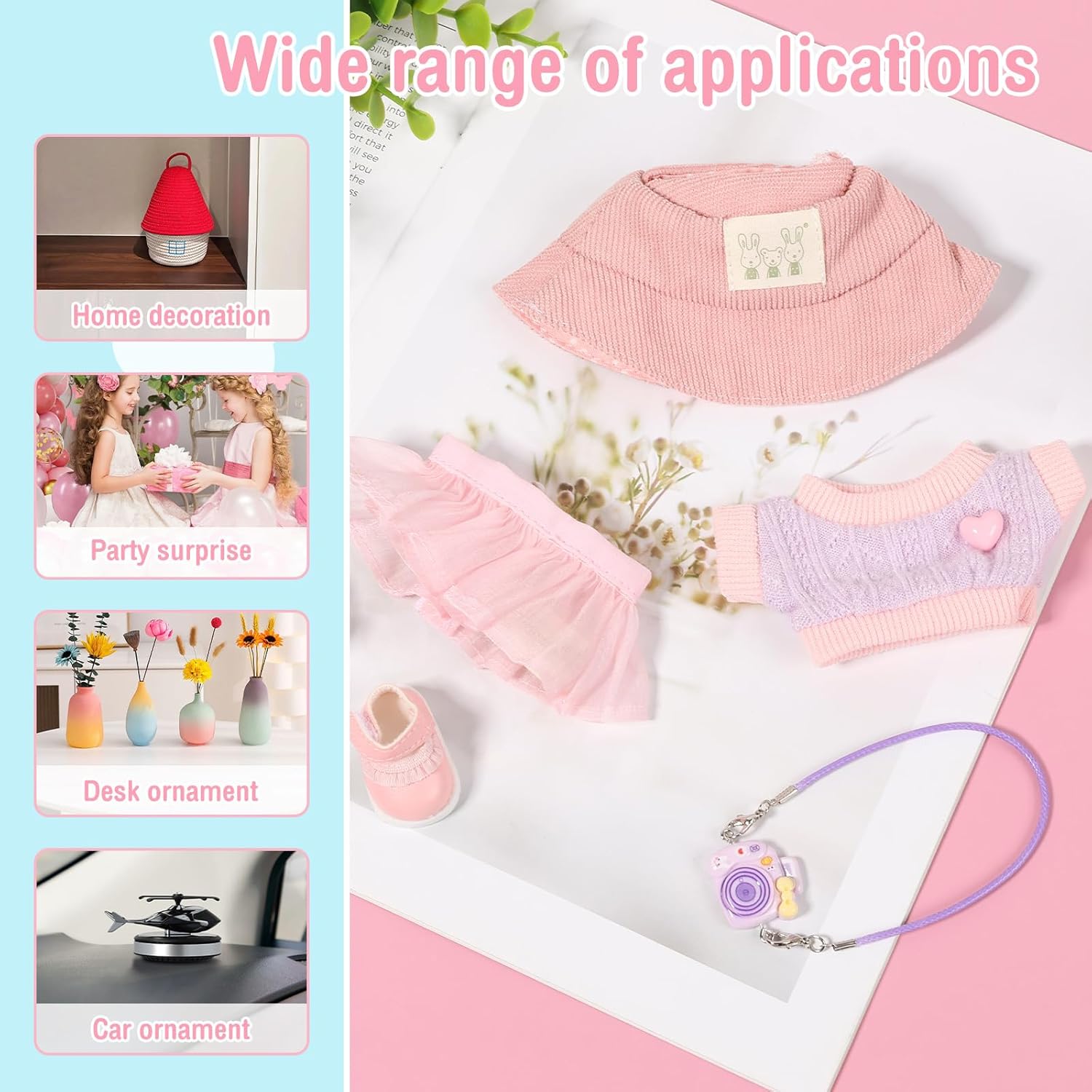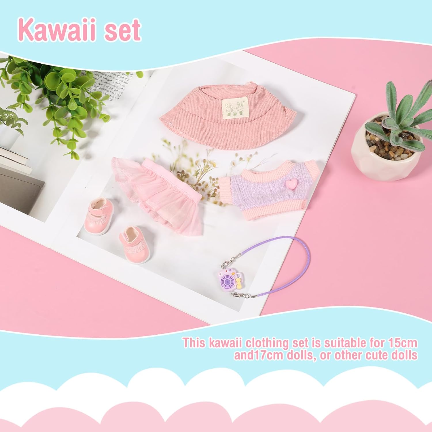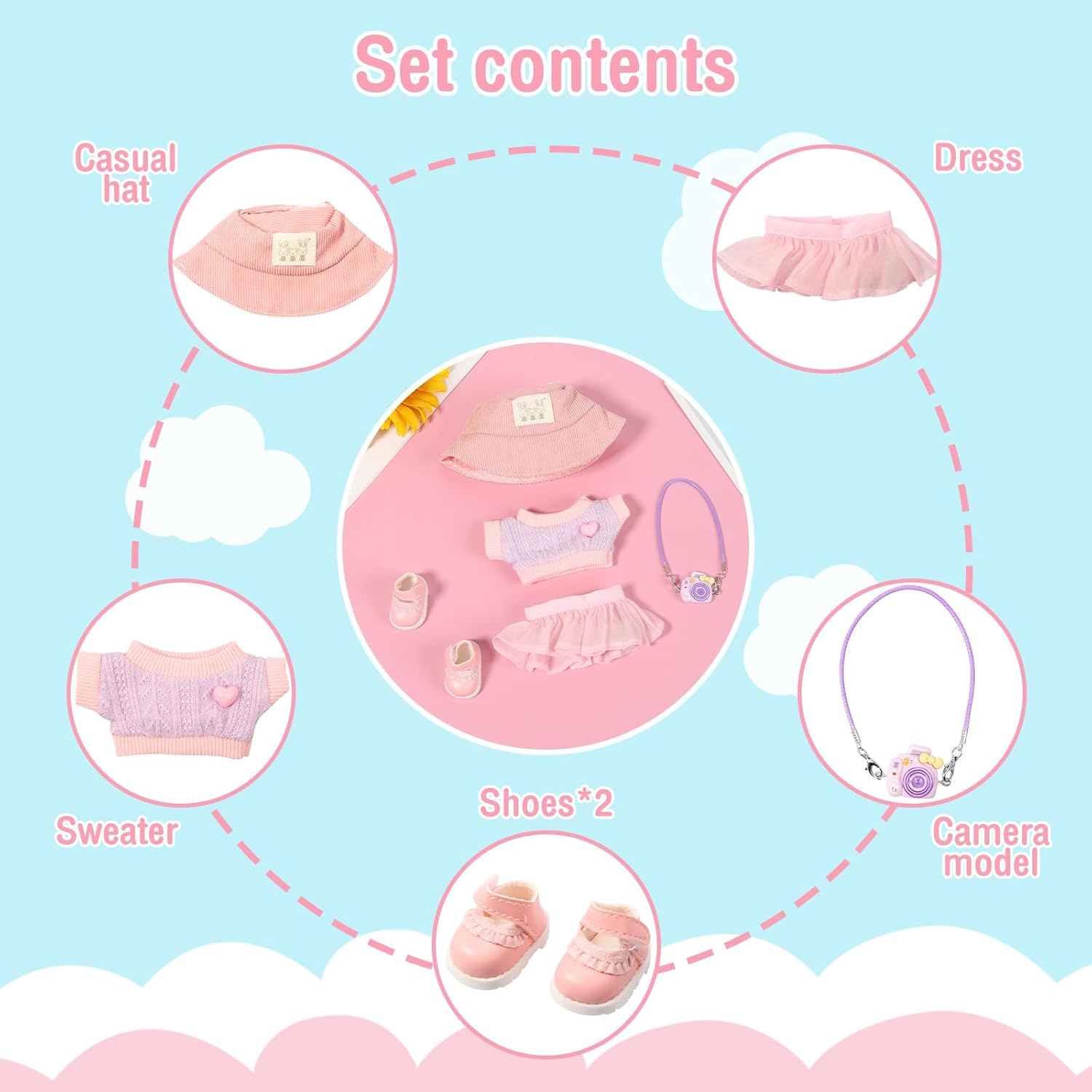 Contenuto del set: questo set di abbigliamento per bambole include 1 cappello, 1 maglione, 1 gonna, 1 modello di fotocamera (non reale), 1 paio di scarpe da abbinare alla tua bambola e aggiungere fascino. Nota: bambola non inclusa. Squisita fattura: questo set di abbigliamento per bambole è accuratamente progettato con tessuto di alta qualità, lana e plastica per garantire resistenza e comfort per una lunga durata. Scelta regalo ideale: questo set di vestiti per bambole è una scelta regalo ideale per i tuoi amici e parenti durante le vacanze o i compleanni. Facile da indossare e da togliere: questo set di abbigliamento per bambole è progettato con praticità in mente, dotato di aperture flessibili che rendono facile indossare e togliere la bambola. Applicazione versatile: questo set di accessori per bambole è adatto per bambole da 15 cm e 17 cm o altre bambole carine, non solo come decorazioni per la casa, regali per feste, ma anche come grazioso accessorio da tavolo o auto.