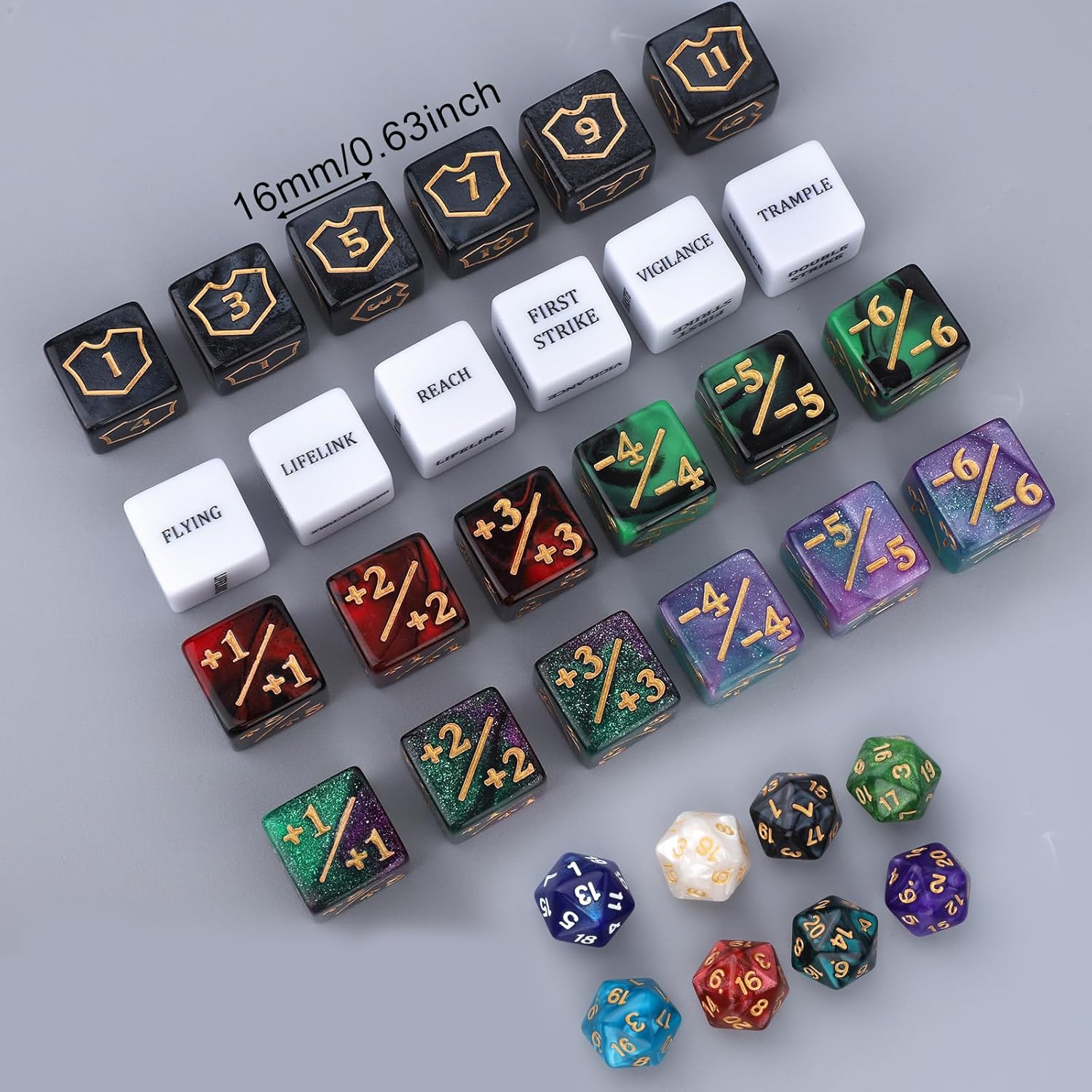 Contenuto del pacchetto: riceverai 5 contatori di dadi (1-6) e 5 contatori di dadi (7-12), 10 dadi di parole chiave MTG bianche MTG con abilità come calpestio, primo sciopero, volo e altro ancora. Inoltre, ottieni contatori da 20 +1 a +6, contatori da 20 -1 a -6 e dadi D20 da 20mm e 1 busta di stoccaggio di velluto, rendendolo l'accessorio definitivo per qualsiasi MTG o Card Game appassionato. Materiale del prodotto: questi contatori di dadi MTG sono realizzati in acrilico premium. Sono superfici leggere ma resistenti e resistenti ai graffi mantengono la chiarezza attraverso migliaia di ore di gioco. Dimensione del prodotto: ogni dadi MTG D6 in questo set ha un diametro di circa 16mm, significativamente più grande dei dadi standard 12mm. Questa maggiore dimensione garantisce una migliore visibilità durante il gameplay, rendendo più facile tenere traccia di contatori e rotoli, specialmente nei momenti di alto livello. Multiple Counter Options: il set include da 20 a +6 contatori e da 20 -1 a -6 contatori, perfetti per contrassegnare gli appassionati, i debuff o altre modifiche di gioco. Questi contatori ti danno un tracciamento preciso per punti di vita, abilità e condizioni durante i momenti di gioco più intensi. Ideale per le serate di gioco: questo bancone di dadi MTG è perfetto sia per le serate di gioco casuali con amici e tornei competitivi. Sia che tu stia monitorando i totali della vita, aggiungendo buff al tuo mazzo comandante o segnando parole chiave come calpestio e volo, questo set fornisce la precisione e la funzionalità necessarie per tutti i tipi di gameplay.