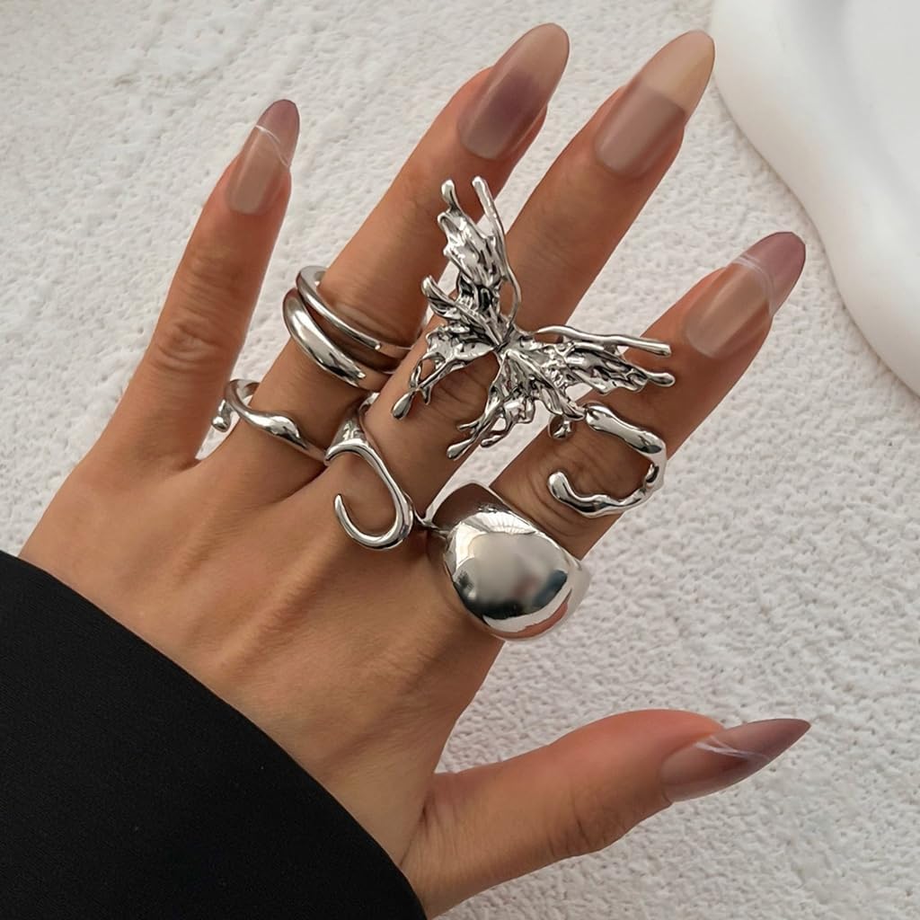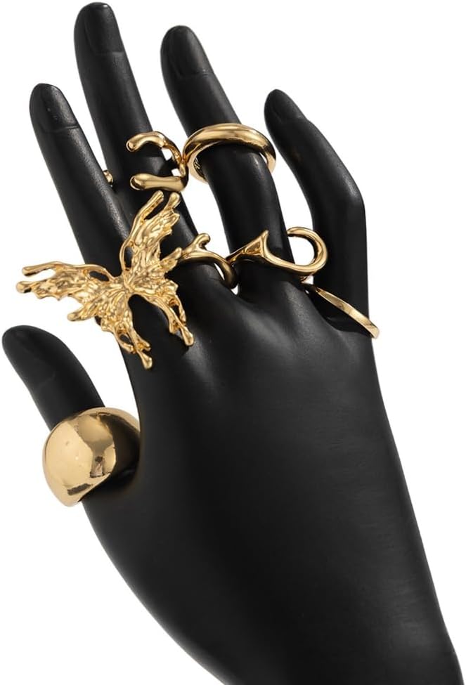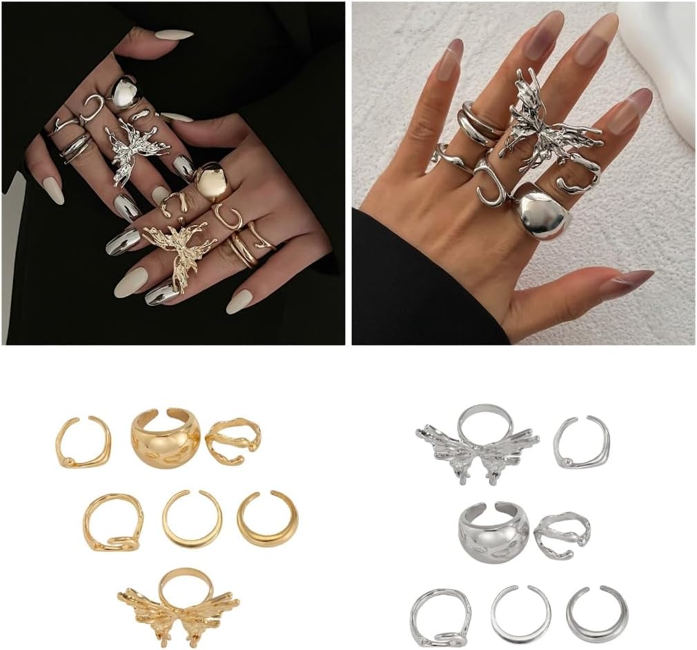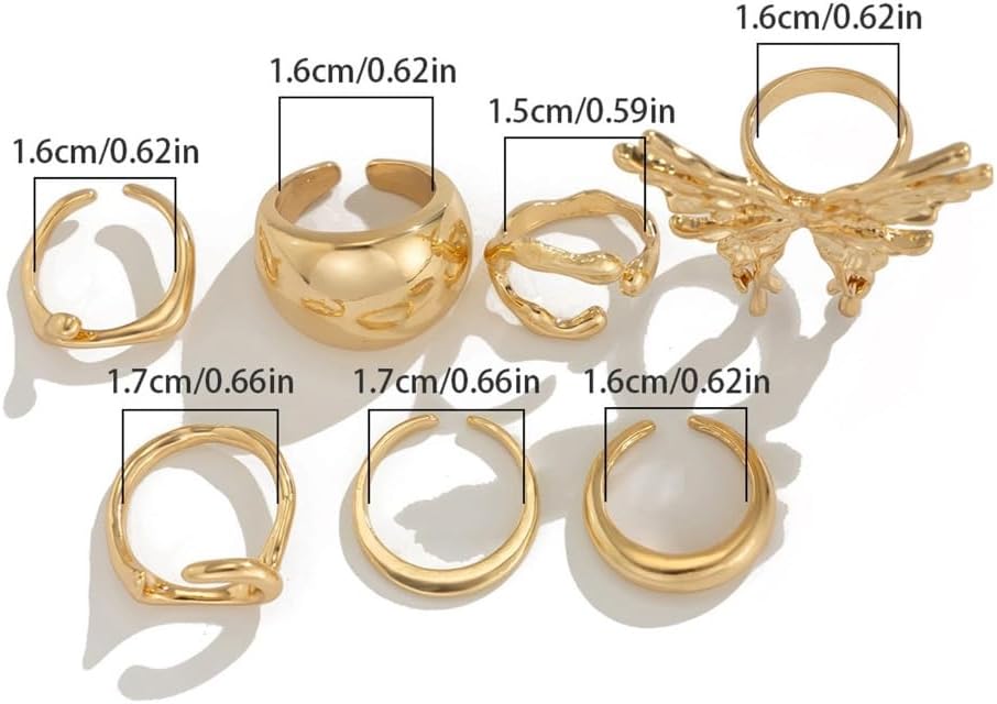 Caratterizzato da un sottile tono oro, questo set di 7 anelli offre versatilità nello stile; da indossare singolarmente o mescolare per soddisfare varie preferenze di moda Perfetto per le donne sulle tendenze della moda e ama esprimere la loro individualità attraverso gioielli distintivi Scopri il fascino unico del nostro set di anelli a forma di farfalla lavata liquida, dove i disegni lavaed fluidi incontrano la delicata farfalla per una dichiarazione davvero alla moda Da indossare tutti i giorni, per feste, questi anelli migliorano il tuo look generale, aggiungendo eleganza e stile a ogni occasione Migliora la tua collezione di accessori con questo set di anelli alla moda, design per integrarsi perfettamente nel tuo guardaroba evidenziando i tuoi stili personalizzati