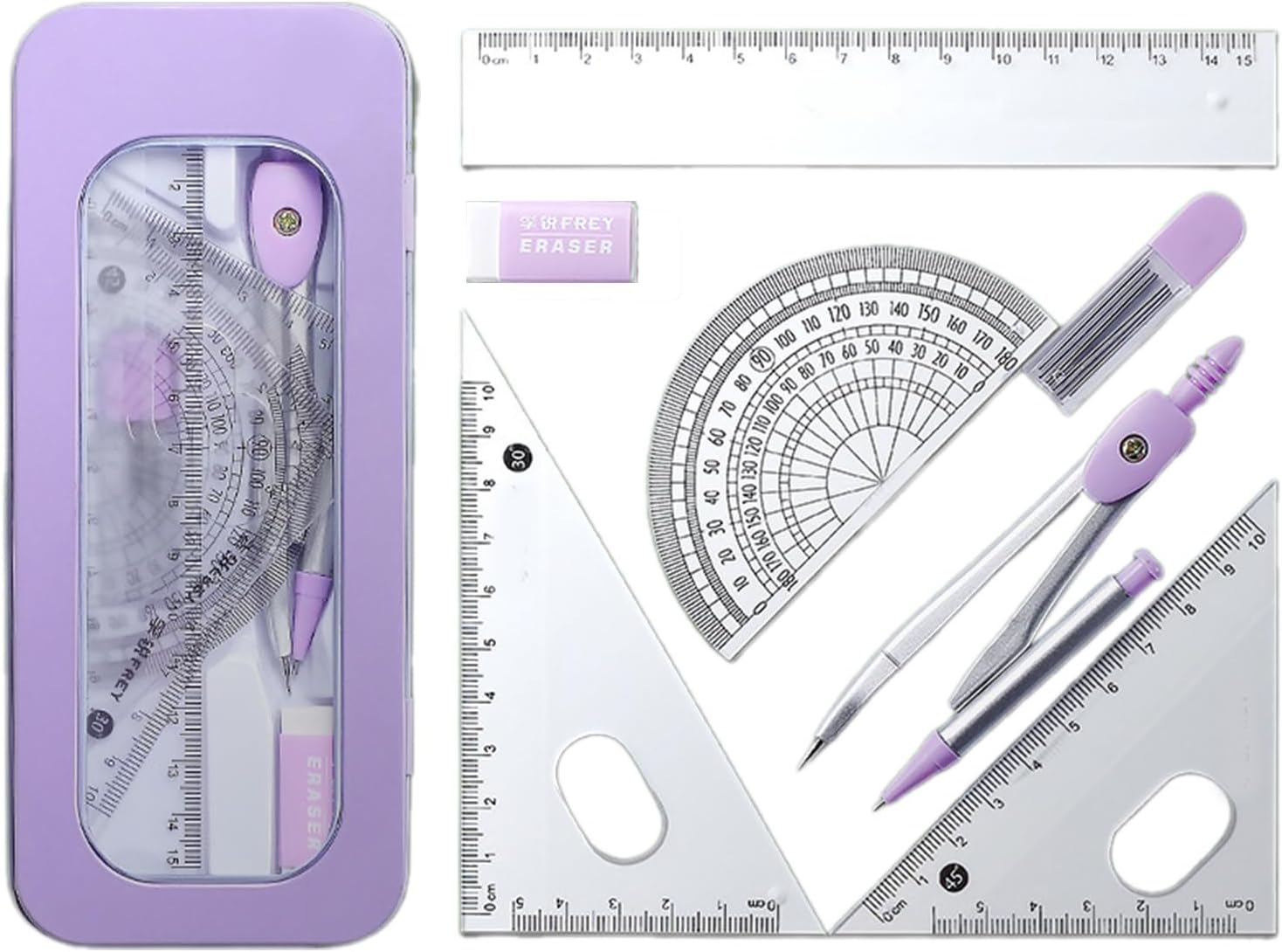 Realizzato in polipropilene e metallo, facile misurazione. Ogni righello quadrato e goniometro matematico con scala chiara. La custodia per proteggere e riporre gli strumenti geometrici in zaini, borse per la scuola, borsa per libri La confezione contiene: 1 strumento per geometria in metallo, 1 quadrato da 30°/60°, 1 quadrato a 45°, 1 righello dritto, 1 goniometro matematico a 180 gradi, 1 scatola di ricariche per matite da 0,7 mm, 1 gomma da cancellare, 1 custodia Ideale per matematica, geometria, arte, disegno, lavorazione del legno e disegno. Facile da portare a lezioni di matematica e conservare in classe Set di strumenti professionali per geometria matematica, adatto per architetti, ingegneri, artisti, designer, studenti, insegnanti Lo strumento di disegno geometrico in metallo può disegnare fino a 23 cm di diametro. Lo strumento di geometria con parte bruscamente deve essere usato con attenzione e posizionato lontano dal bambino
