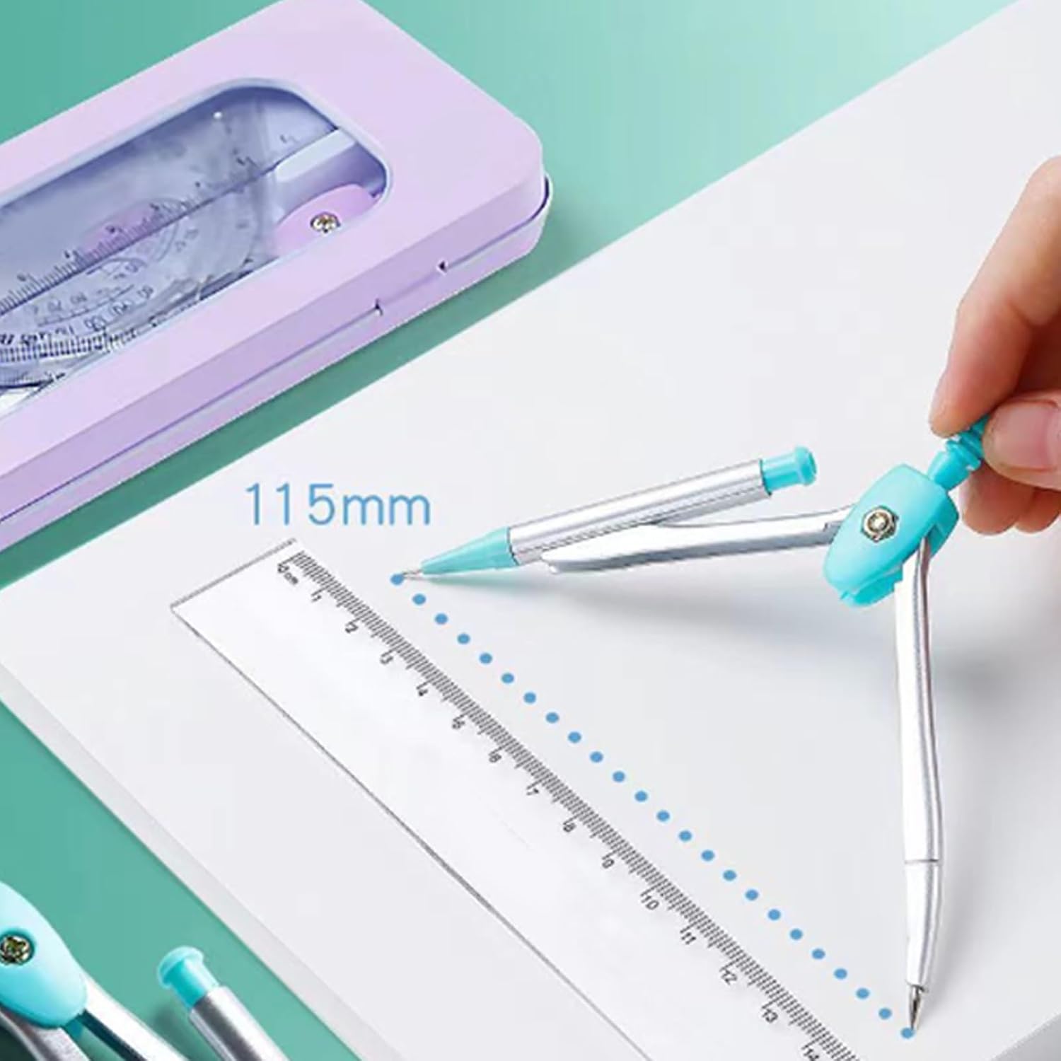 Set di 7 strumenti per geometria scolastica per studenti, tra cui strumento per geometria in metallo, set quadrato, gomma, goniometro, custodia