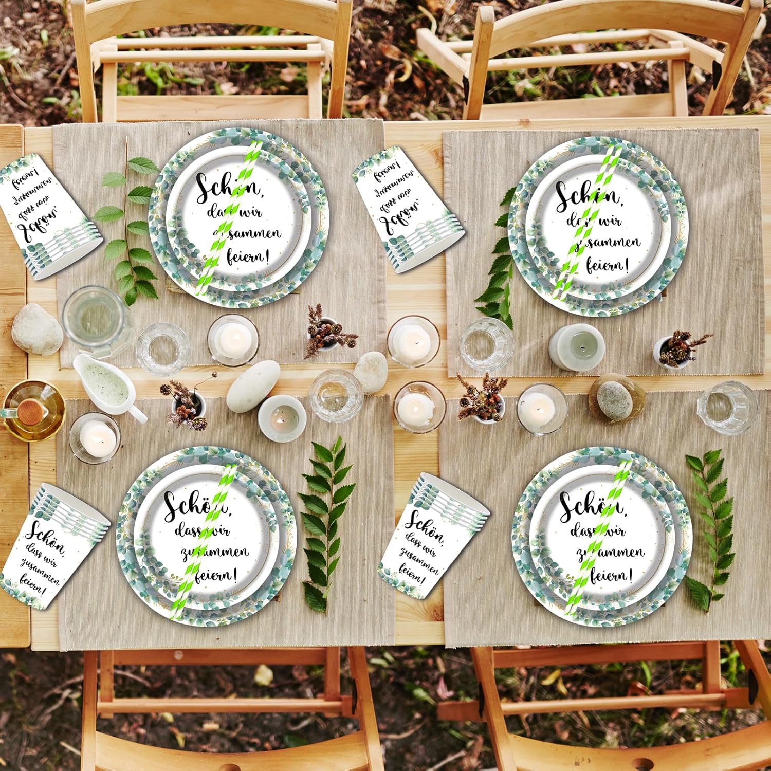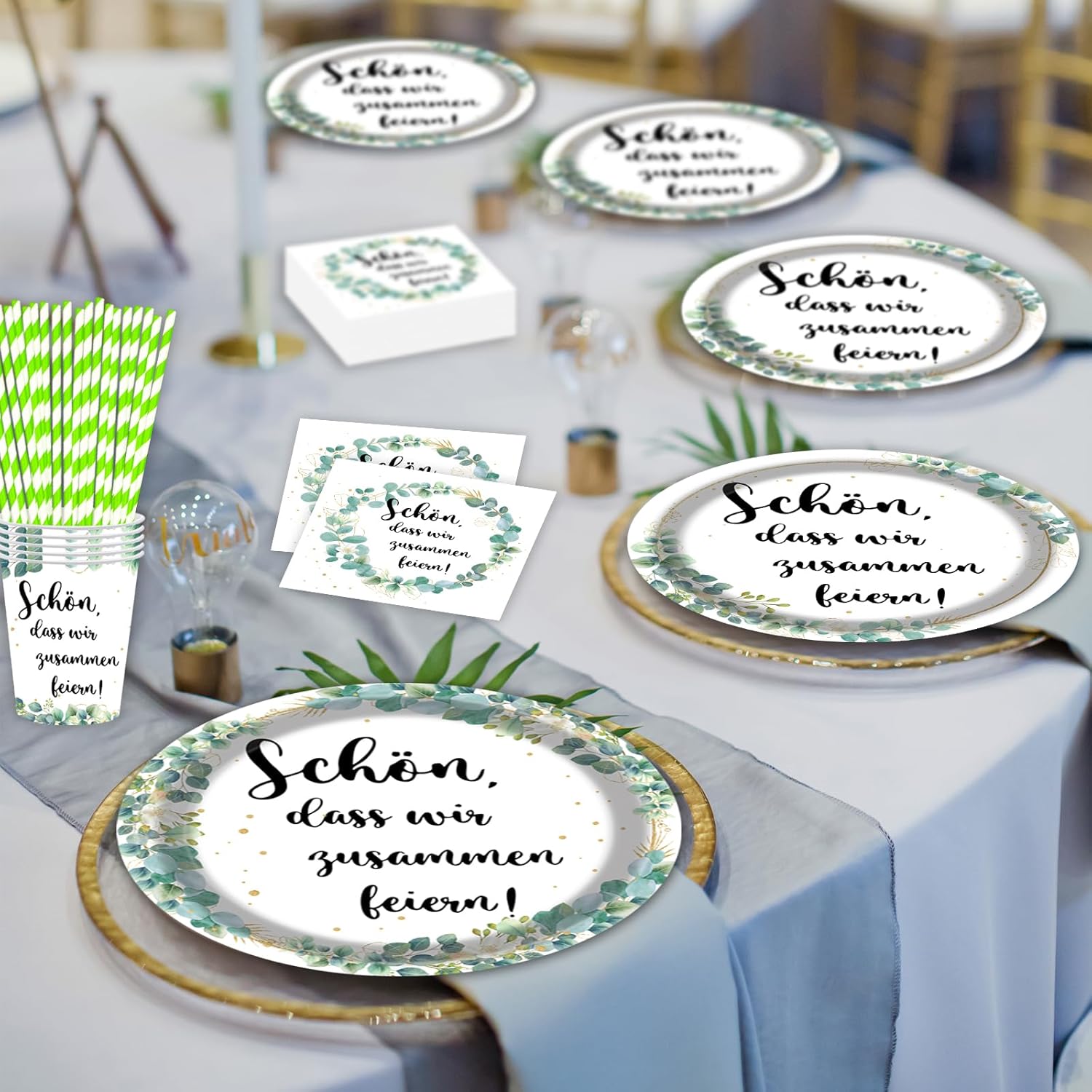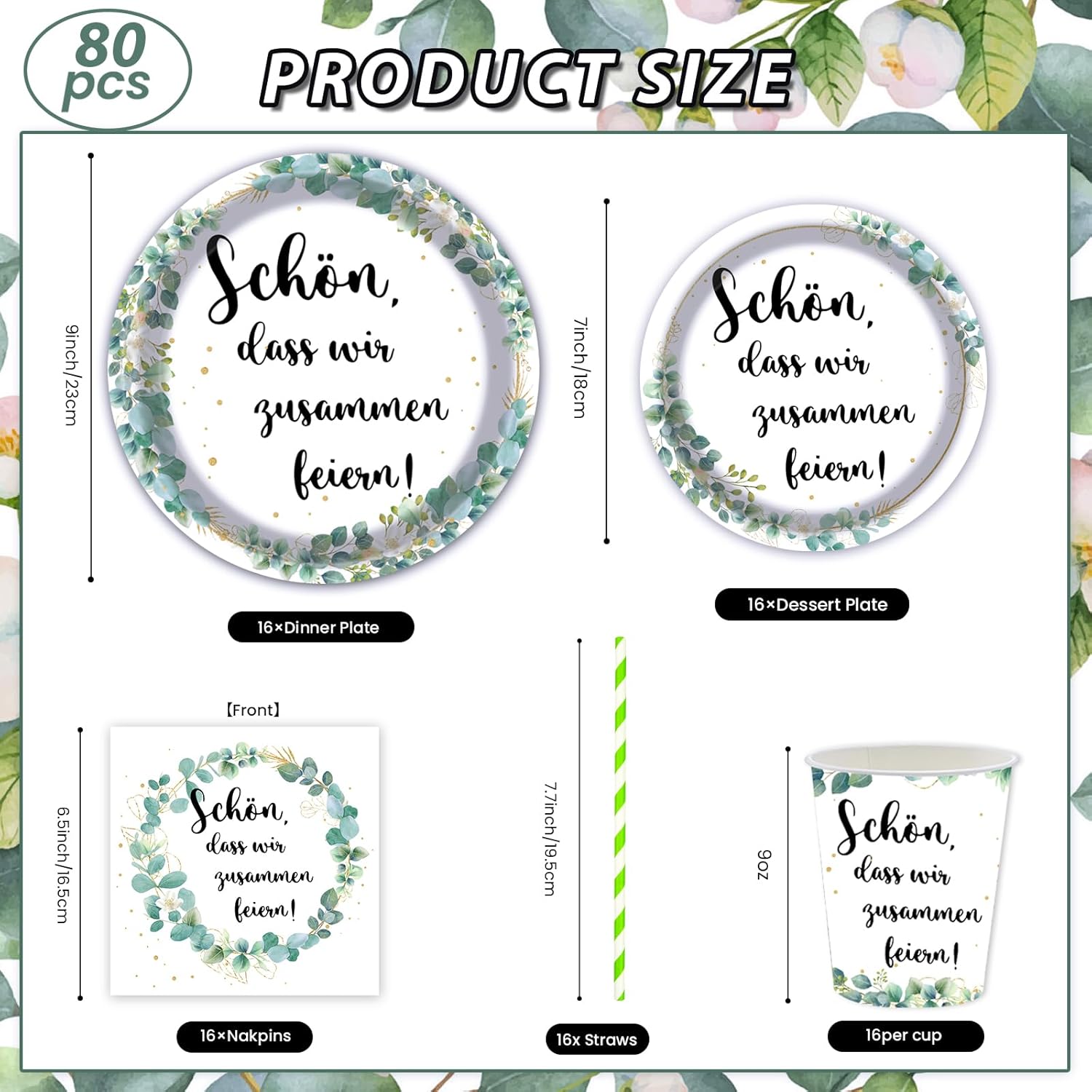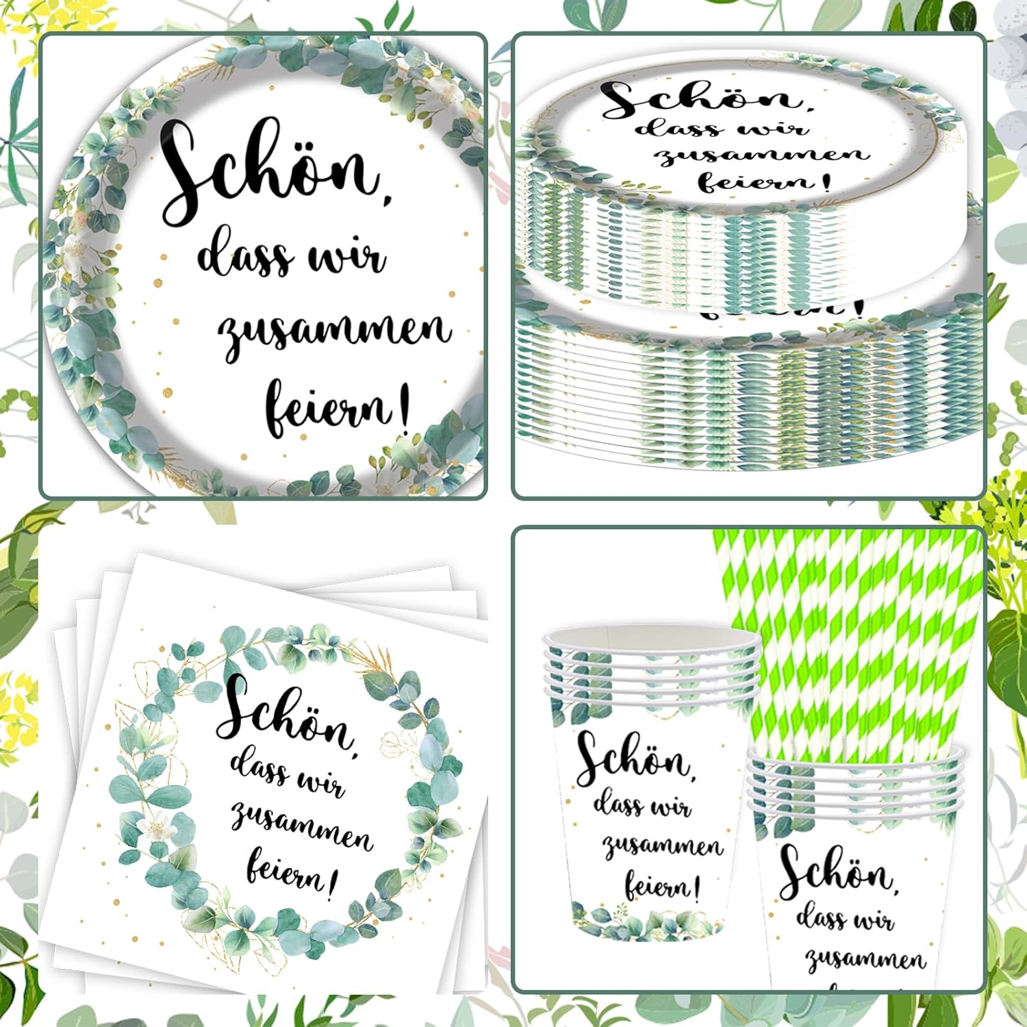 Set di stoviglie per feste di compleanno con eucalipto: la confezione contiene 16 piatti di carta da 23 cm, 16 piatti da 18 cm, 16 tazze, cannucce di carta, 16 tovaglioli e 16 bicchieri di carta. Questo compleanno è perfetto per baby shower party. 【Piatti di carta di alta qualità】: il nostro set di stoviglie per feste è realizzato in carta alimentare resistente e resistente. I piatti sono stabili e durevoli, sono adatti per vari cibi e non si deformano facilmente. Le tovaglie sono impermeabili e resistenti agli strappi. 【Design elegante】: i piatti di carta, bicchieri e tovaglioli del nostro set di stoviglie per feste sono stampati con diversi motivi! Con il nostro set di stoviglie per feste è possibile creare un'atmosfera elegante per le feste. Risparmia tempo: dopo aver utilizzato il nostro set di piatti di carta usa e getta, puoi semplicemente gettarlo nella spazzatura per risparmiare tempo per la pulizia. Così avrete più tempo per festeggiare e godervi la festa con la famiglia e gli amici. 【Adatto per ogni occasione】: il nostro set di stoviglie di compleanno è molto popolare tra i bambini ed è adatto per feste, baby shower, feste di famiglia, Natale, Halloween, feste di compleanno per ragazzi e ragazze e per tutti i tipi di celebrazioni.