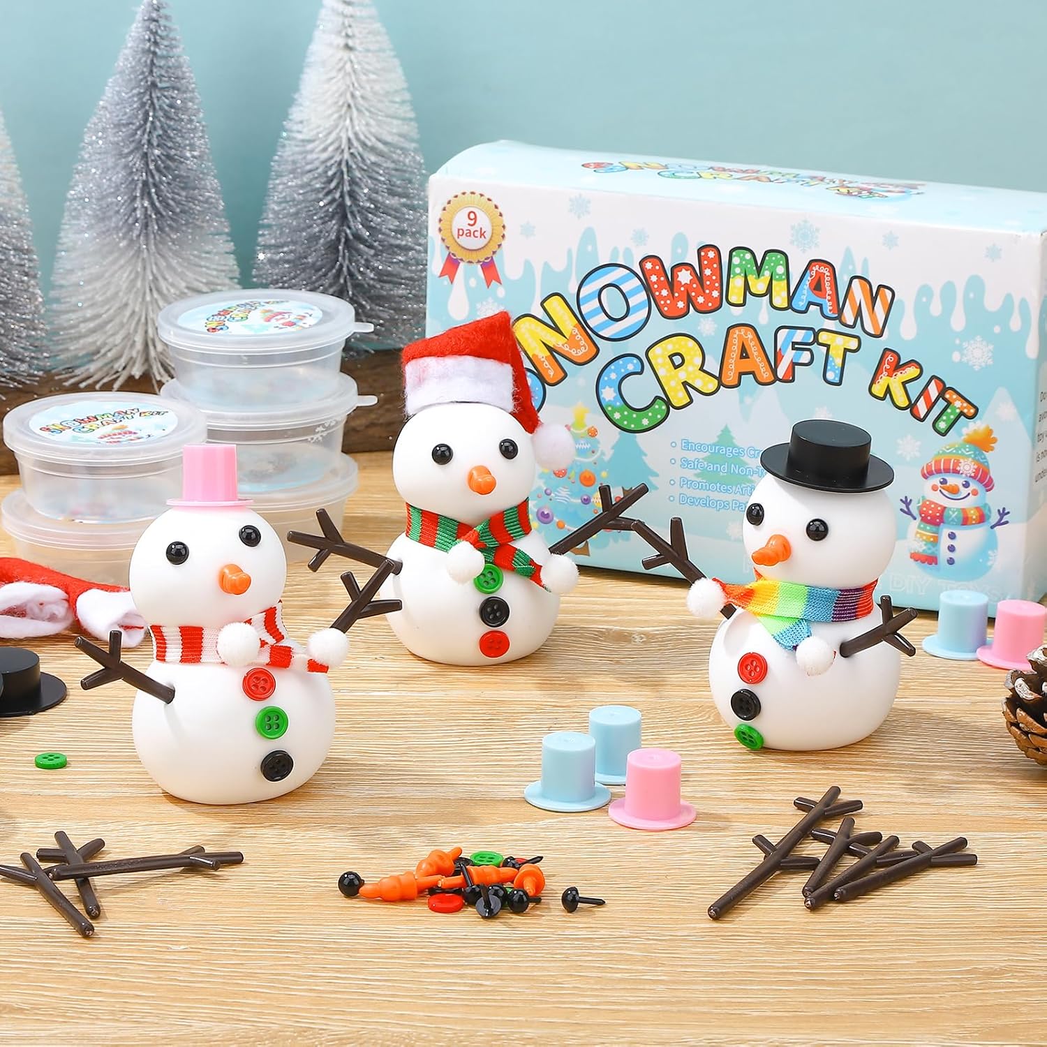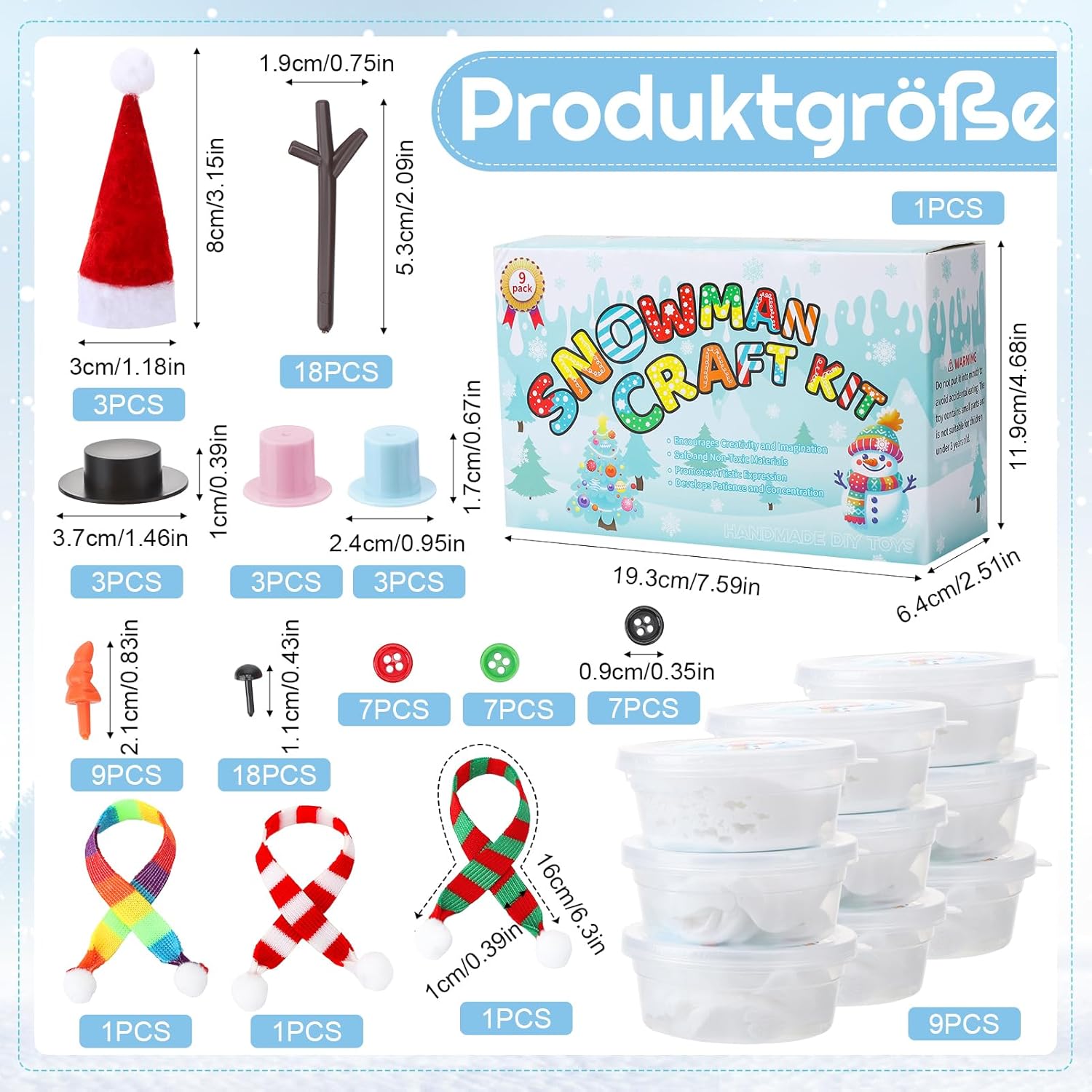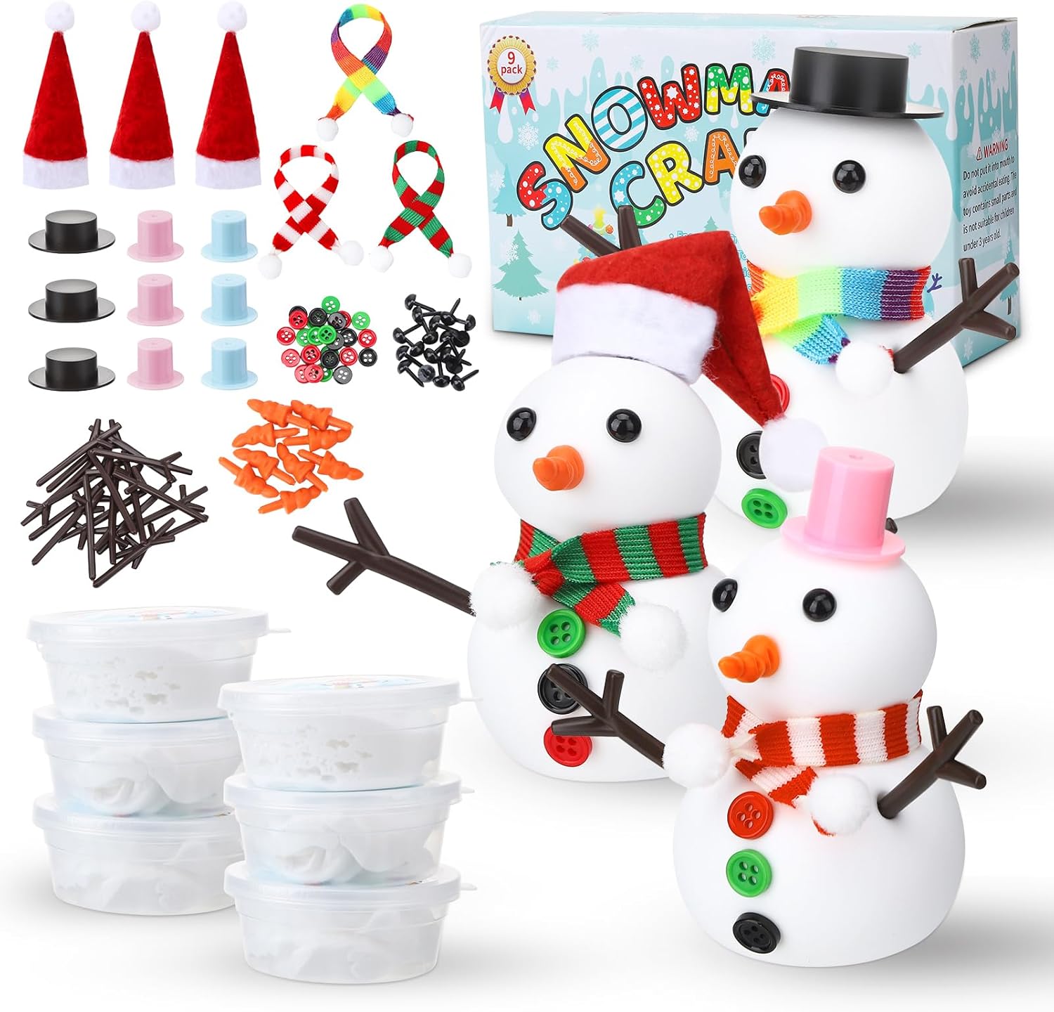 Kit artigianale pupazzo di neve: il nostro set di pupazzo di neve per bambini include tutti i materiali per nove pupazzi di neve: nove pezzi di impasto bianco, nove cappelli colorati, tre sciarpe, 18 occhi, 18 rami, nasi di carota e 27 bottoni. Crea i tuoi pupazzi di neve secondo i tuoi desideri. Adatto per bambini e adulti Materiale morbido: la nostra plastilina per pupazzo di neve è morbida, ultraleggera, non lascia residui, non si attacca ed è sicura per adulti e bambini Artigianato semplice: l'artigianato di pupazzo di neve per bambini e adulti è facile da progettare. Basta modellare il pupazzo di neve in argilla bianca e poi decorarlo con cappelli, sciarpe, bottoni e altri accessori inclusi. Così si crea un simpatico pupazzo di neve [Versatile] Questo set di decorazioni pupazzo di neve è perfetto per creare decorazioni, artigianato, mini bambole, pupazzi di neve, ecc. Portate un'atmosfera suggestiva alla vostra festa e allo stesso tempo promuovete le abilità pratiche, l'immaginazione e la pazienza dei vostri bambini Regalo ideale: i nostri set fatti a mano sono ideali per riempire sacchetti per feste e sono adatti anche come regalo per diverse feste, compleanni e come piccolo pensiero per gli stivali di Babbo Natale. I genitori possono promuovere l'interazione genitore-figlio insieme ai loro figli.