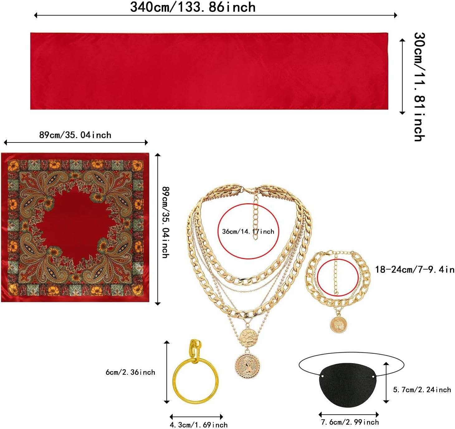 【Uso versatile】: ottimo per feste a tema pirata, eventi cosplay, celebrazioni di Halloween, spettacoli teatrali, feste in maschera, carnevali, compleanni, servizi fotografici e altro ancora 【Set completo di costumi da pirata】: questo set di costumi da pirata include un foulard, una cintura, un braccialetto, una collana, una benda sull'occhio e un orecchino 【Ideale per appassionati di cosplay】: che tu ti stia vestendo per Halloween o partecipando spettacolo a tema, questo set di accessori fornisce un tocco fantastico al tuo ensemble da pirata 【Dimensioni dettagliate】: Cintura 340 cm x 30 cm / 133,86 pollici x 11,81 pollici; Bracciale 18 cm-24 cm / 7,09 pollici - 9,45 pollici; Collana 36 cm / 14,17 pollici; Benda sull'occhio 7,6 cm x 5,7 cm / 2,99 pollici x 2,24 pollici; Orecchino 4,3 cm x 6 cm / 1,69 pollici x 2,36 pollici 【Materiali】: I gioielli sono realizzati con materiali in lega, mentre il foulard e la cintura sono progettati per il comfort e la facilità di utilizzo.