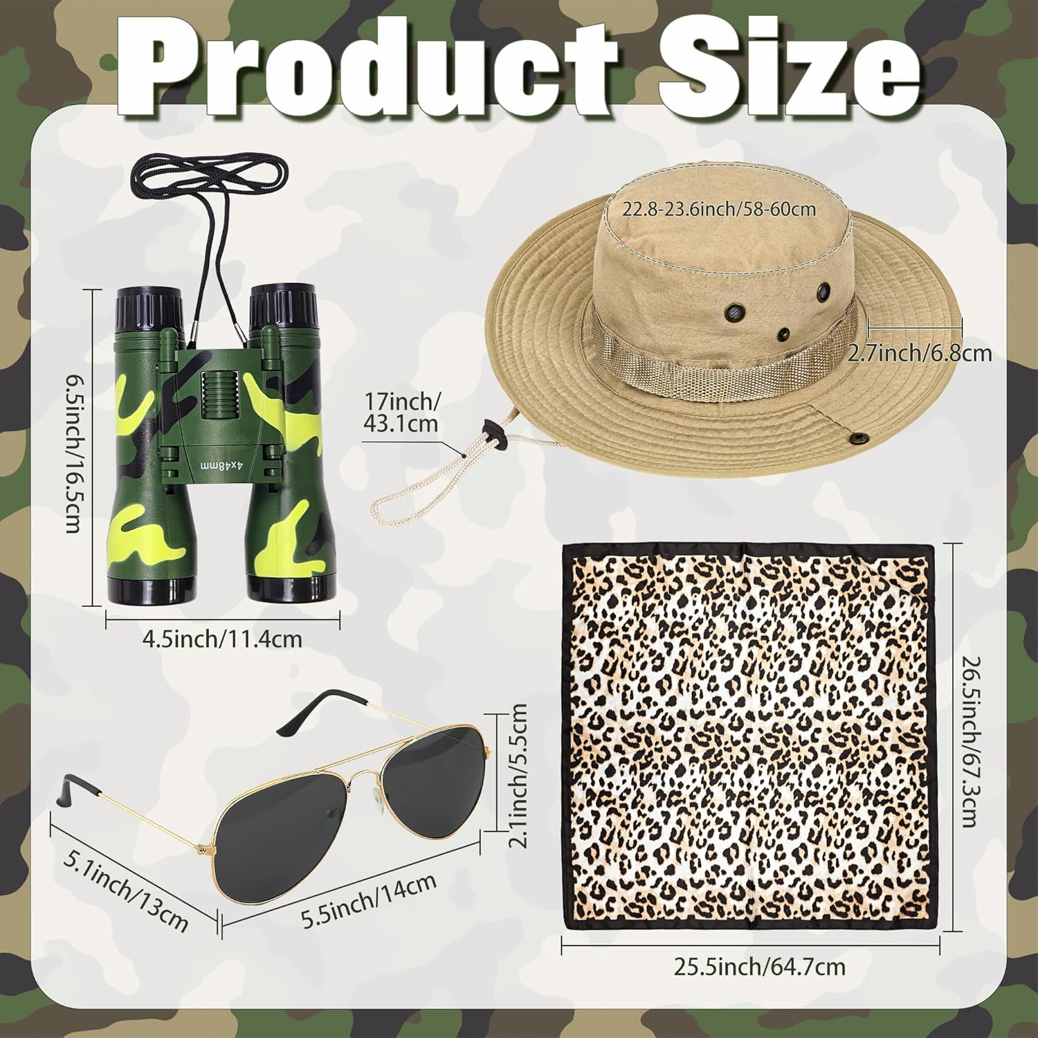 Set di accessori per costume da safari, 4 pezzi, cappello da safari, esploratore e custode dello zoo, con sciarpa leopardata, binocolo verde, per donne