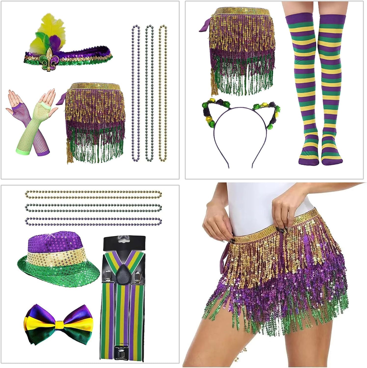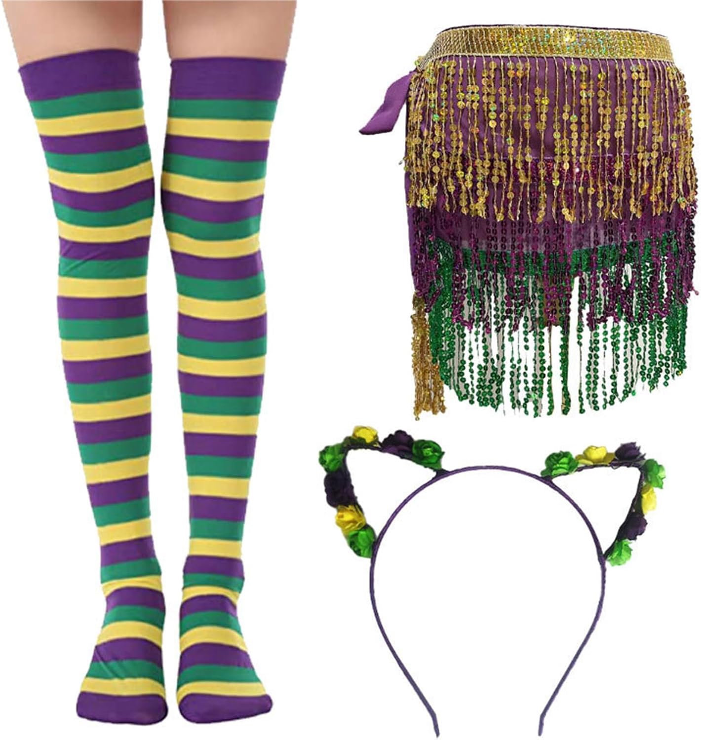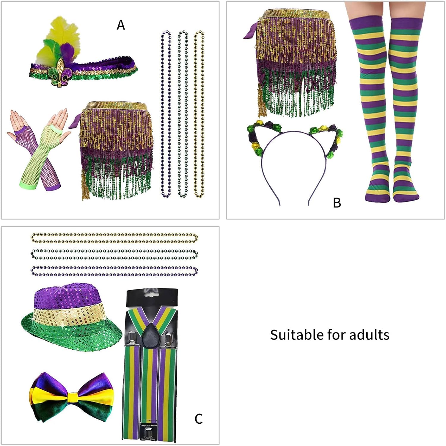 Set di accessori per costume Mardi Gras in poliestere, morbido traspirante, comodo da indossare. Ampia applicazione, il set di costumi da martedì grasso è adatto per feste a tema martedì grasso, festival, feste in maschera, feste vintage, oggetti di scena fotografici, feste in maschera, spettacoli teatrali e così via. Taglia adatta per la maggior parte delle persone, donne e uomini. Pacchetto, fascia, calze a righe coscia alta, guanti a rete, papillon, cappello, nappe, collane con perline mardi gras ect, confezione diversa include diversi, si prega di confermare le vostre esigenze prima di ordinare. Meraviglioso, dolce e caldo per amici, familiari o per te stesso.