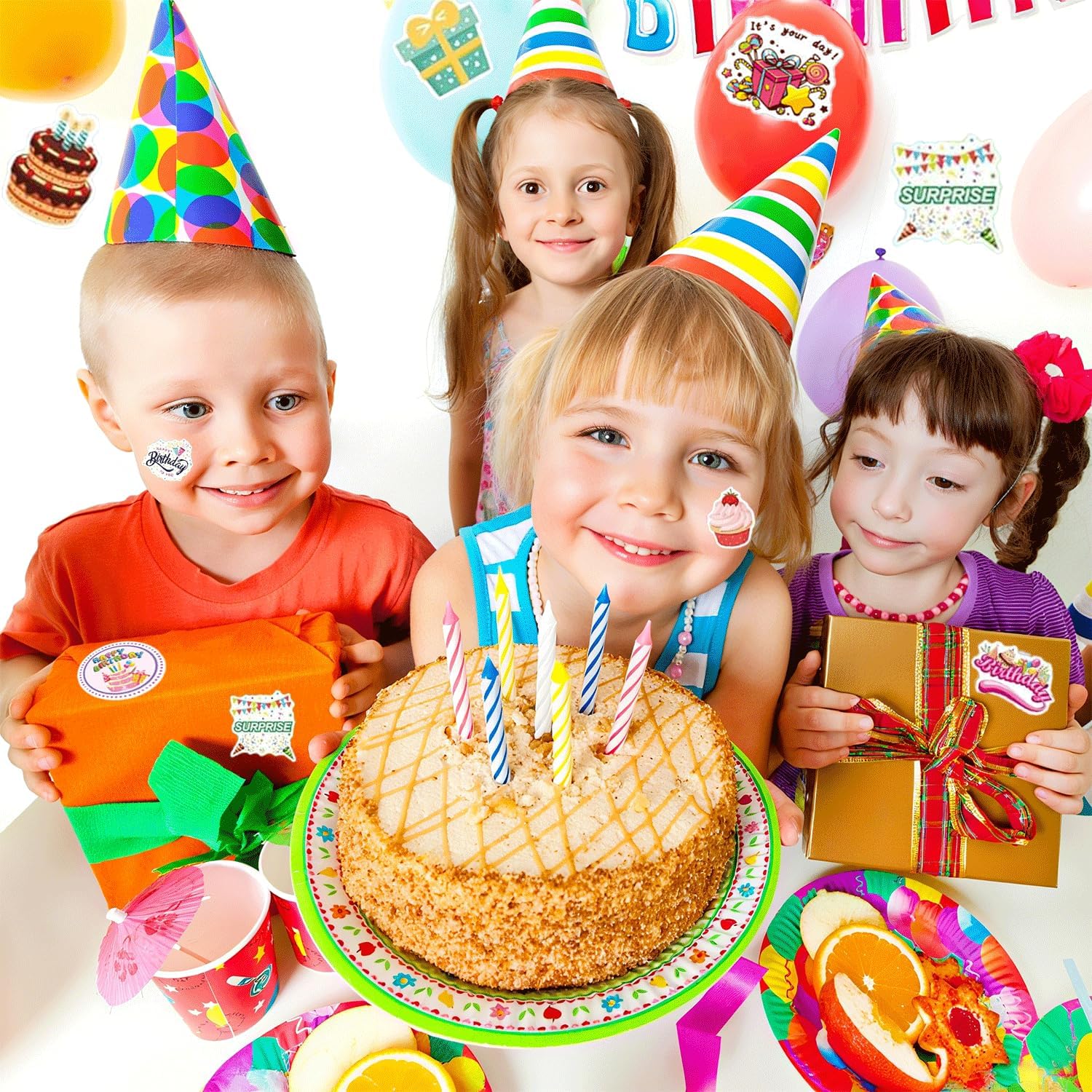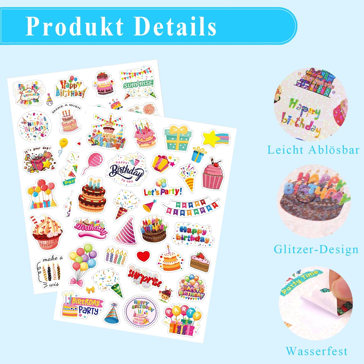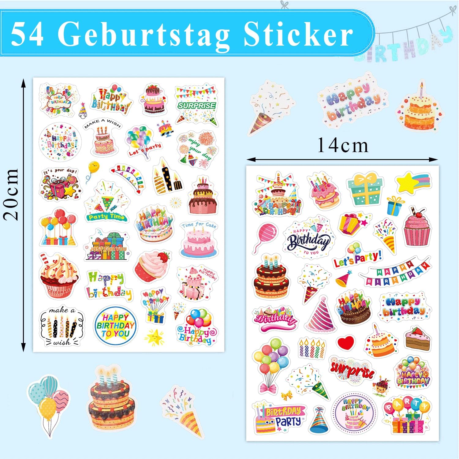 Set di adesivi per compleanno: il nostro set di adesivi contiene 2 adesivi con un totale di 54 motivi. Con auguri di compleanno, torte e altri elementi intorno al tema del compleanno. Diversi modelli e quantità sufficiente per soddisfare le vostre esigenze personali Design fantastico: la superficie dei divertenti adesivi per compleanno è rivestita al laser e lucida, elegante e accattivante. Lo stile ad acquerello rende gli adesivi belli e garantiscono una qualità particolarmente elevata in ogni libro degli ospiti o album Impermeabile e durevole: questi adesivi sono realizzati in materiale PVC, impermeabili, hanno funzioni anti-sbiadimento, anti-pieghe, resistenti all'usura. Comodo da usare, leggero e facile da trasportare, molto sicuro e durevole Facili da usare: questi set di adesivi per compleanno dispongono di un design autoadesivo. Non è necessaria alcuna colla che può aderire a molte superfici diverse. Può essere facilmente rimosso quando non è necessario senza lasciare tracce Versatile: questi adesivi per compleanno sono belli, utilizzati ed è ideale per decorare biglietti di auguri, buste, album fotografici, libri degli ospiti, ecc. Anche per fare regali, puoi regalarlo a familiari, amici o altri che amano il lavoro manuale