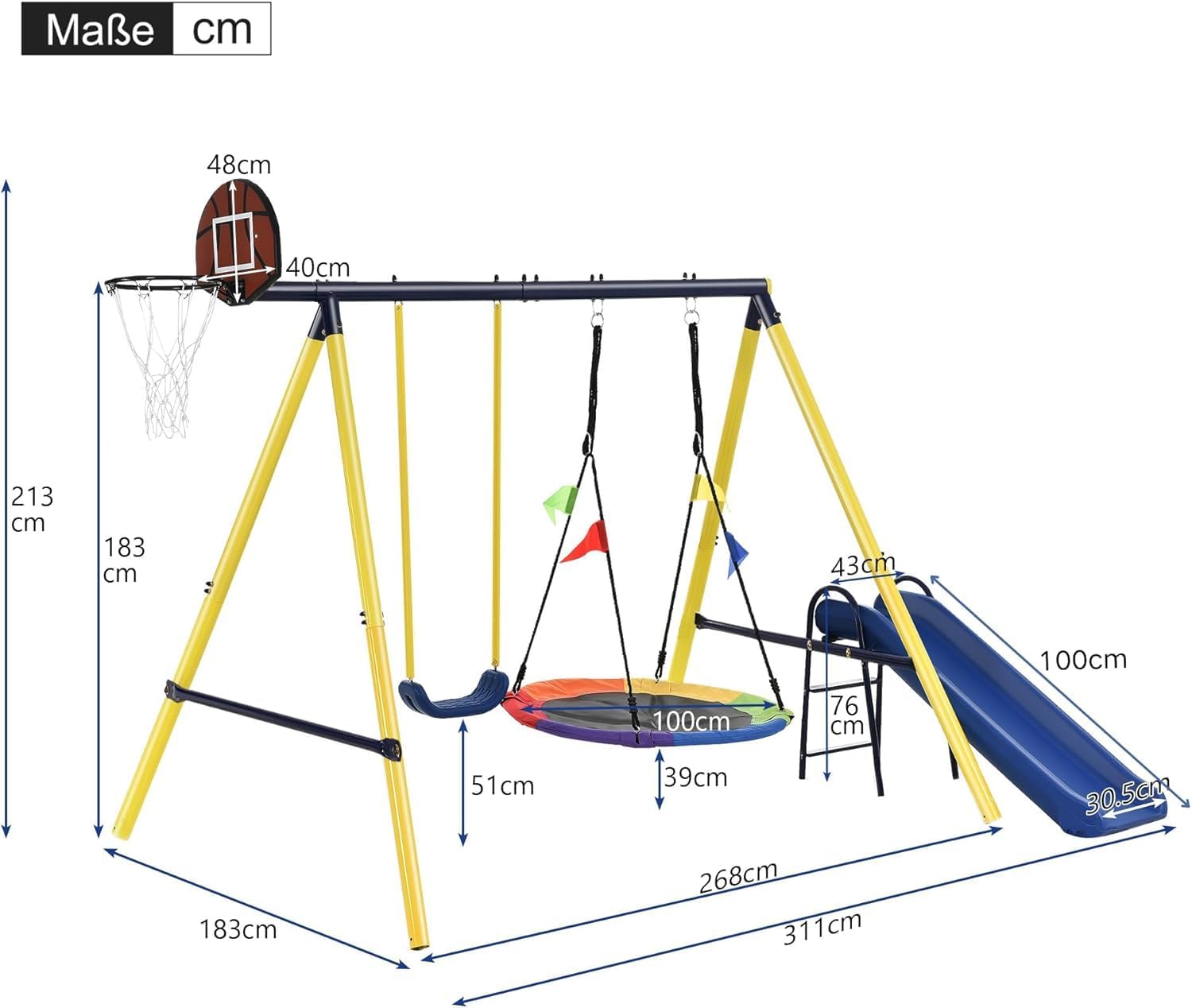 ESPERIENZA DI GIOCO DIVERSIFICATA PER UN DIVERTIMENTO SENZA FINE: questo set di altalene per bambini con struttura in metallo offre una varietà di opzioni di gioco per coinvolgere e divertire i bambini. Include un'altalena ad albero nido, un'altalena singola in plastica, un canestro da basket e uno scivolo, per soddisfare i diversi interessi dei bambini. La combinazione di queste caratteristiche offre un'esperienza di gioco completa, promuovendo l'attività fisica e S E TELAIO IN METALLO RESISTENTE: Costruito con un robusto telaio in metallo, questo set di altalene garantisce stabilità e durata, assicurando un gioco sicuro per i bambini. Il telaio in metallo può resistere ad attività vigorose come saltare, oscillare e giocare. La sua solida struttura fornisce una struttura di gioco affidabile e sicura, consentendo ai genitori di stare tranquilli mentre i loro figli si divertono con le loro attività all'aperto. I materiali di a PERFETTO PER IL GIOCO ALL'APERTO: Progettato per l'uso all'aperto, questo set di altalene è ideale per il posizionamento in giardino. Incoraggia i bambini a trascorrere del tempo all'aria aperta, impegnandosi in attività fisiche che promuovono la loro salute e il loro sviluppo. L'allestimento del parco giochi consente ai bambini di godersi l'aria fresca e il sole mentre partecipano a un gioco divertente e attivo. Questa altalena trasforma qualsiasi cortile in un em DESIGN GIALLO VIBRANTE: l'altalena presenta un design giallo brillante che è allo stesso tempo vivace e attraente per i bambini. La combinazione di colori solari cattura l'attenzione dei bambini e stimola il loro interesse per il gioco. Il colore allegro incoraggia i bambini a esplorare e partecipare alle varie attività offerte dall'altalena. Il design accattivante non solo migliora l'estetica del tuo giardino, ma crea anche un ambiente accogliente e giocoso per i SUI PER BAMBINI DI DIVERSE ETÀ: questa versatile altalena è sui per bambini dai 3 agli 8 anni, il che lo rende un investimento duraturo per la tua famiglia. Il design tiene conto delle esigenze e degli interessi dei bambini nelle diverse fasi dello sviluppo, fornendo uno spazio di gioco sicuro e divertente. Con una capacità di carico di 45 kg, si adatta a varie età e garantisce sicurezza e divertimento a più bambini. Il design inclusivo promuove l'interazione socia