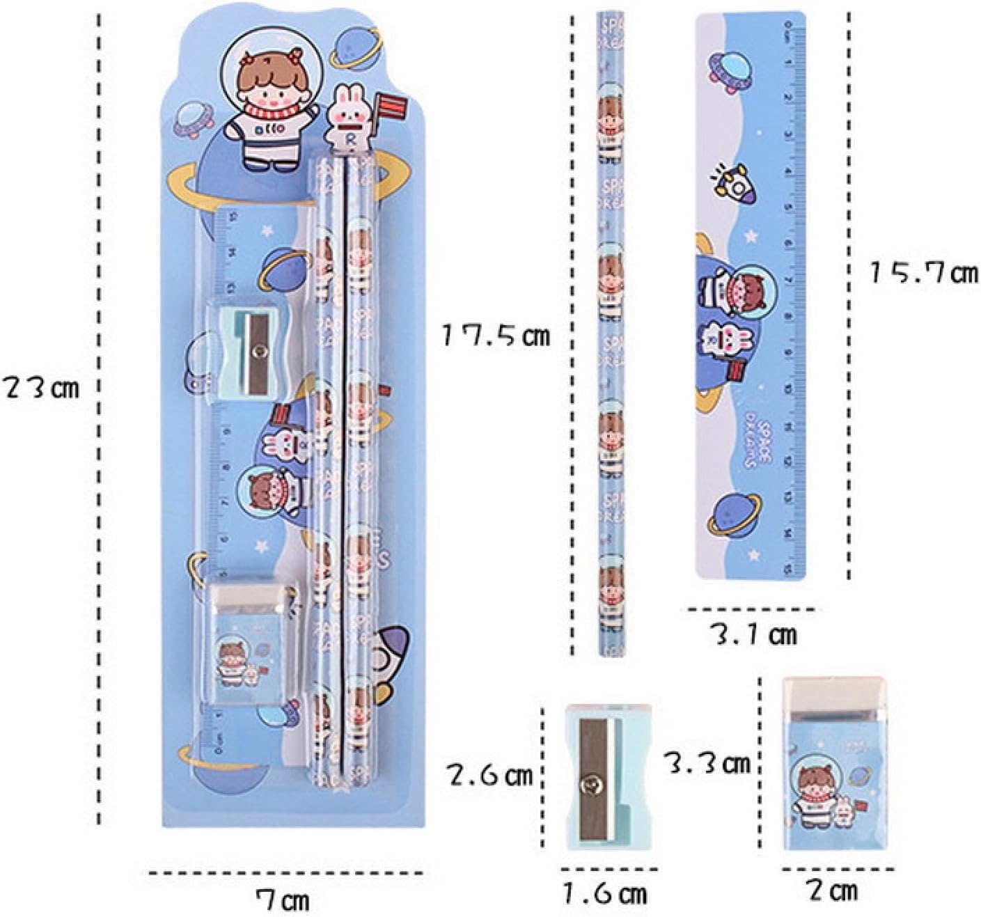 Il prodotto contiene tutti gli strumenti di base che gli studenti devono imparare, come matite, gomme, righelli e temperamatite, eliminando il problema di acquistare separatamente È realizzato con materiali di alta qualità e ha una buona durata e durata. Ad esempio, le matite utilizzano legno e grafite di alta qualità, facili da scrivere e non facili da rompere Design compatto, comodo per gli studenti da trasportare, prendere e utilizzare è anche molto conveniente Il set di cinque pezzi di cancelleria è completamente attrezzato contemporaneamente, il che può migliorare notevolmente l'efficienza di apprendimento degli studenti, in modo che abbiano più tempo per concentrarsi sull'apprendimento, invece di perdere tempo perché non riescono a trovare cancelleria Con un design squisito o immagini di cartoni animati popolari, questo può aumentare l'interesse degli studenti per l'apprendimento, renderli più disposti a usare la cancelleria e rendere questo apprendimento più interessante.