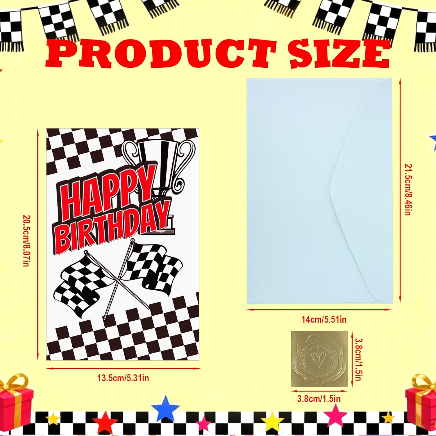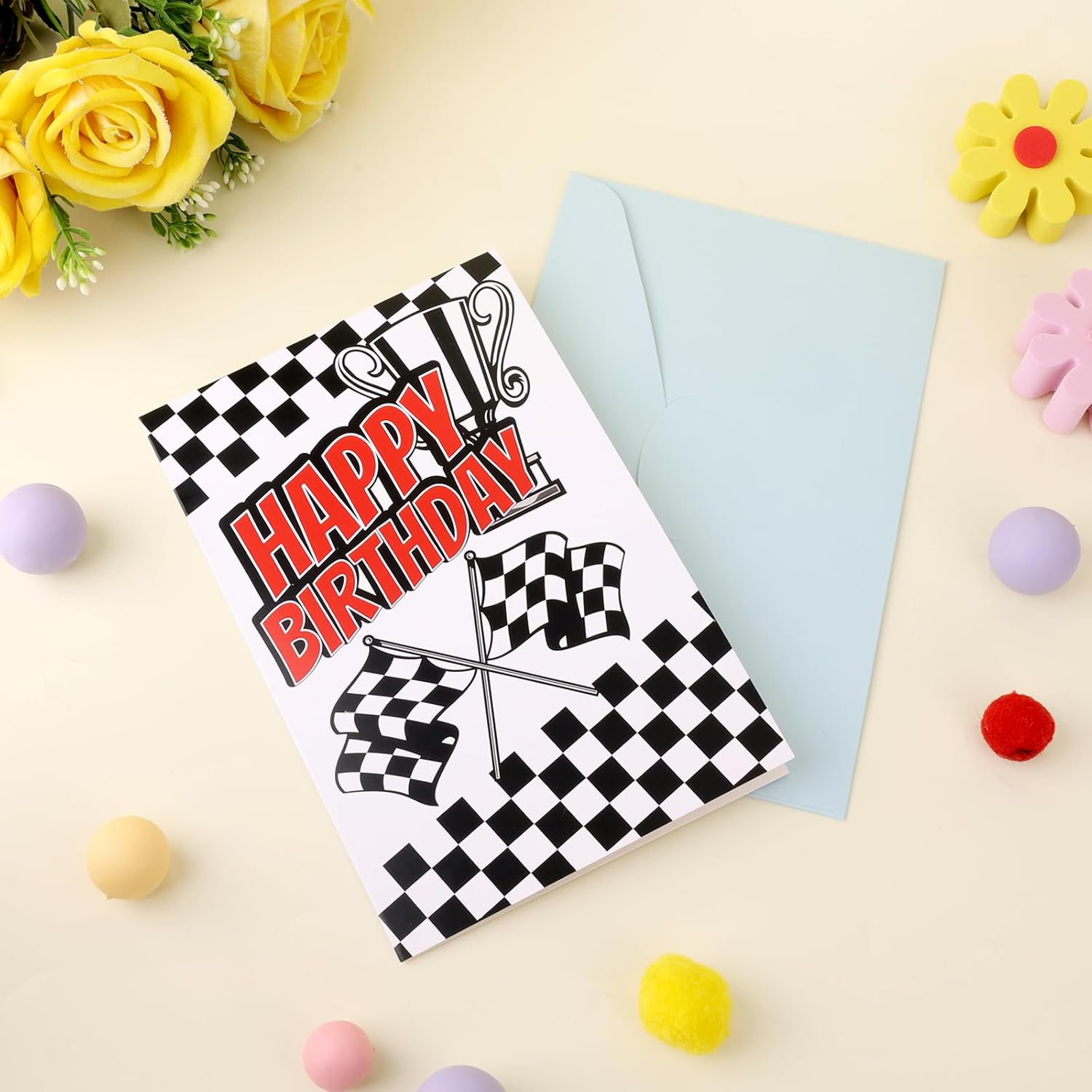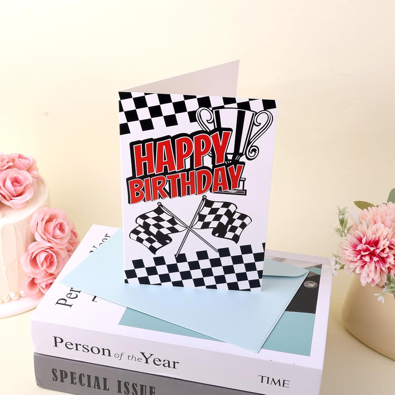 Contenuto della confezione: ogni set include 1 biglietto d'auguri per corse automobilistiche, 1 busta abbinata e 1 adesivo sigillante, soddisfacendo pienamente tutte le esigenze delle benedizioni di compleanno. Materiale eccellente: realizzato in materiale cartaceo di alta qualità, il set di biglietti di auguri di buon compleanno a tema corse è spesso e resistente alle pieghe. Inoltre, la busta abbinata è affidabile e può proteggere i biglietti d'auguri da eventuali danni. Ampia applicazione: progettato appositamente per gli appassionati di corse e i compleanni dei bambini, questo fantastico biglietto d'auguri è adatto per feste per ragazzi, carte regalo o collezioni, esprimendo perfettamente l'amore per la velocità e la passione. Design speciale: ispirato alla cultura delle corse, il biglietto di auguri di compleanno combina elementi a scacchiera in bianco e nero, trofeo a strisce e bandiera a scacchi, creando un'atmosfera dinamica e competitiva che è distinta ma elegante. Facile da usare: design di dimensioni standard (la busta abbinata alla carta Happy Birthday Race misura circa 21,5 x 14 cm), facile da inviare e trasportare, ideale per compleanni, celebrazioni o feste a sorpresa.