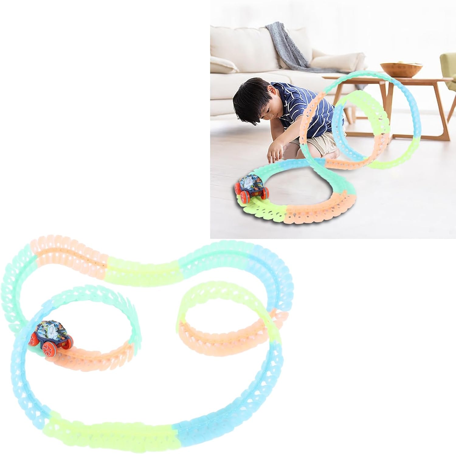 FACILE DA ASSEMBLARE: il set di piste per auto da corsa può essere montato e smontato rapidamente. Basta agganciare i pezzi della pista e creare una pista da corsa completamente personalizzata. GLOW IN THE DARK: il set di piste per auto da corsa è progettato con caratteristiche che si illuminano al buio, aggiungendo un ulteriore livello di eccitazione e divertimento al gioco notturno. PISTE CAMBIABILI: il set di piste per auto da corsa presenta una pista flessibile e modificabile che può essere facilmente piegata, attorcigliata e curvata in diverse forme. SICURO E DUREVOLE: il set di piste per auto da corsa è sicuro e durevole per far giocare i bambini. I bordi e le parti del binario sono stati accuratamente lucidati per garantire un tocco lucido. EDUCATIVO E INTERATTIVO: il set di piste per auto da corsa incoraggia i bambini a usare la loro immaginazione e creatività durante l'assemblaggio delle piste, il che può anche promuovere il gioco interattivo.