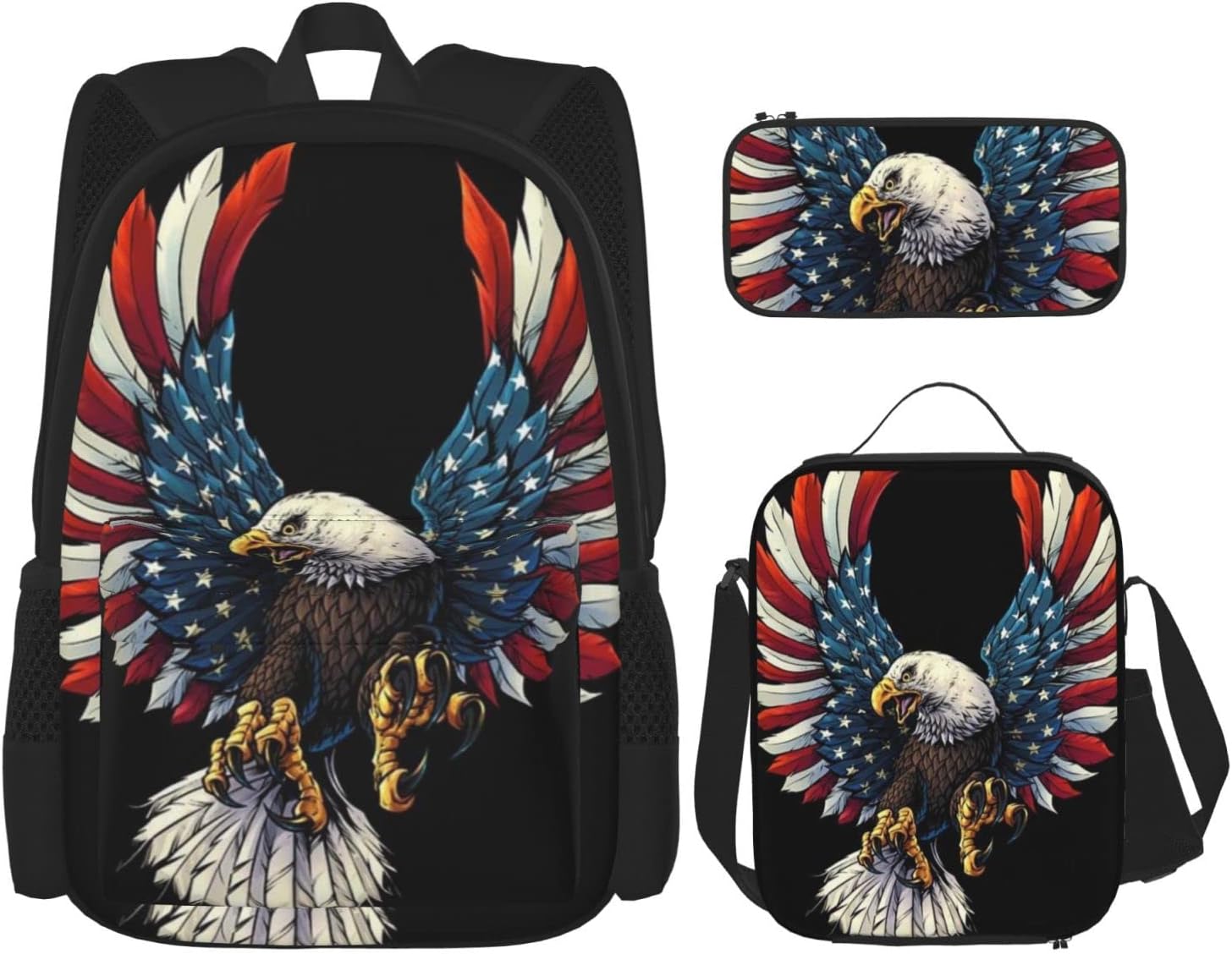 Set di borse per la scuola con aquila calva patriottica con bandiera americana, per ragazze e ragazzi, set di borse per la scuola leggere con pranzo, Colore, 5.0cm*10.5cm*20.5cm, Astuccio