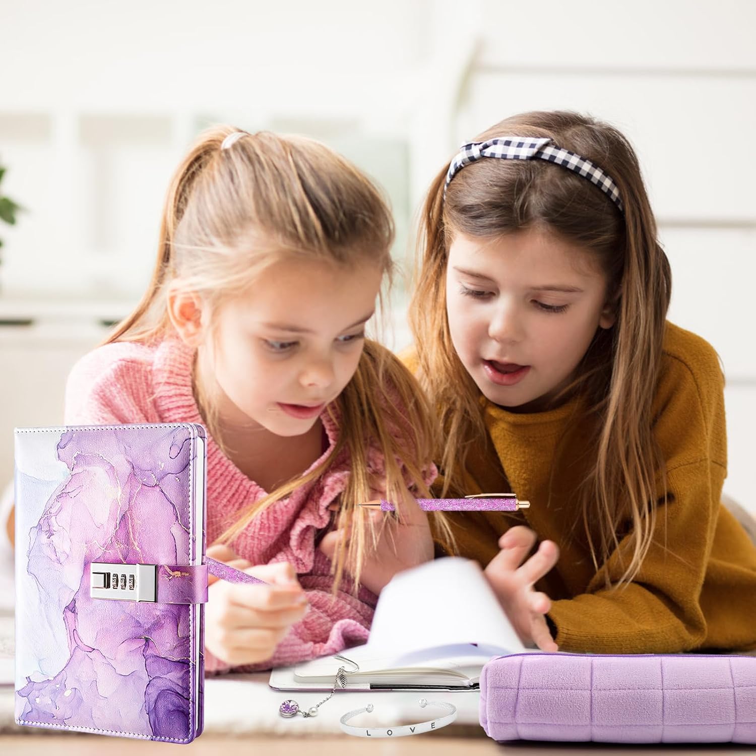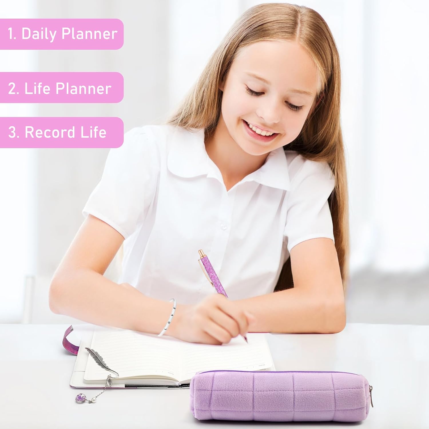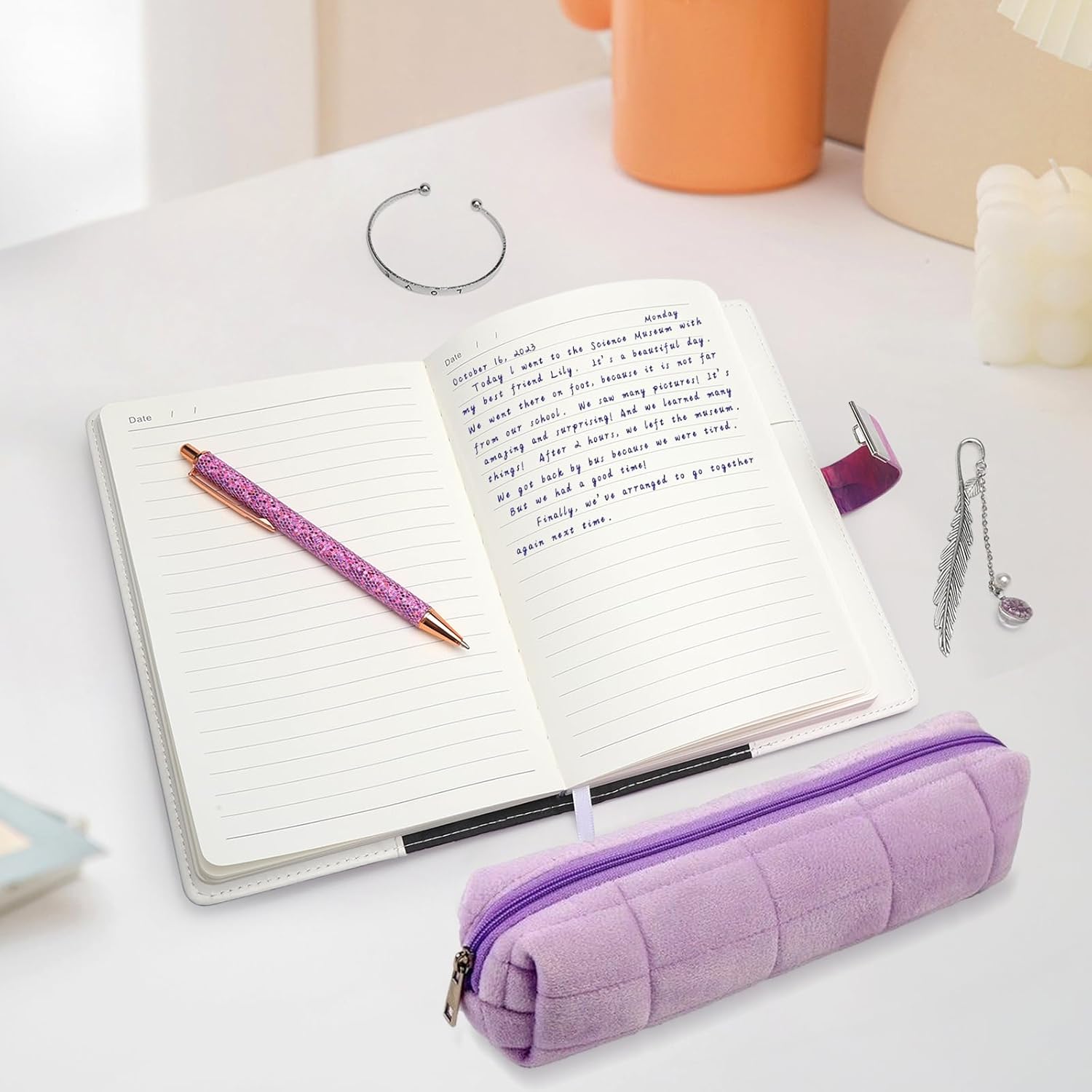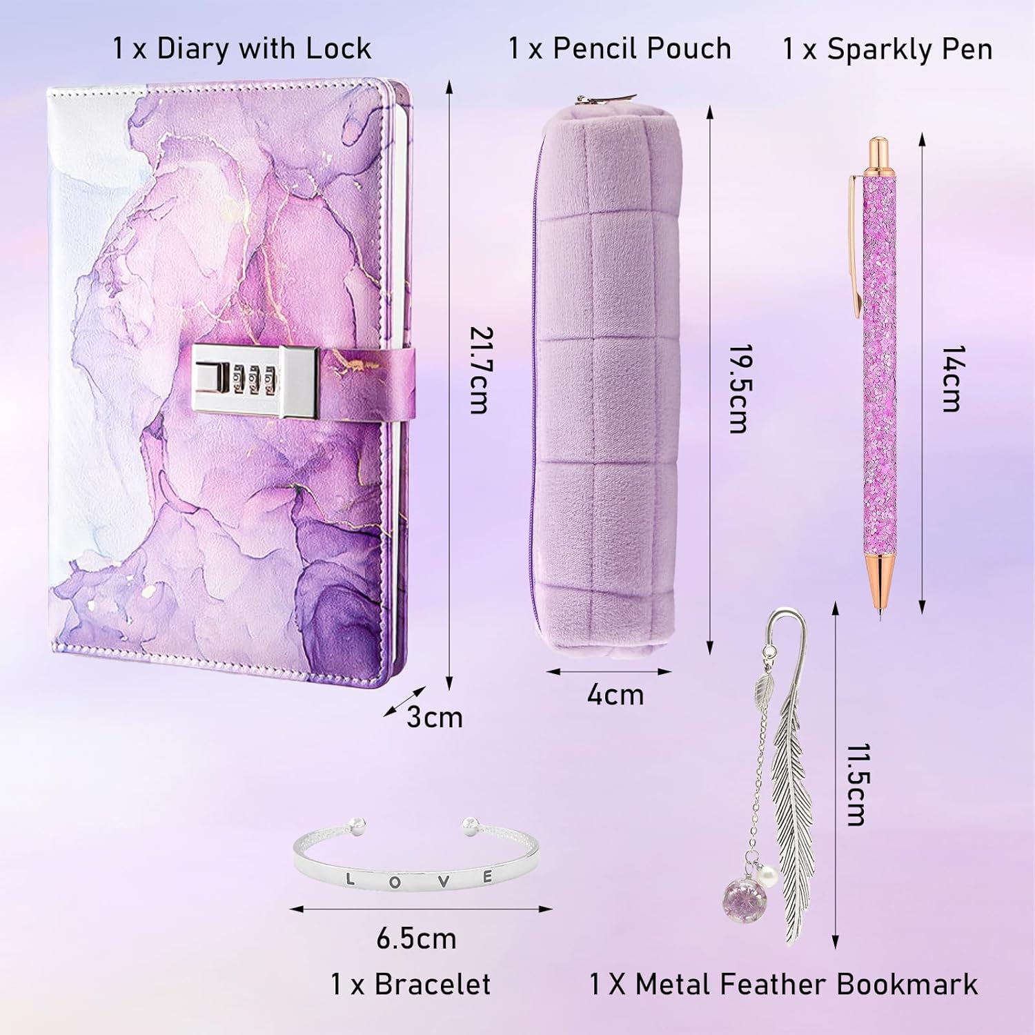 【Materiale Premium】Questo set di cancelleria viola è realizzato con materiali selezionati, la copertina dell'agenda è realizzata in pelle PU premium, la biro è in metallo, il segnalibro e il braccialetto sono realizzati in metallo resistente accuratamente inciso, la scatola di cancelleria a reticolo di diamanti viola è realizzata in tela, la struttura complessiva è elegante e comoda da usare. 【Contenuto del set】Acquistando i nostri prodotti, riceverete un set completo di cancelleria viola, che include 1 agenda con serratura, 1 biro avvolto viola, 1 segnalibro in metallo a forma di piuma, 1 braccialetto in metallo inciso e 1 scatola di cancelleria viola per soddisfare le vostre esigenze di scrittura e decorazione. 【Design elegante】Il set di cancelleria ha un design elegante con il viola come colore principale, il diario ha una serratura per una maggiore privacy, il metallo delle biro e del segnalibro aggiungono un tocco moderno e il look viola della scatola di cancelleria è in armonia con lo stile generale. 【Set multifunzionale】Questo set di cancelleria non include solo pratici strumenti di scrittura, ma anche un braccialetto decorativo in metallo che può essere utilizzato come accessorio alla moda, la scatola di cancelleria è comoda per organizzare e trasportare tutti gli articoli di cancelleria, il che la rende un pratico assistente per lo studio e il lavoro. 【Regalo perfetto】Il set di cancelleria viola è adatto per le ragazze di età superiore ai 7 anni, sia come materiale scolastico, regalo di ingresso a scuola, regalo di vacanza o regalo di compleanno, è un regalo ideale che può soddisfare studenti, amanti della cancelleria o persone che perseguono la qualità della vita.